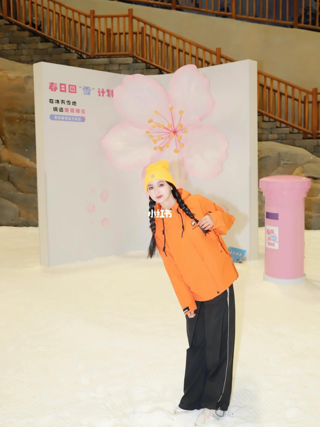 粉色的樱花在冰雪的映衬下,浪漫得不像话,旁边的樱花书也好有特色