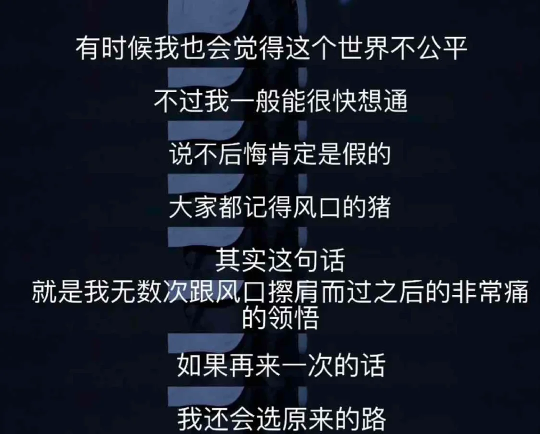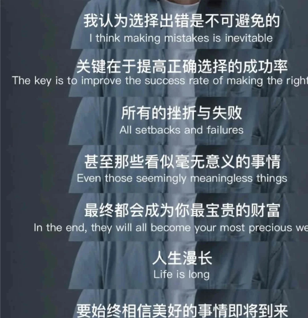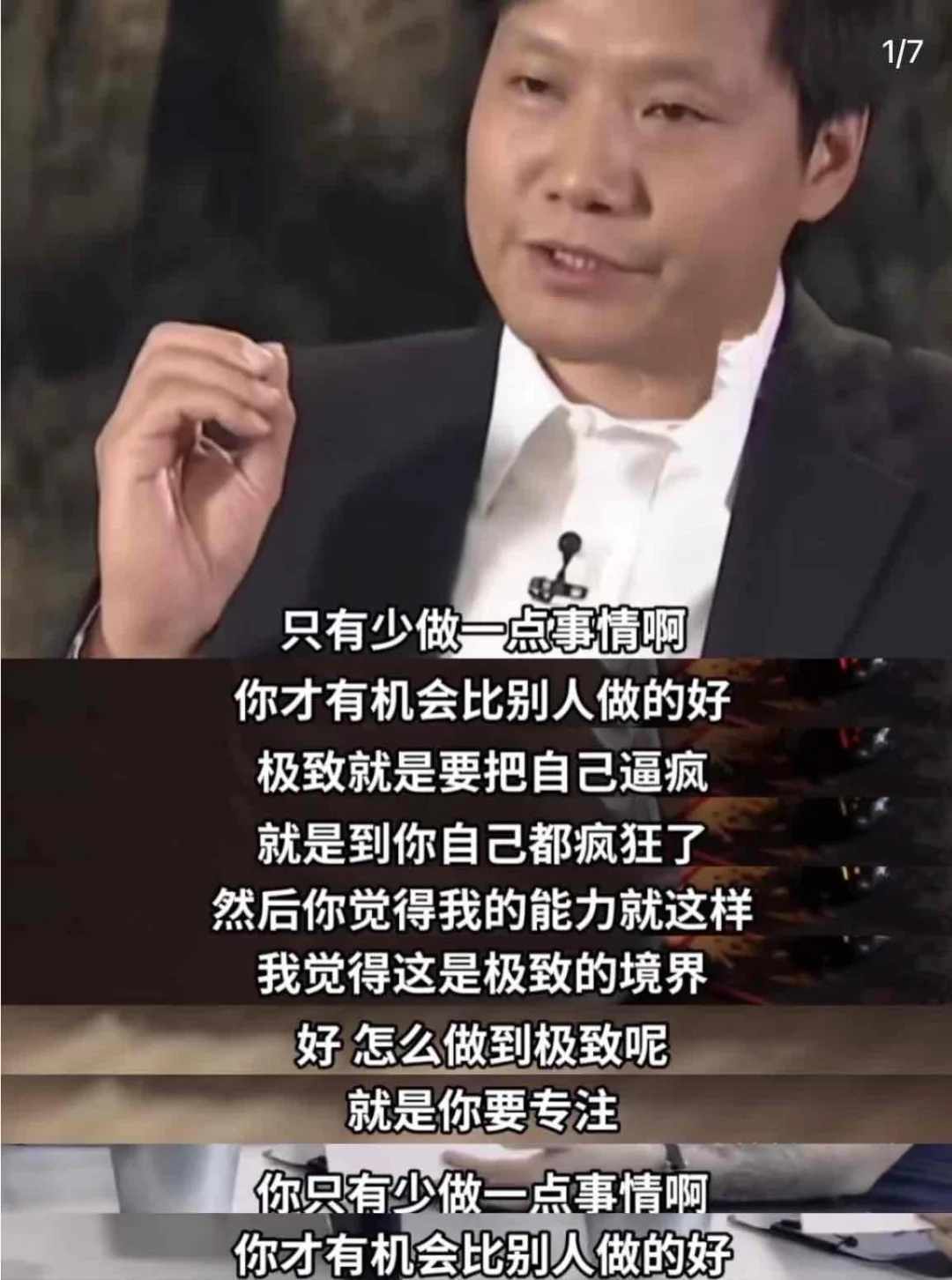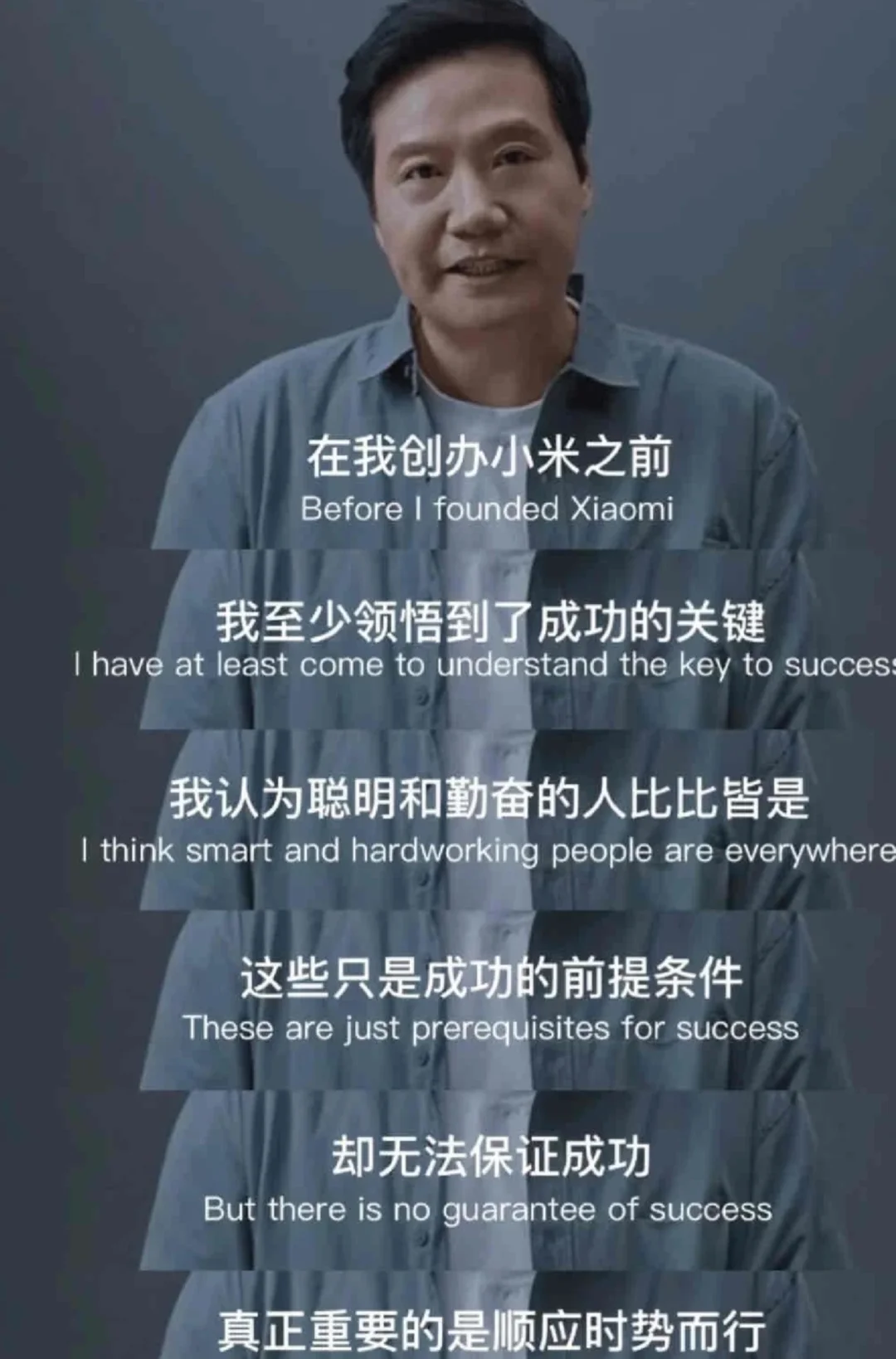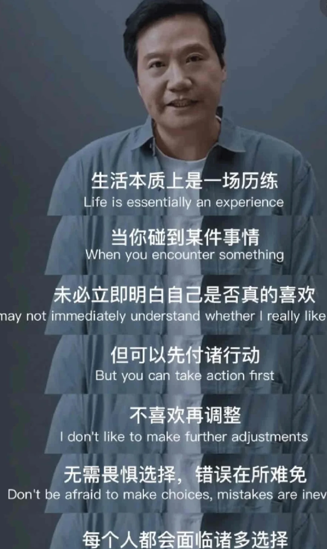 雷军: 🙃我经常失眠,到40岁我才明白,努力不是万能的,重要的是顺势而为。 🙃小米汽车就是要在尊重行业规律的前提下去创新;我喜欢折腾,很害怕一成不变的人生。 🙃生活本质是一场历练,所以挫折都可以成为你的财富。永远相信美好的事情即将发生。 ———————🎄 看雷军的采访,发现他总是讲到的人生方法,跟战术经典《孙子兵法》异曲同工呢,忍不住小小分享下: . [一R]先去全力体验人生 雷军说:“人生不要太多的勉强,做自己喜欢做的事情可能就是好选择。”体验了才会知道喜欢什么,适合做什么,不要害怕尝试。 《孙子兵法》的核心思想是先胜后战!选择人生方向也是一样,因为喜欢,开局已经赢了一大半,剩下的只需要清楚3点,一风险,二代价,三利益,这叫谋定而后动。 . [二R]再守正出奇 做事要先把基础的事做好,不要着急颠覆、出奇制胜。 《华杉讲透孙子兵法》里说守正出奇,两军对阵,先以正合,正兵合战,等到关键的时刻,再投入预备队——奇兵—决胜,先以正合,后以奇胜。 . [三R]顺势而为,别硬拼! 雷军强调顺势而为,遇到风口,猪都能飞起来。 顺势很重要! 《孙子兵法》里说顺应天时地利,一件事,有时机才干得成,时机不对就不能干! . [四R]拼搏时,以过为直,以患为利,及时止损 经历啥就处理啥,不要慌,塞翁失马焉知非福! 《孙子兵法》中有一条“以迁为直,以患为利 ”,华杉老师解释说,两点之间,因为有地形和敌情,表面上迂回的弯路,实际上是便利的直路,在战术上方便易守难攻。 . . 💁 雷军很强,国学经典里更是超多宝藏。希望大家都能从大佬的人生智慧中有所收获,找到自己人生的方向~ . 人生很长,永远相信美好的事情即将发生! smart is new sexy! 人生的意义 不焦虑不内耗 人生只活一次 思考人生 人生 雷军小米 强大的内核 奋斗的意义 自我提升与成长 ———————— 🚴🏻 [萌萌哒R]欢迎关注,这里会: [一R]日更闪光金句/经典书摘 [二R]来这世间一趟,要看看太阳呀 [三R]适度思考,链接现实,好好开干! 思想的力量