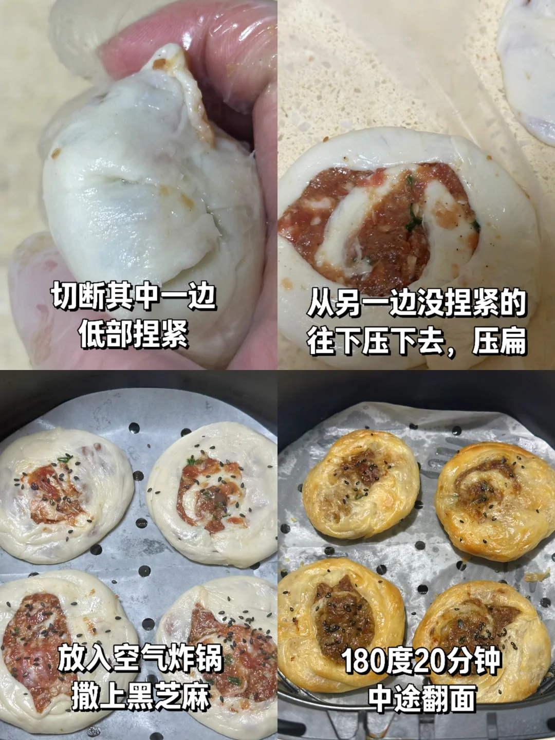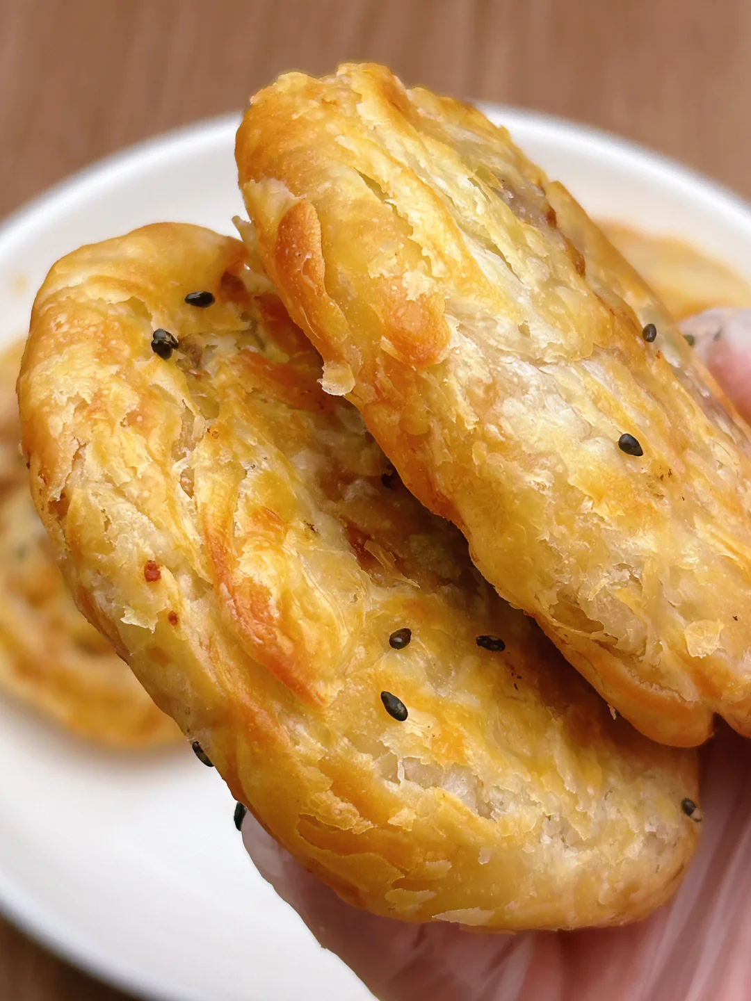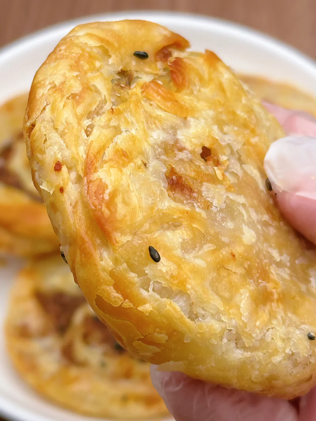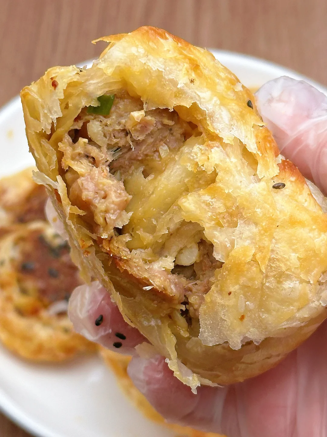 姐妹们,放假一定要试试这个鲜肉锅盔,咬一口酥脆掉渣,不用揉面、擀面,有手抓饼就可以做~做法也超级简单,又酥又脆,薄薄的肉馅混合淡淡的葱花香,刚出炉小朋友一口气吃了3个,酥到掉渣~ 做法简单,想失败都难!姐妹们快去试试吧~ 食材:猪肉、手抓饼、葱花、虾皮(也可以不放) 做法 1️⃣ 猪肉剁馅,放入葱花、虾皮淋上热油 2️⃣加入2勺生抽、半勺蚝油、少许白胡椒粉、少许孜然粉、几滴香油拌匀 3️⃣手抓饼上分别放入适量的肉末铺平(肉不要太厚)从边缘卷起来,用刀切3-4段(我是3段) 4️⃣切段其中一头底部捏紧,从另外没捏紧的一头,向下压扁 5️⃣放入炸锅中180度20分钟,中途翻面即可好吃又简单的鲜肉锅盔就做好了,一学就会!咬上一口,酥脆掉渣,完全是懒人福音,赶快行动起来吧~