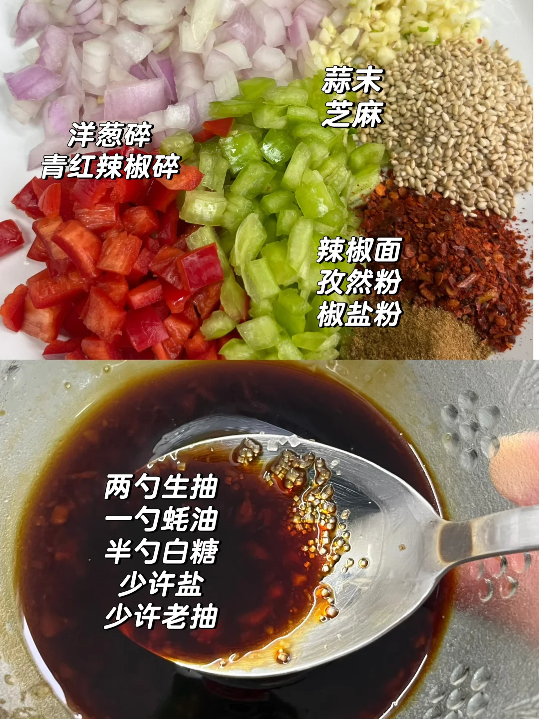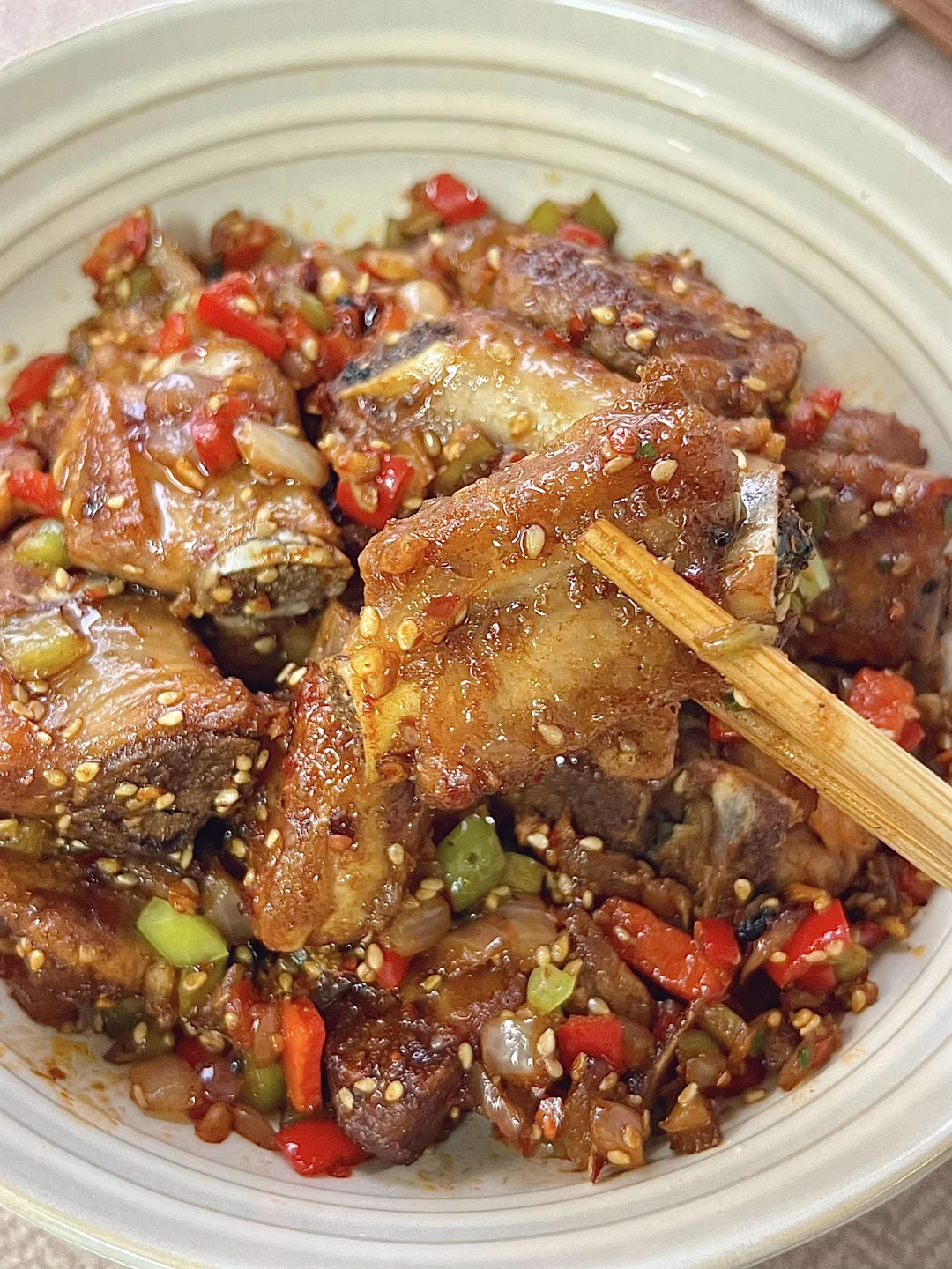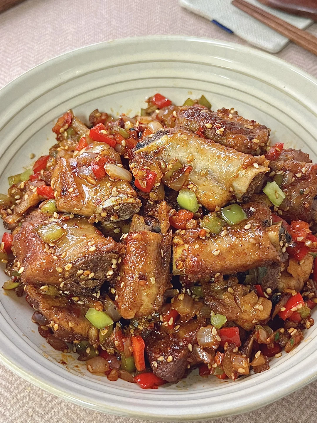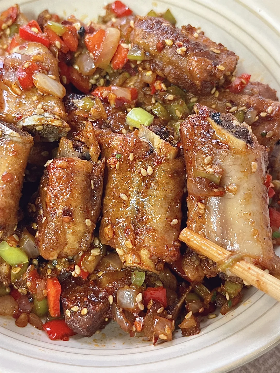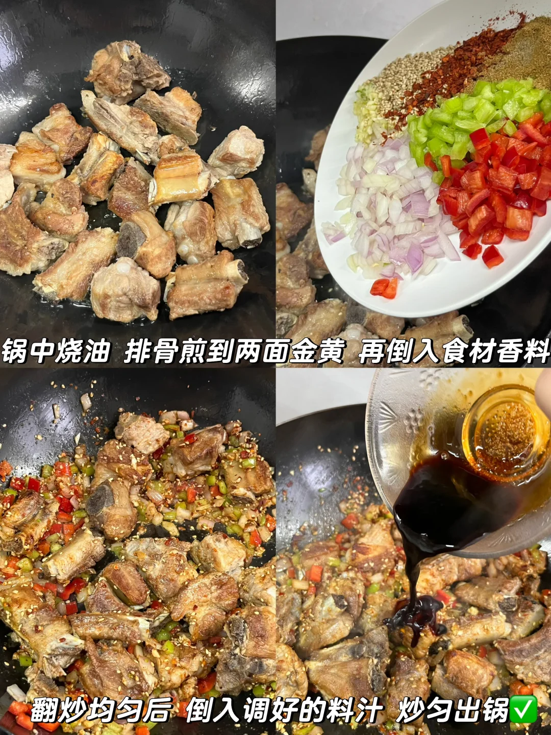 附做法: 1️⃣排骨冷水下锅,放葱姜、料酒焯水,煮开后撇去浮沫;开小火炖煮40分钟,捞出控干水分备用 2️⃣准备洋葱碎、青红辣椒碎、蒜末、芝麻、辣椒面、孜然粉、椒盐粉 3️⃣调料汁:两勺生抽、一勺蚝油、半勺白糖、少许盐、少许老抽 4️⃣锅中烧油,排骨煎至两面金黄,倒入食材和香料翻炒,再倒入料汁翻炒均匀✅ -