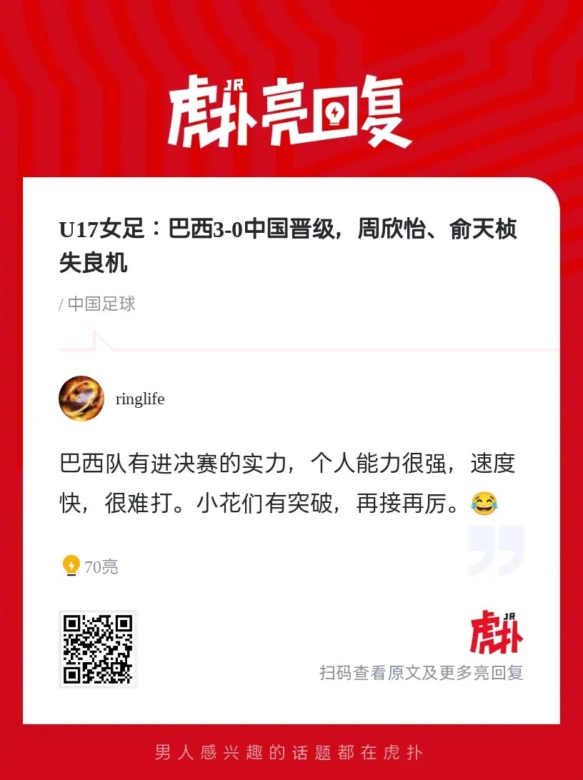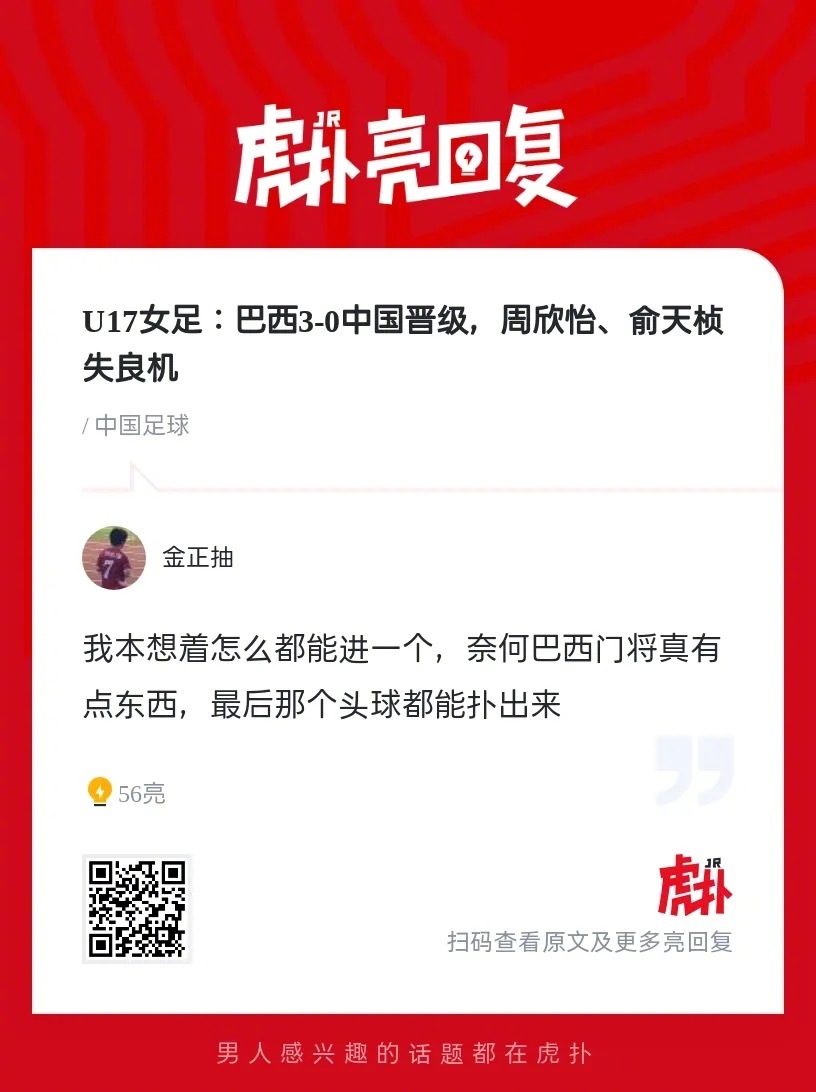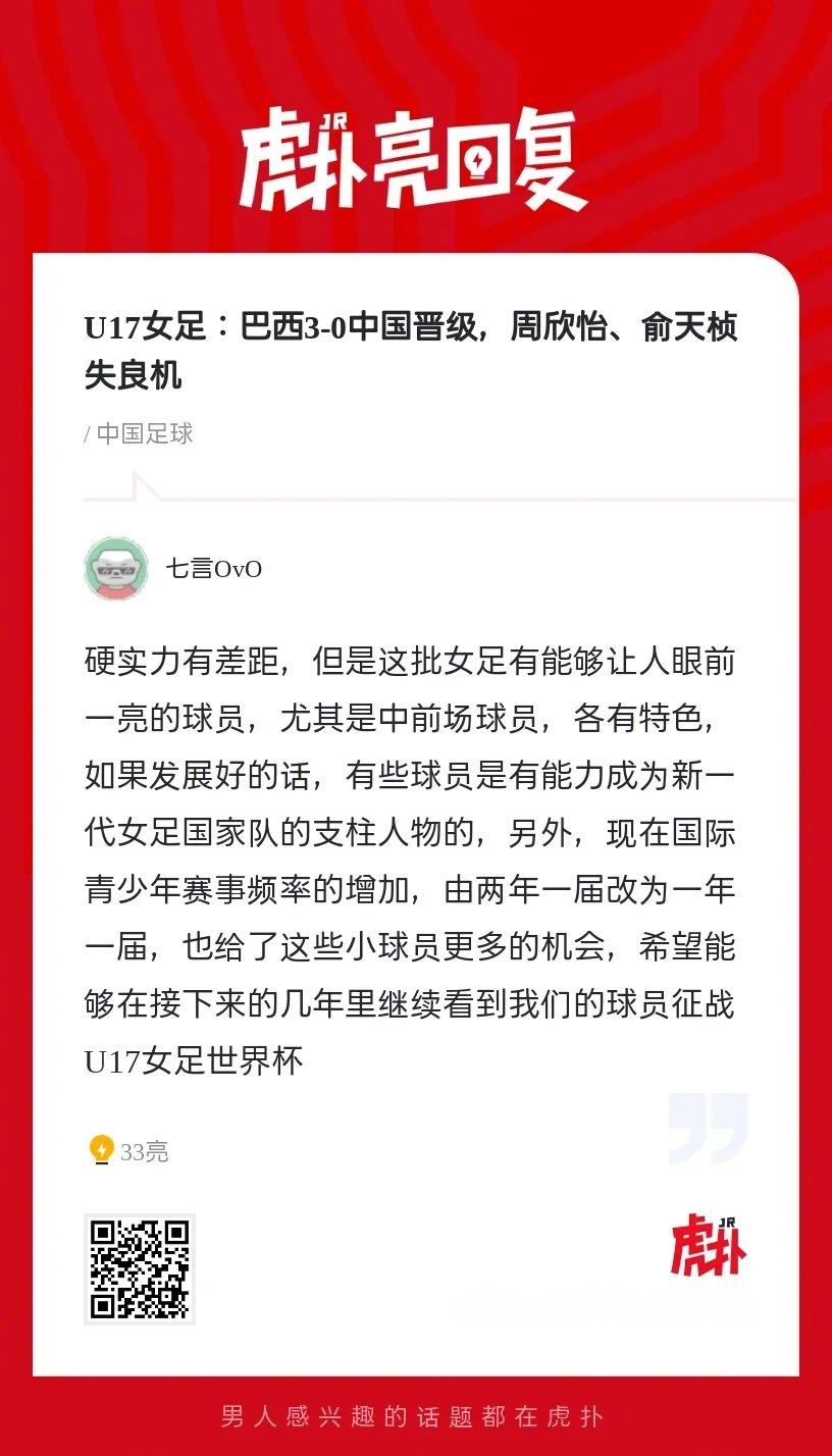 【U17巴西女足3比0中国女足U17,周欣怡、俞天桢失良机】上半场凯兰破门为巴西取得领先,随后陈钰荧伤退张克璨上场,周欣怡屡遭险均被门将化解。下半场埃夫林世界波破门,伊塞佩头球破门扩大比分。