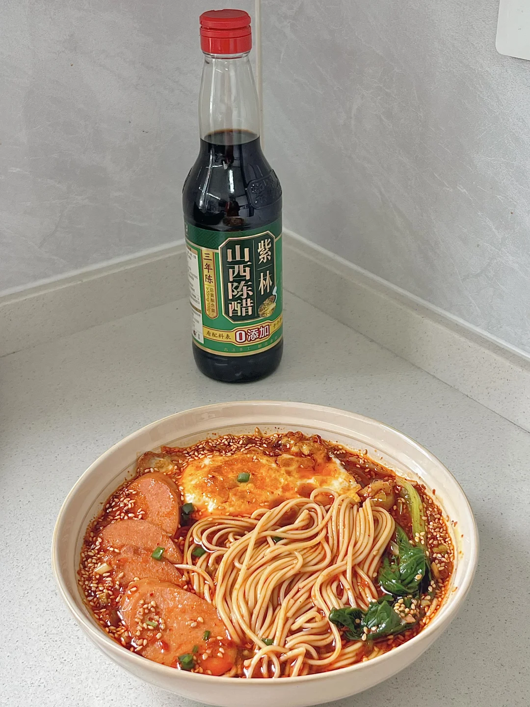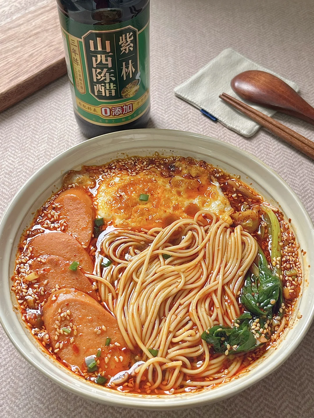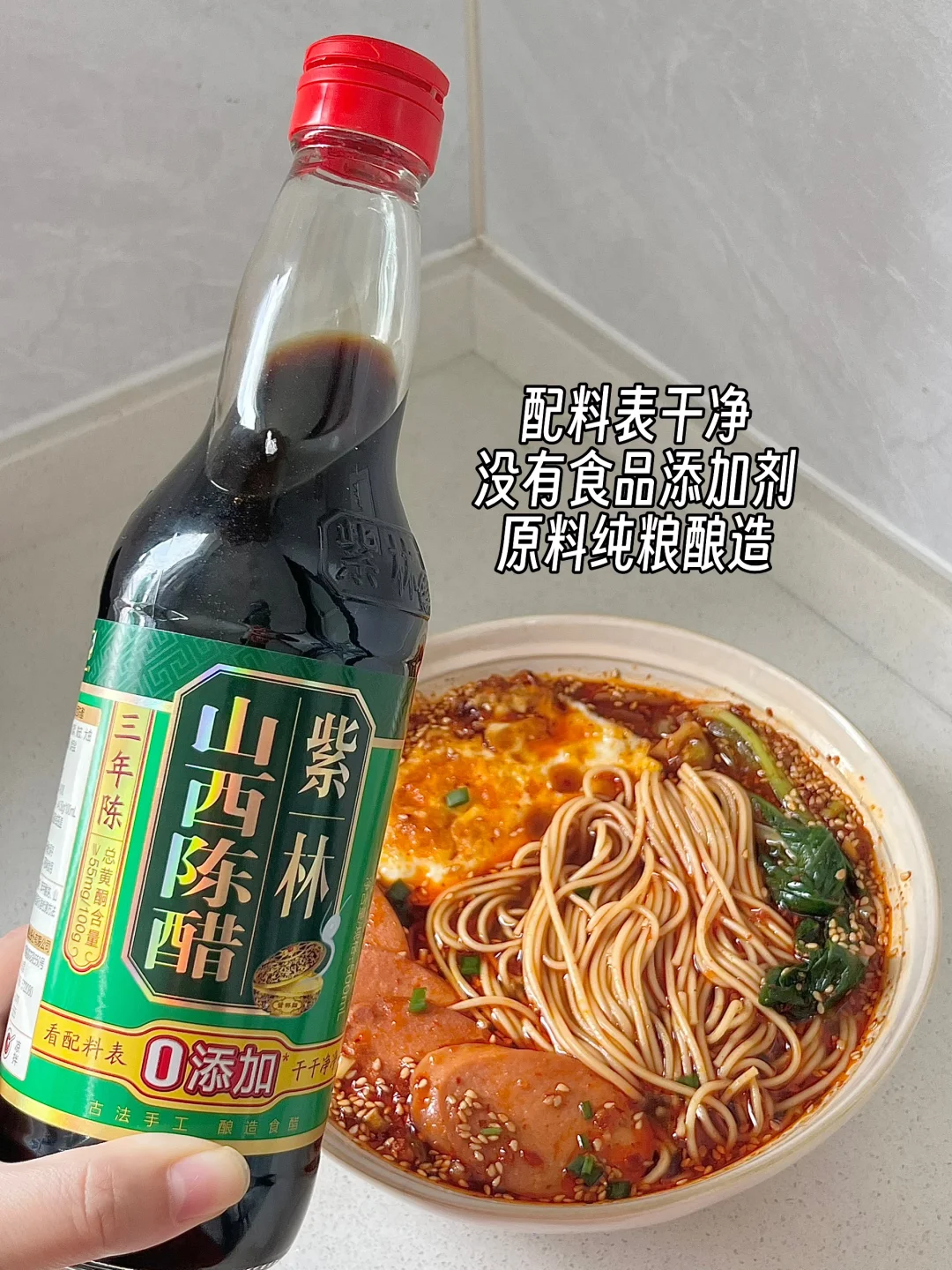 附做法: 1️⃣锅中烧油,煎鸡蛋和火腿肠盛出备用;碗中放入葱末、蒜末、芝麻、辣椒面,淋入热油; 2️⃣再放两勺生抽、两勺陈醋、少许盐、白糖、胡椒粉、榨菜、花椒油 3️⃣煮面和青菜,面汤盛入料碗中,再盛面条和青菜,放煎蛋和火腿肠,撒葱花✅ - 酸酸辣辣的酸汤面做好了🤤来一碗汤都能喝完🌶️这次用到的陈醋是紫林山西陈醋❗️3年陈酿4.5度的酸度棉柔适中,口感有股清香,适合南北方人的口味😌平时煮面、做菜的时候放一点,味道一下就提起来了❗️ -