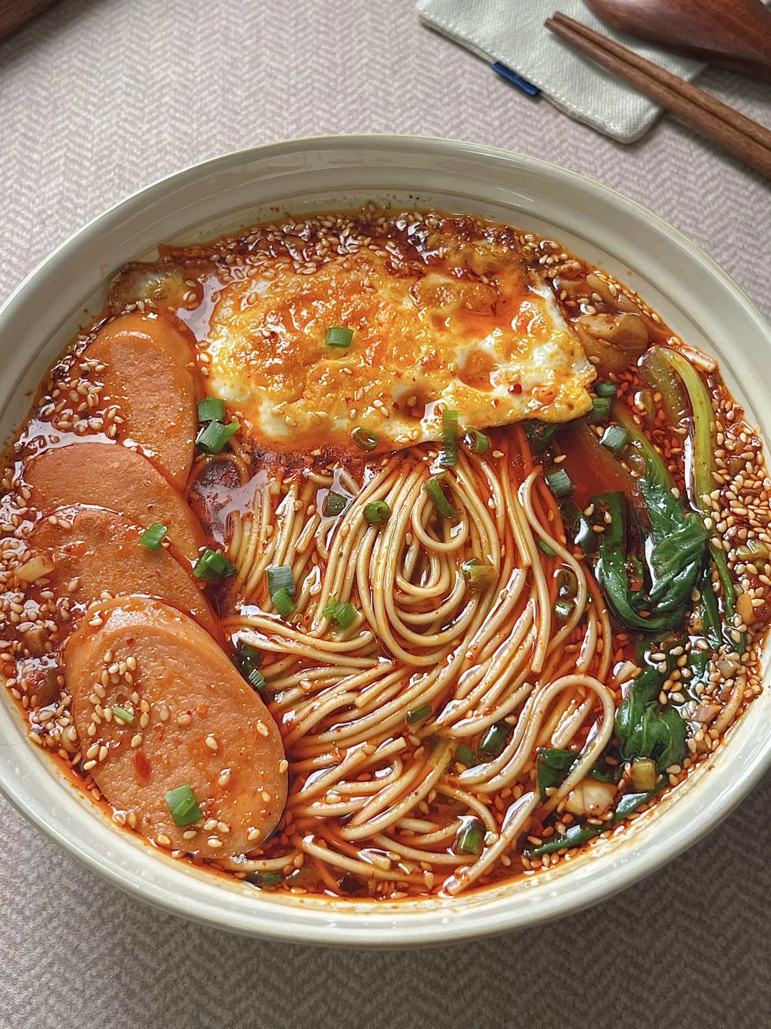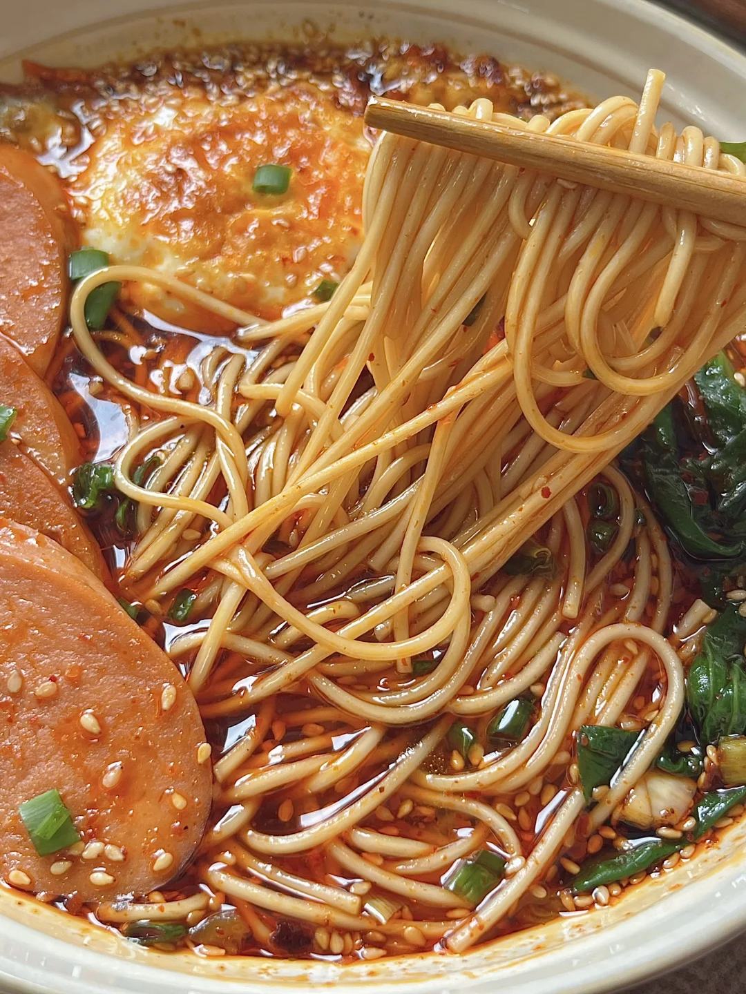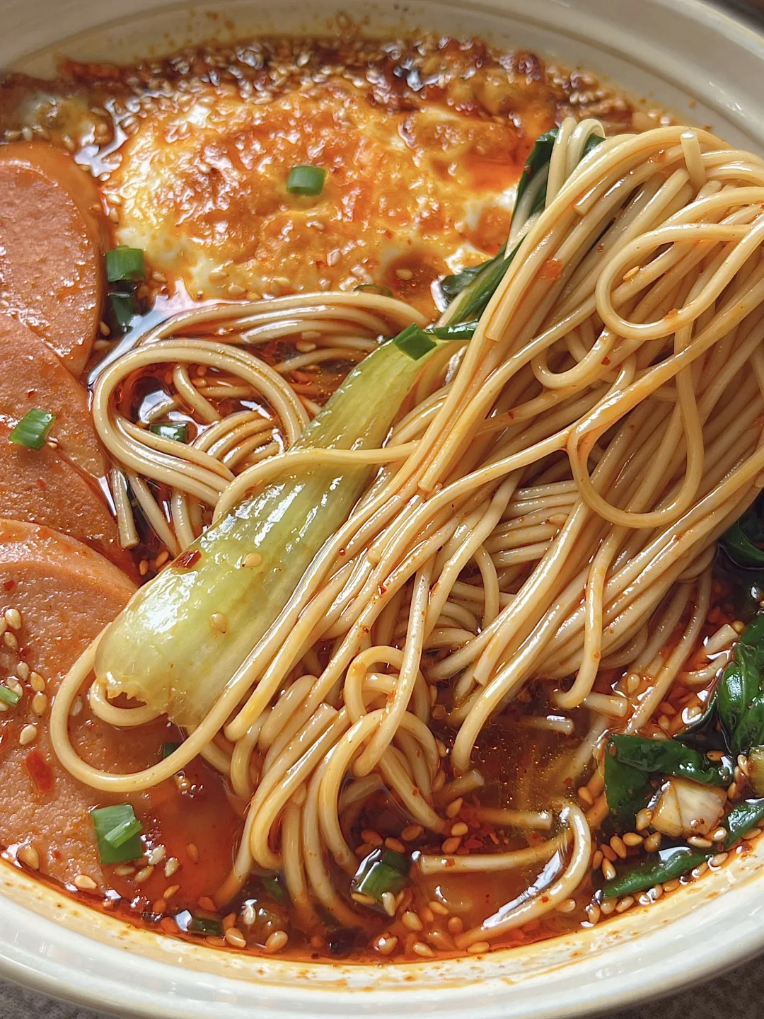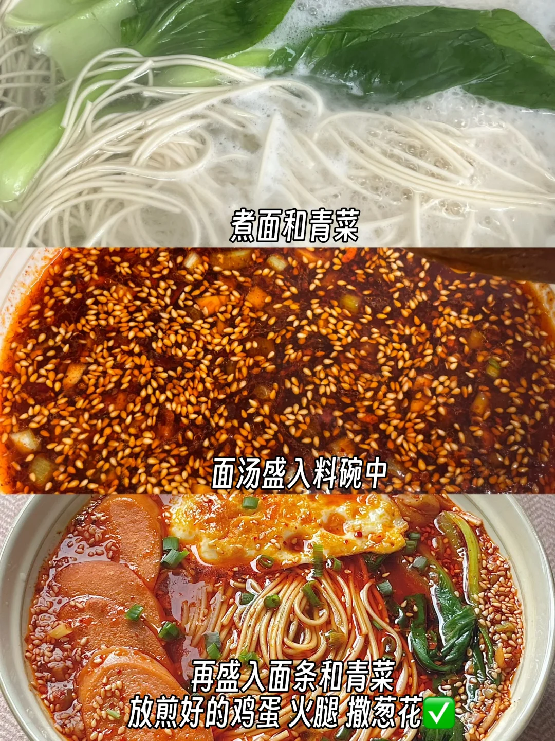 附做法: 1️⃣锅中烧油,煎鸡蛋和火腿肠盛出备用;碗中放入葱末、蒜末、芝麻、辣椒面,淋入热油; 2️⃣再放两勺生抽、两勺陈醋、少许盐、白糖、胡椒粉、榨菜、花椒油 3️⃣煮面和青菜,面汤盛入料碗中,再盛面条和青菜,放煎蛋和火腿肠,撒葱花✅ - 酸酸辣辣的酸汤面做好了🤤来一碗汤都能喝完🌶️这次用到的陈醋是紫林山西陈醋❗️3年陈酿4.5度的酸度棉柔适中,口感有股清香,适合南北方人的口味😌平时煮面、做菜的时候放一点,味道一下就提起来了❗️ -