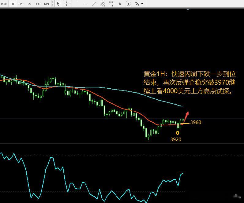 今日周三,黄金进入反弹修正整理,昨日下午欧盘破低大跌3900下方后晚上反弹企稳,且最高一路大涨到3970美元,而早盘金价快速闪崩大跌到3920美元下方快速反弹到高点,调整下跌底部低点一步到位结束,如若出现早盘快速闪崩大跌,意味着主力空头砸盘结束,进入反弹整理,至少白天做空已经没有太大空间,做空最稳妥的时间再晚上;