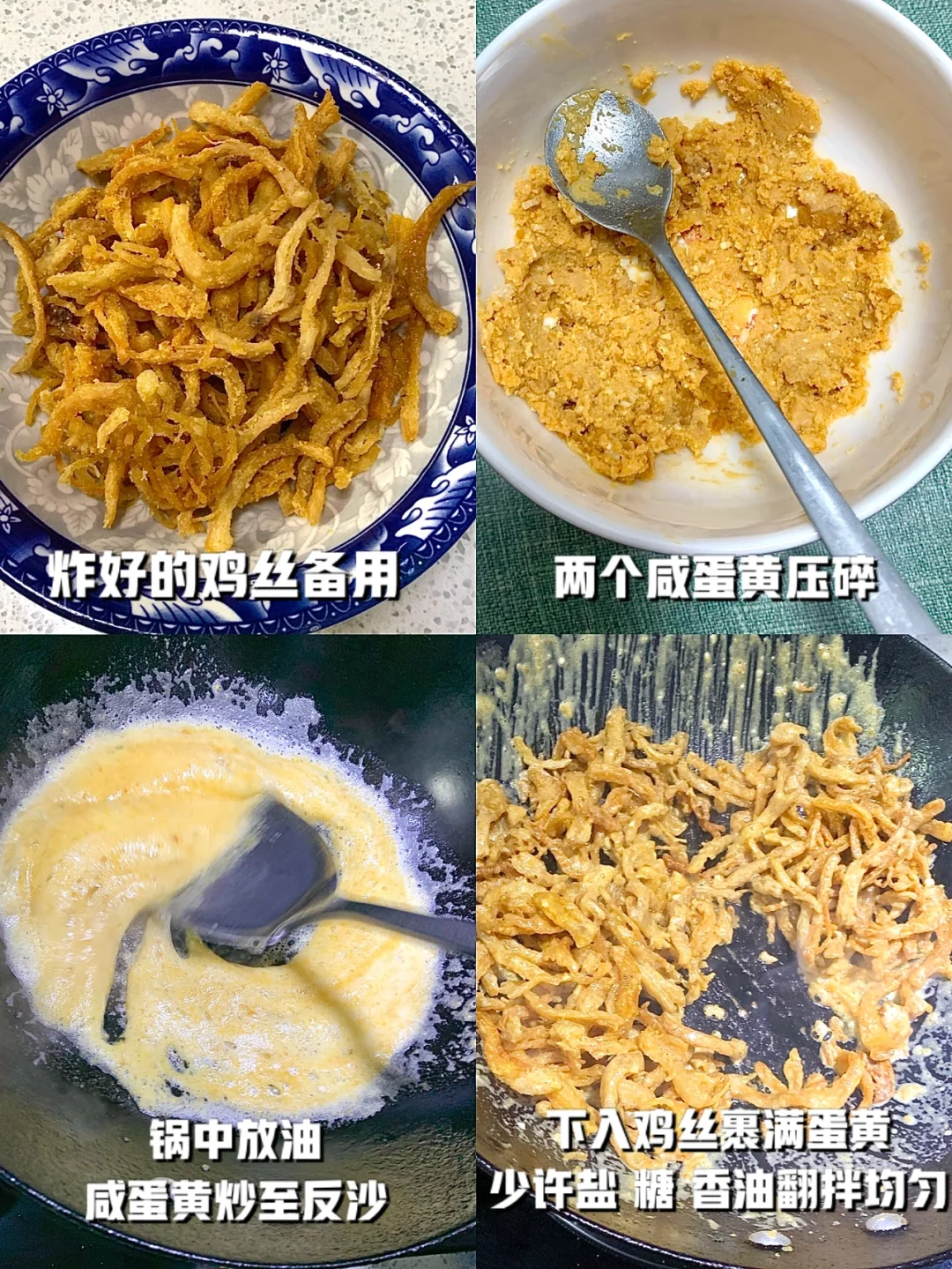 4⃣️两个咸蛋黄压碎,锅中放一点油,小火炒至出沙,倒入炸好的鸡丝,均匀裹上咸蛋黄,加入少许盐和糖、香油翻炒均匀✅