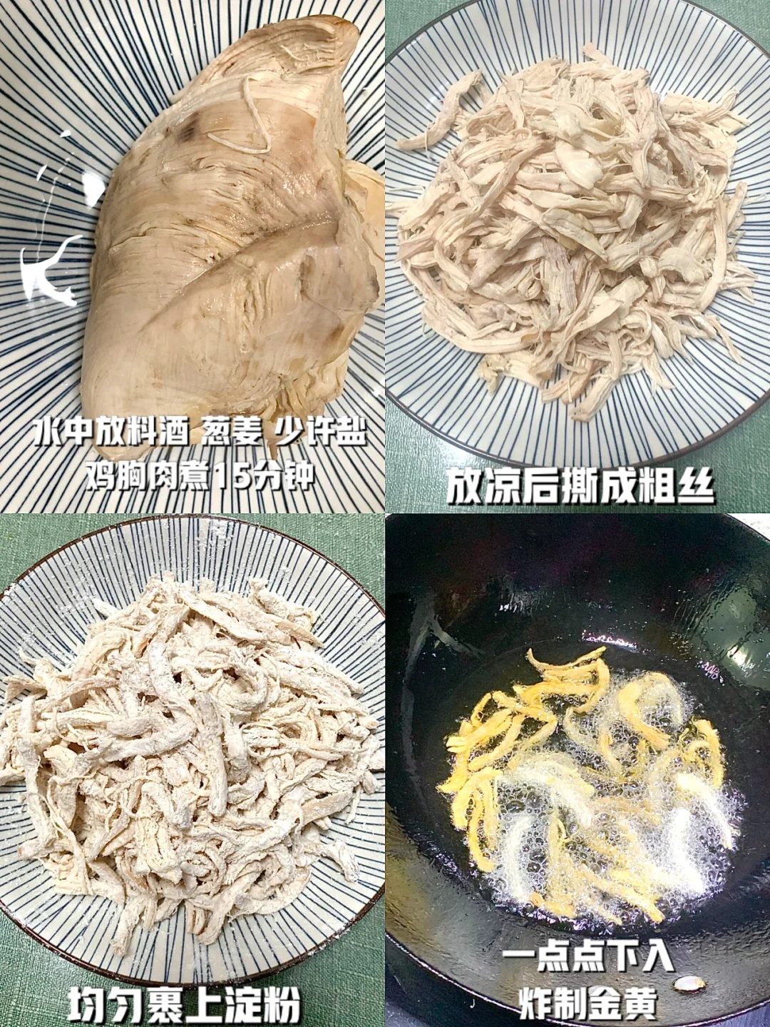 3⃣️锅中烧油,将鸡丝一点一点下入(不要一下放太多,防止粘连),炸至金黄,下完一批捞出再下另一批
