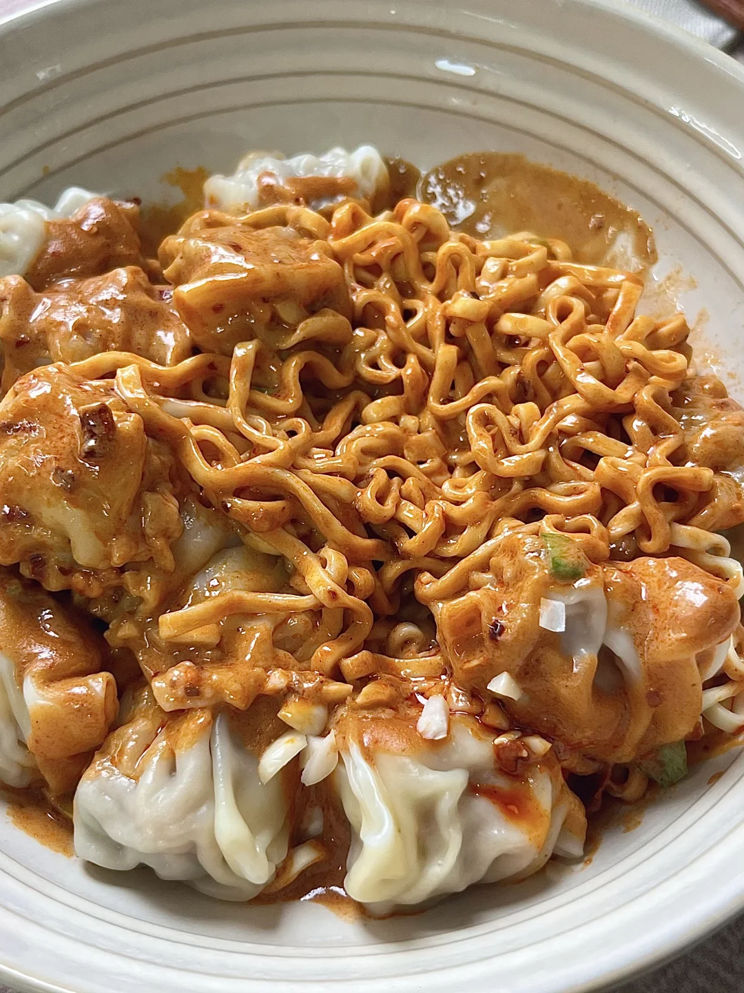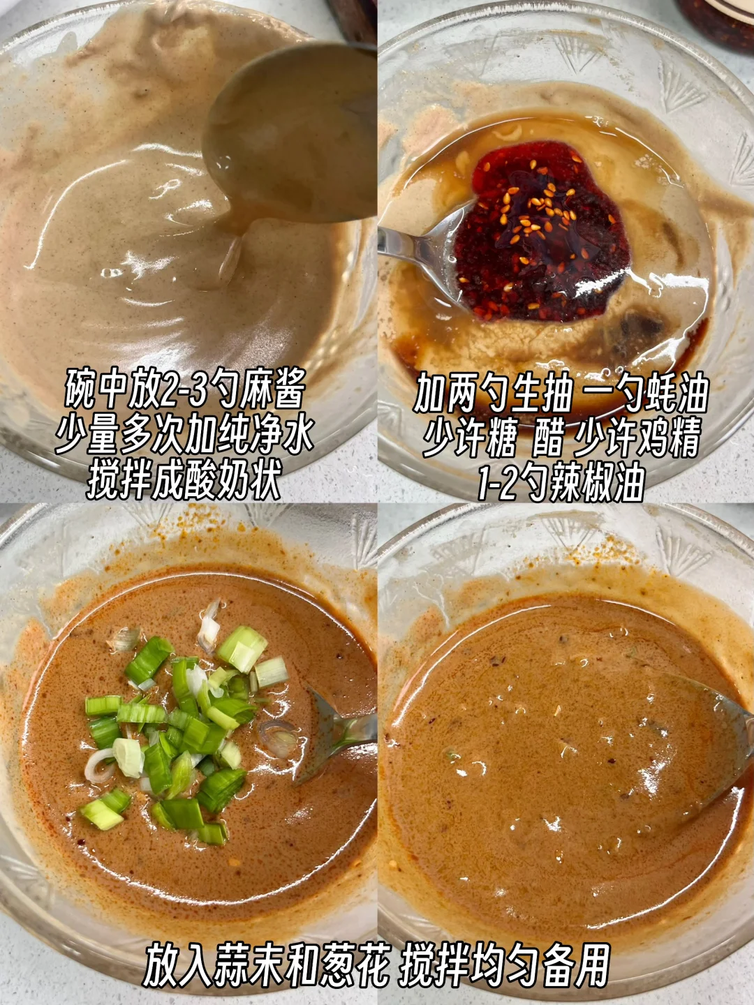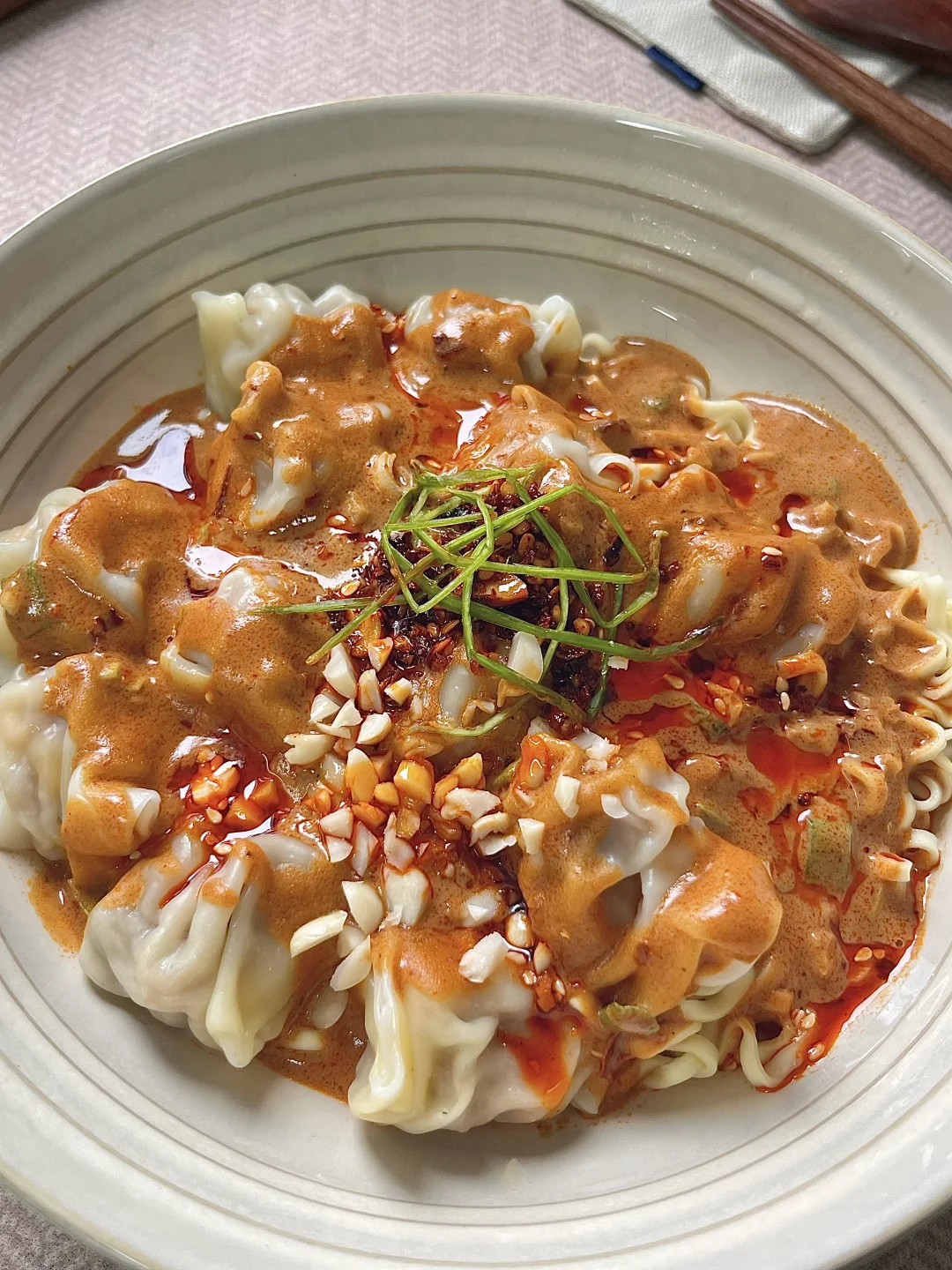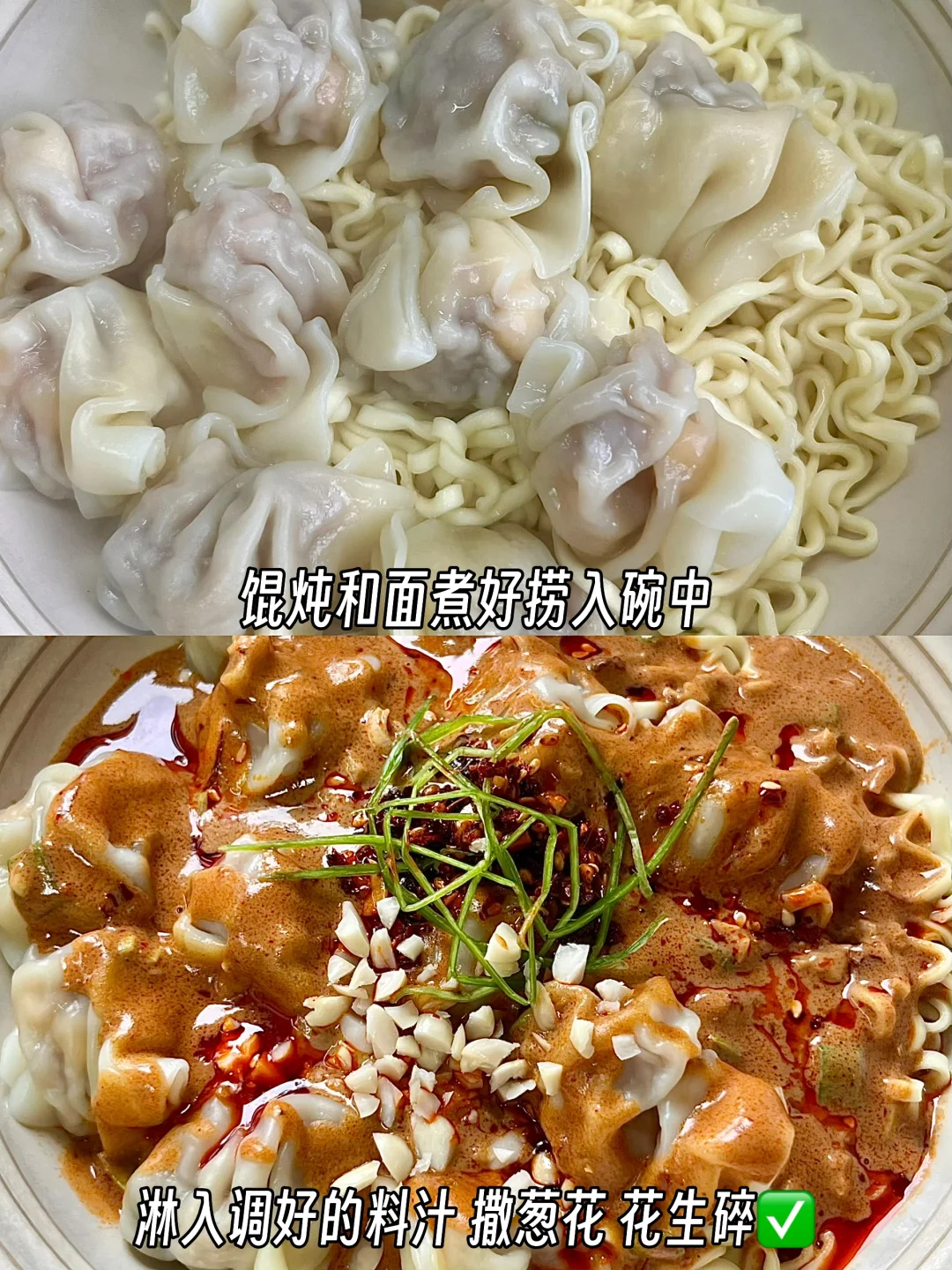 附做法: 1️⃣碗中放2-3勺芝麻酱,少量多次加纯净水,搅拌成酸奶状,再加两勺生抽、一勺蚝油、少许糖、醋、少许鸡精 2️⃣再加入蒜末和葱花,搅拌均匀备用 3️⃣馄炖和面煮熟捞出,淋入料汁,撒花生碎和葱花✅ -