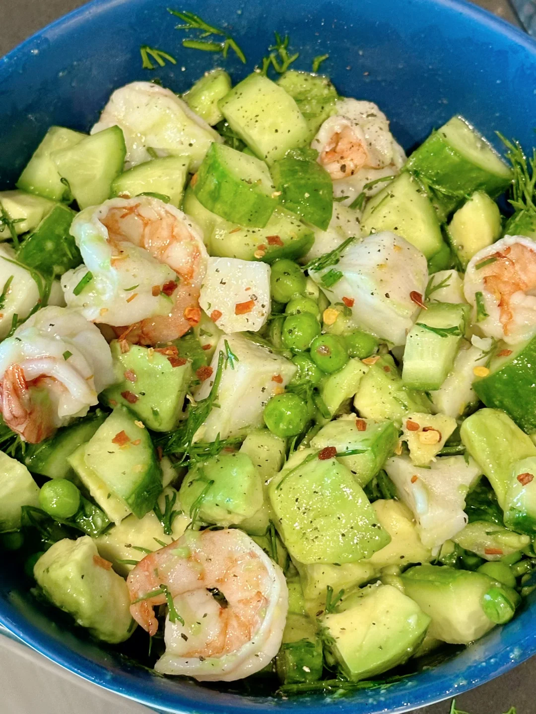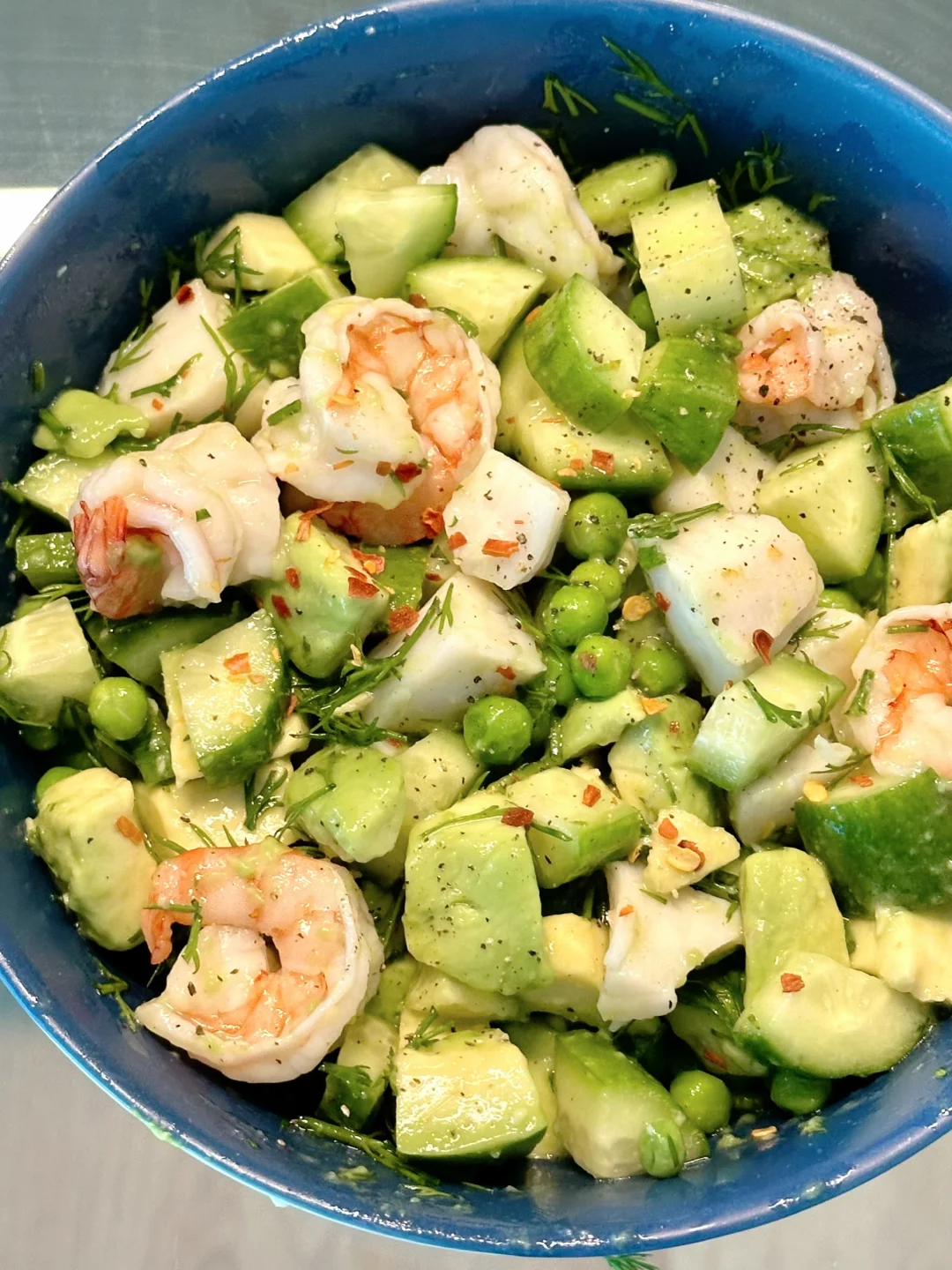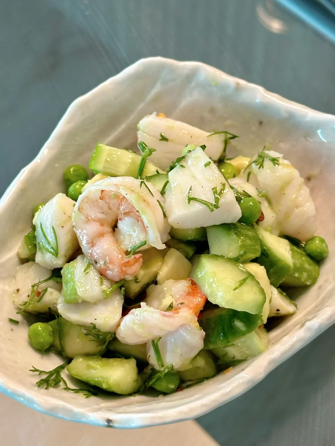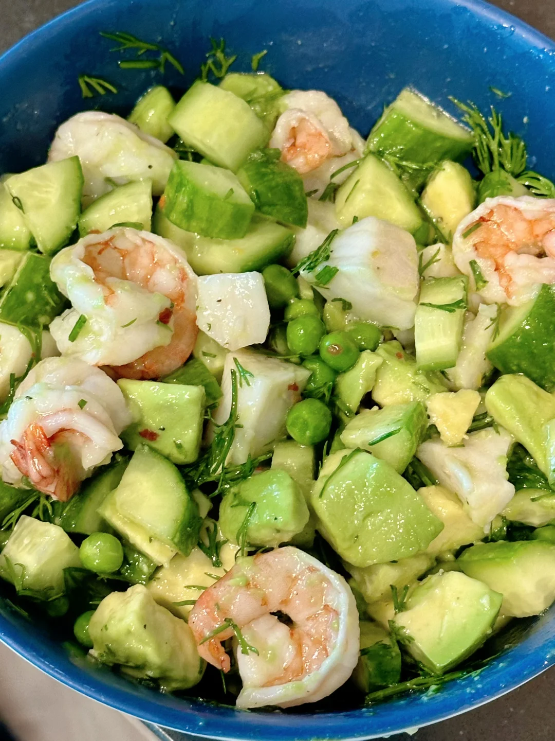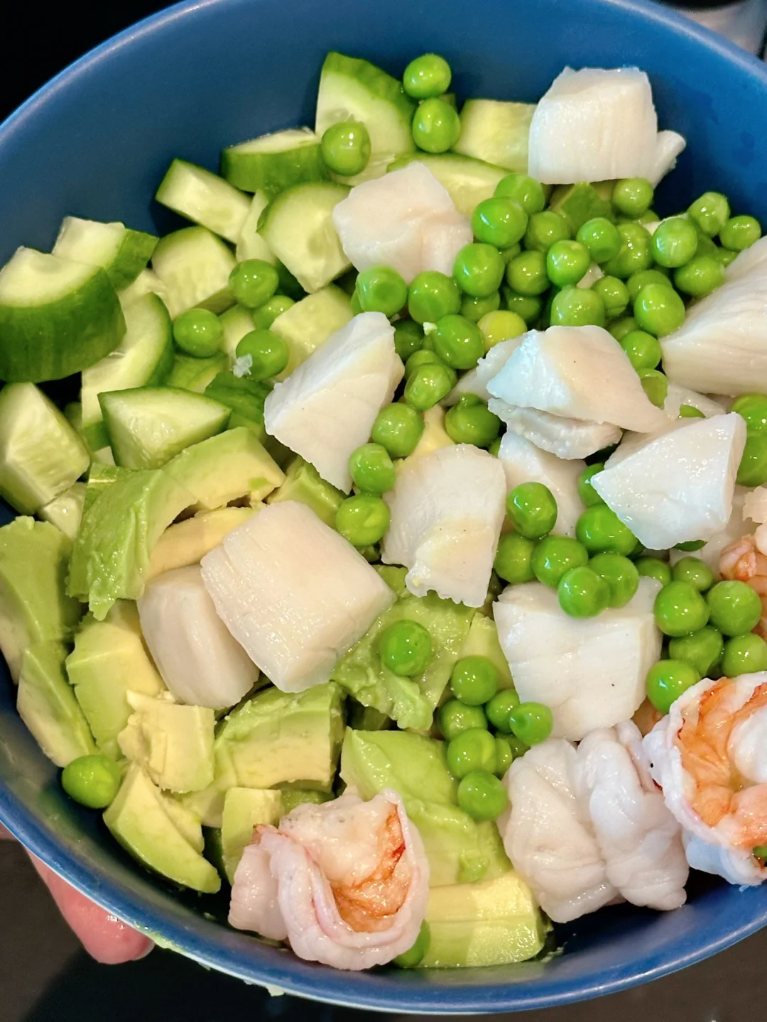 把虾仁扇贝和切丁的牛油果,黄瓜一起放进大碗里,倒入酱汁拌匀就完成了!