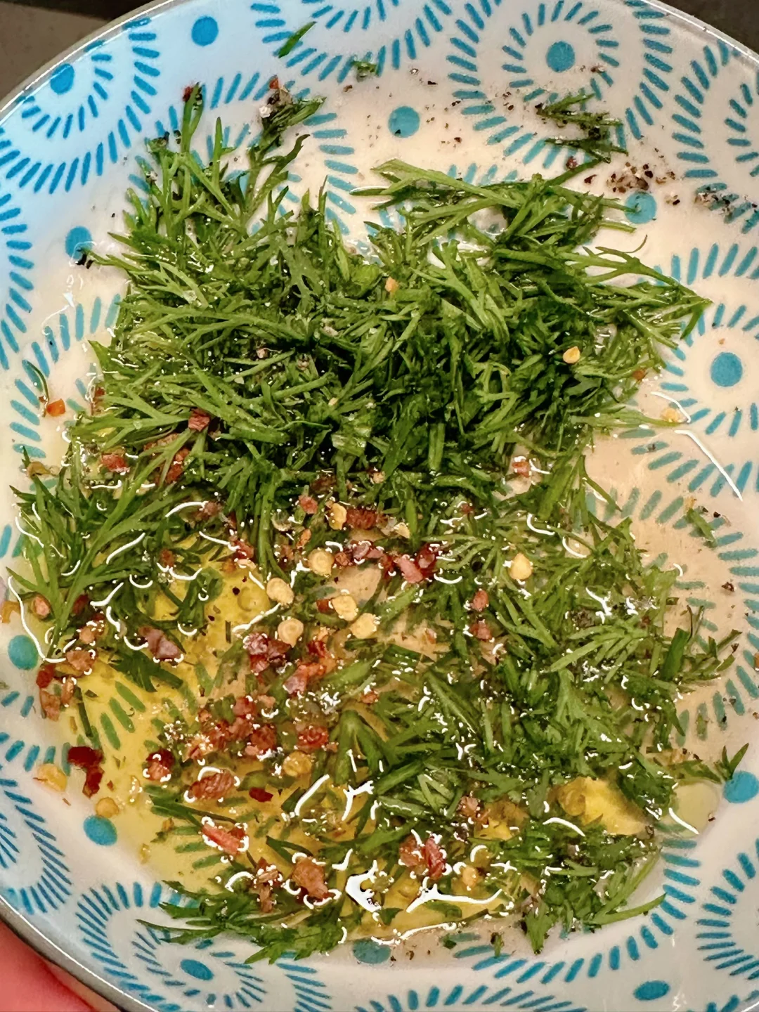 莳萝切碎,拌入橄榄油和醋,根据自己口味加一点胡椒和海盐,我的醋自带一点甜味,也可以根据喜好加一点蜂蜜,这就是酱汁;