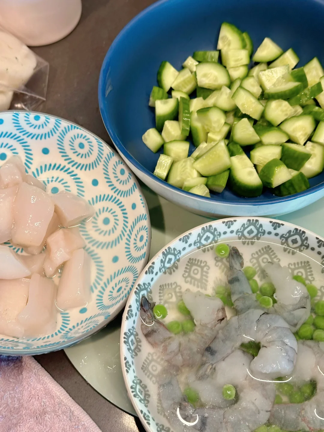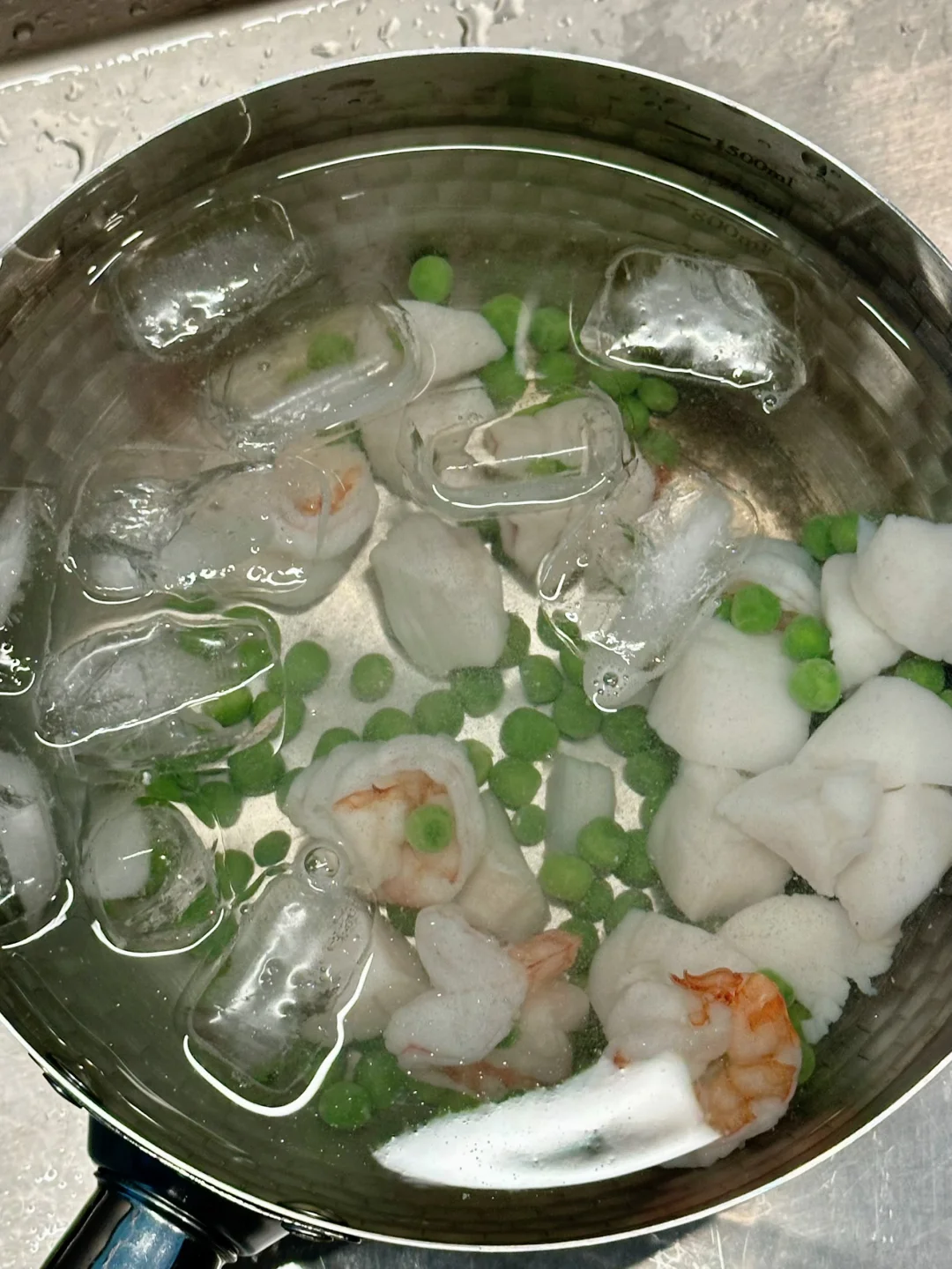 虾仁开背,扇贝一切四,水开后把扇贝,虾仁和豌豆放进锅里,等水再次沸腾就关火,过冰水降温,这样刚刚好口感很嫩;