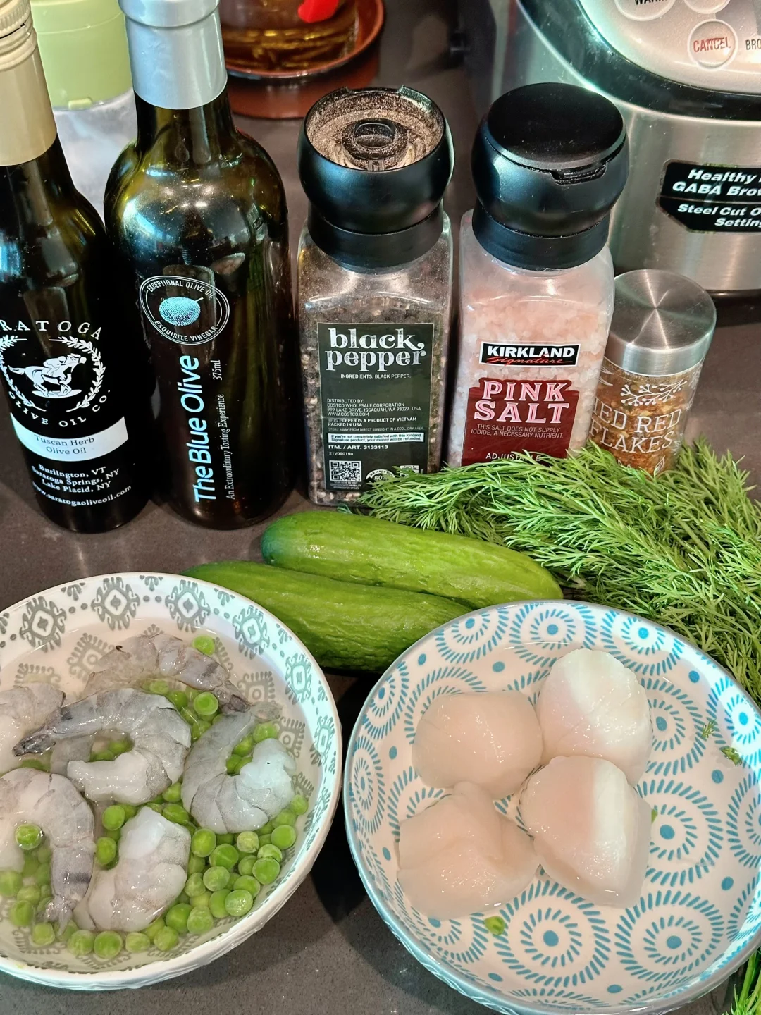 我用的是Costco的扇贝肉,个头很大很甜,还有wegmans的黑虎虾,煮熟后很漂亮。