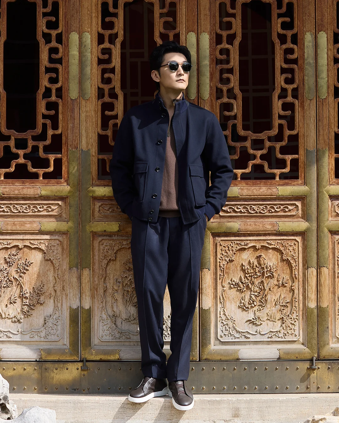 三人演绎的老钱风穿搭简约又高级,罗一舟、宋洋不仅上身了经典的oasi cashmere系列针织及外套单品,谭凯更是演绎了Vellus Aureum黄金羊毛系列开衫,黄金羊毛作为杰尼亚的顶级羊毛面料,拥有比羊绒更柔软细腻的触感,上身轻盈保暖且很有廓形。