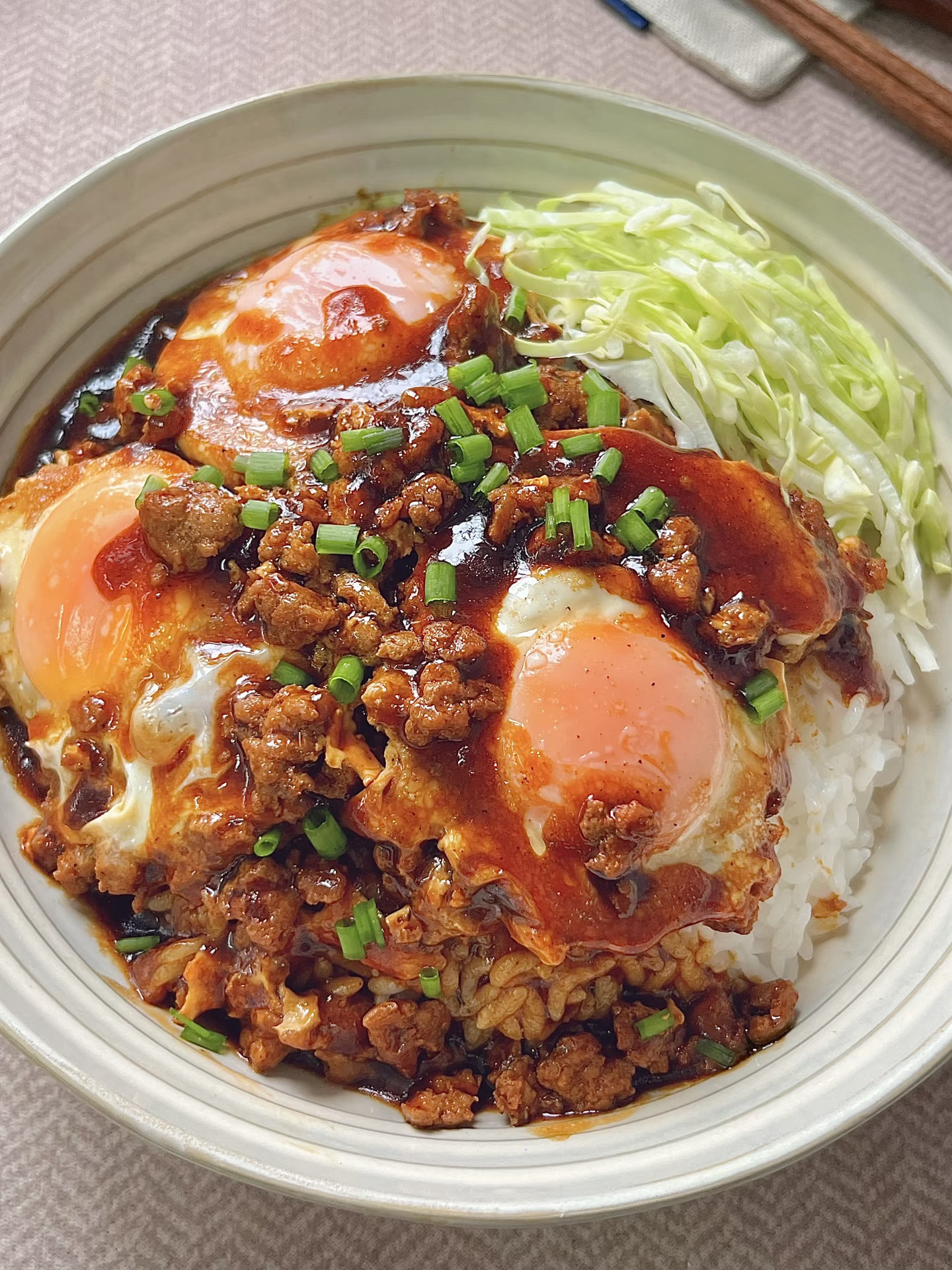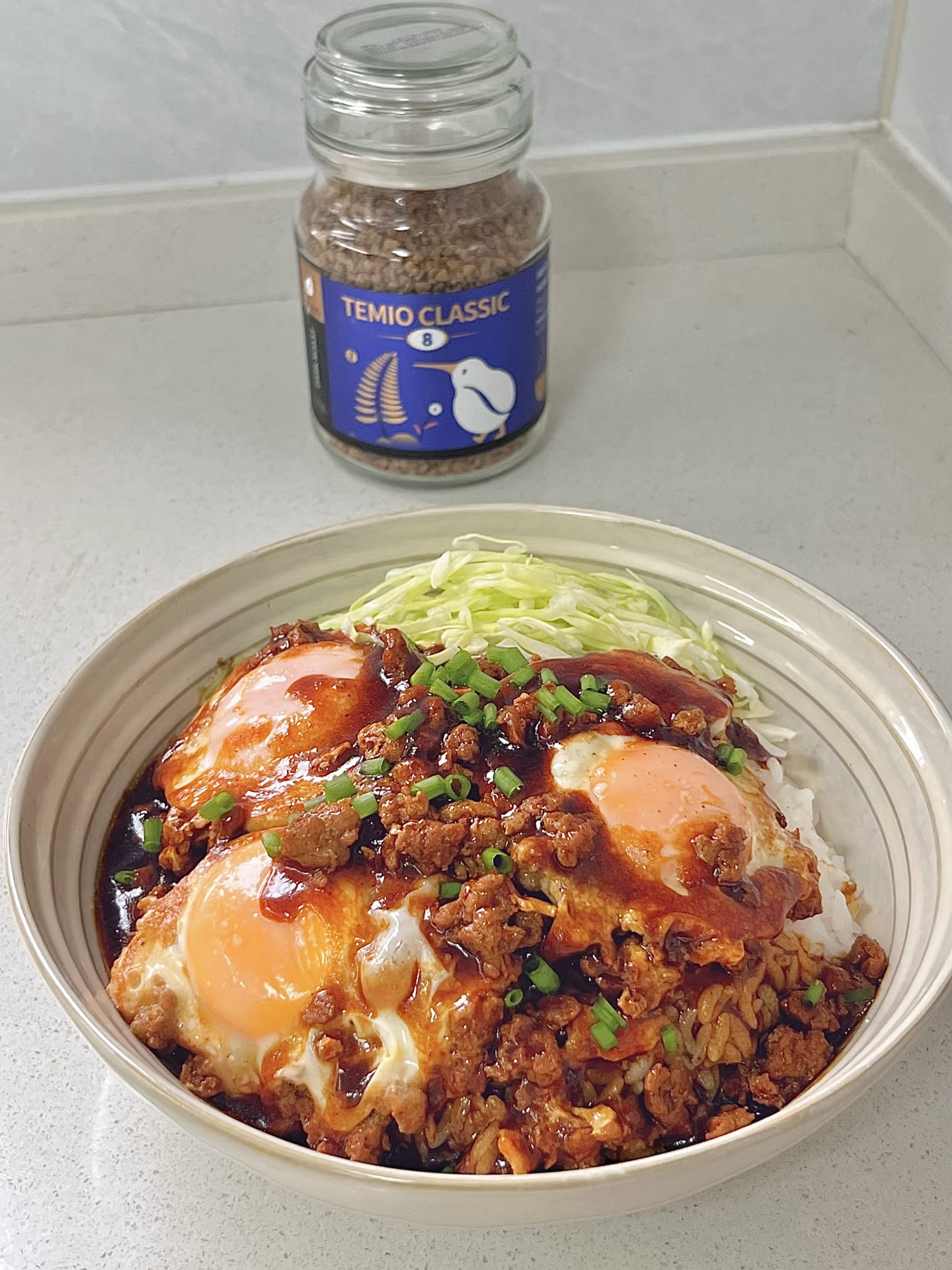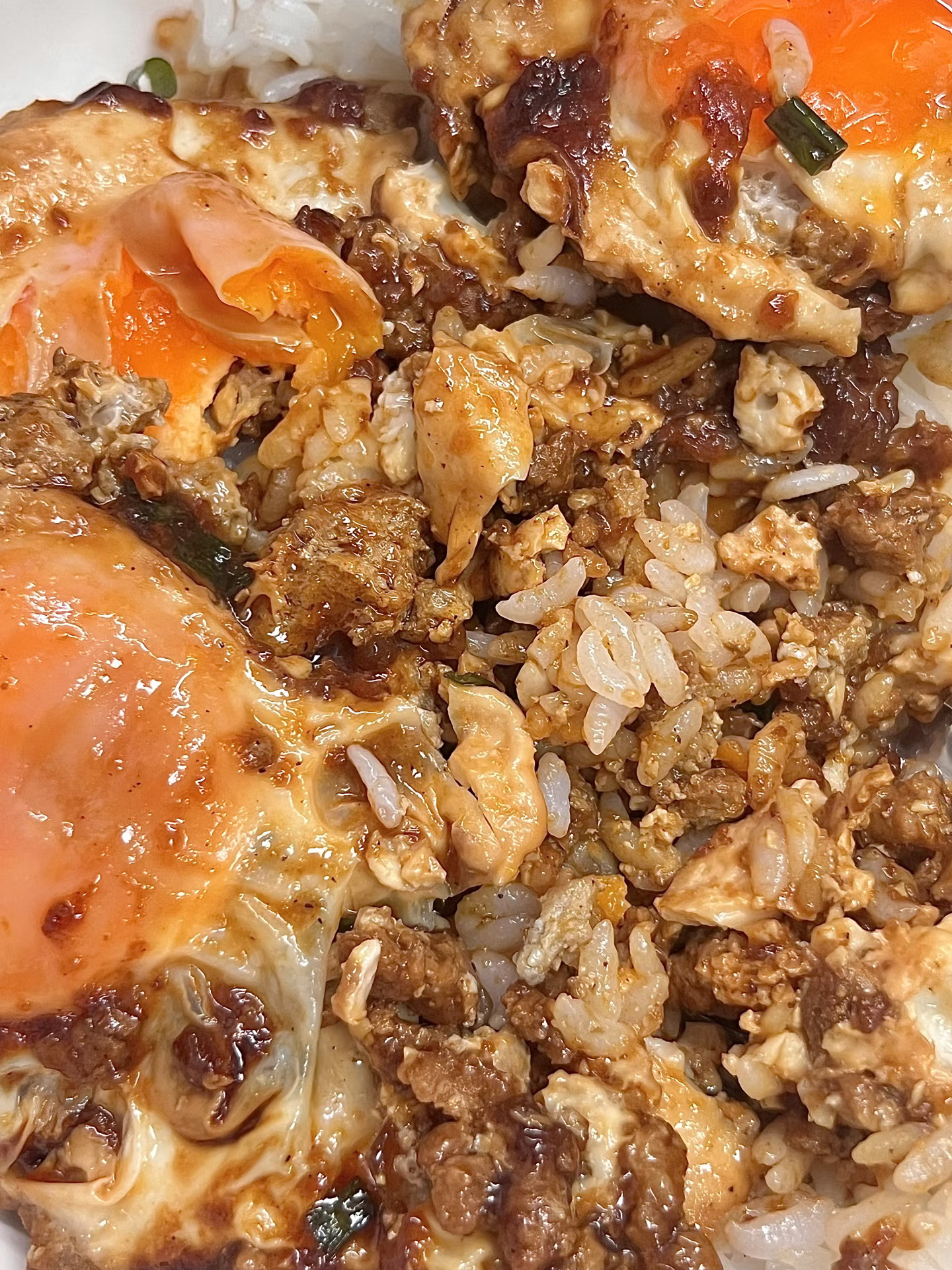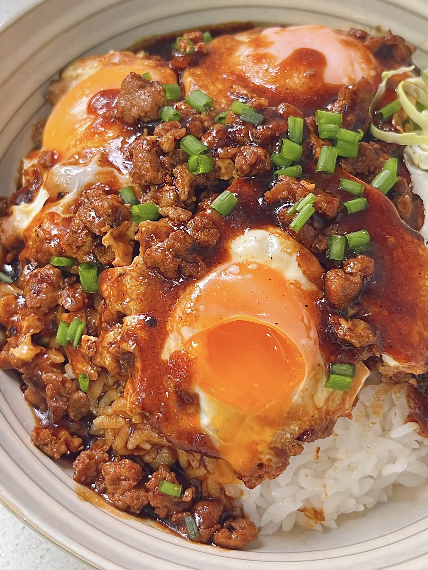 4️⃣鸡蛋和肉沫盖在米饭上,淋上汤汁,放点生菜丝✅