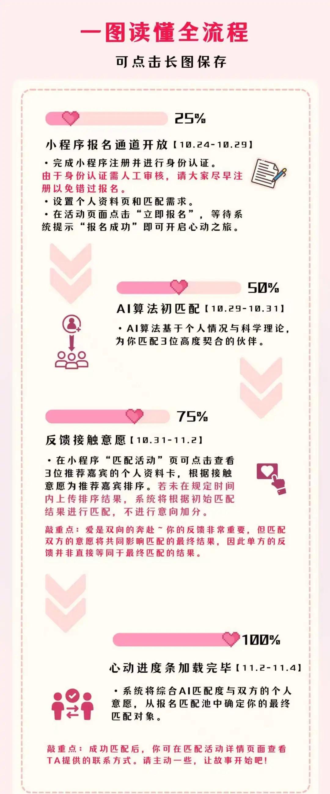 人大人自己的校园恋爱来了! 当那句“喜欢你”,终于听见回声 故事会怎样开始? [惊喜]RUCrush·心动人大 第四期来啦! 10.24 - 10.29 报名开启 专属小程序上线,身份认证+隐私加密,安全感拉满✨ →怎么玩? ❶ 注册认证:人大邮箱/人大学生证/校园卡登录,真实又安心 ❷ 填写资料:打造专属心动卡片 ❸ AI匹配:系统为你推荐3位高契合伙伴 ❹ 意愿反馈:记得排序!你的选择很重要~ ❺ 最终匹配:双向奔赴,收获联系方式💌 📅 心动日程表 即日起-10.29 注册报名·填写资料 10.29-10.31 AI匹配·3位候选Crush 10.31-11.2 意愿排序·你的选择很重要! 11.2-11.4 最终匹配·主动才有故事❤️ →还有超多浪漫线下活动等你解锁: ·匹克球对决 ·治愈手作 ·北京艺术中心漫步 ·朝阳公园赏秋 总有一款适合你和他/她~ 别再让心动停留在想象 这个秋天,勇敢一点 所有美好,都始于一个开始 →报名通道:微信搜索“心动mate”小程序 微信关注“研小团“公众号获取更多信息,快来评论区@你的朋友一起来! 图文:吕然 兰馨兰 心动人大 RUCrush 校园恋爱 人大专属 脱单行动 秋天该谈恋爱了