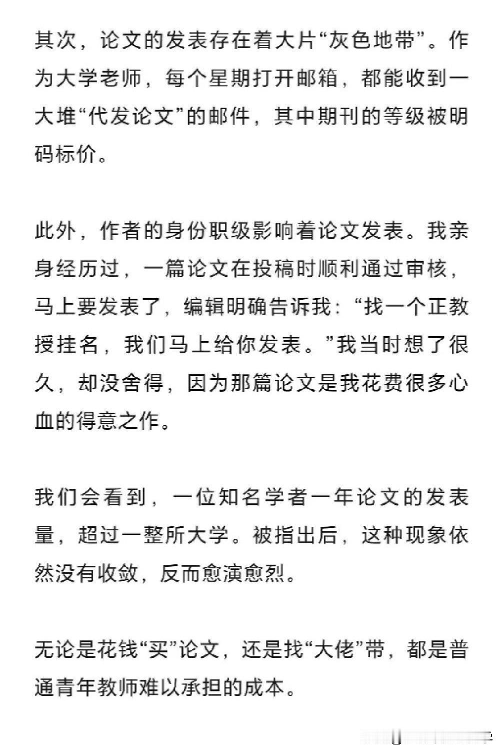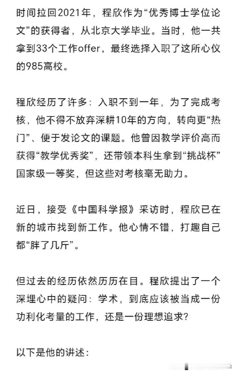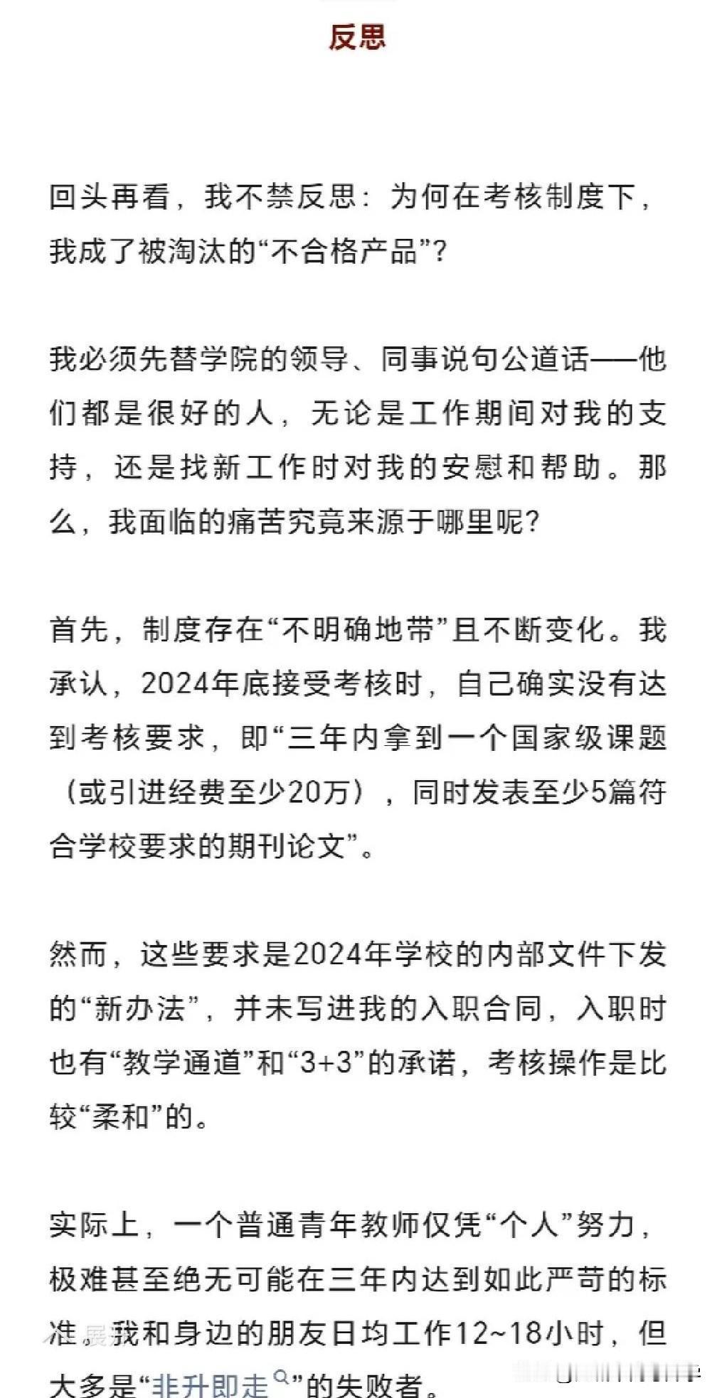 如今的青椒博士去高校大部分都会面临非升即走的合同, 而且非升即走是一刀切, 并不会因为你毕业于清北而有所优待, 就是唯课题和唯论文为上。 没有按规定达到考核科研课题和论文数量, 那不好意思,请卷铺盖走人, 而且越是好的985高校考核的目标越高, 需要申请的课题档次越高, 发表的论文档次和篇数越多。 于是所有的入职青椒被迫开卷, 在寒窗苦读若干年后, 依旧继续开启疯狂卷科研的节奏, 没有休息,不能懈怠。 被迫放弃自己博士的研究方向, 而选择好发论文和申请课题的研究领域。 牺牲时间,牺牲健康, 不向论文代写代发的灰色地带妥协。 如果没有抱紧学术大咖的大腿, 进入到大牛的科研团队, 换来的就是永无休止的退稿和改稿, 在非升即走的异常激烈下苟延残喘!