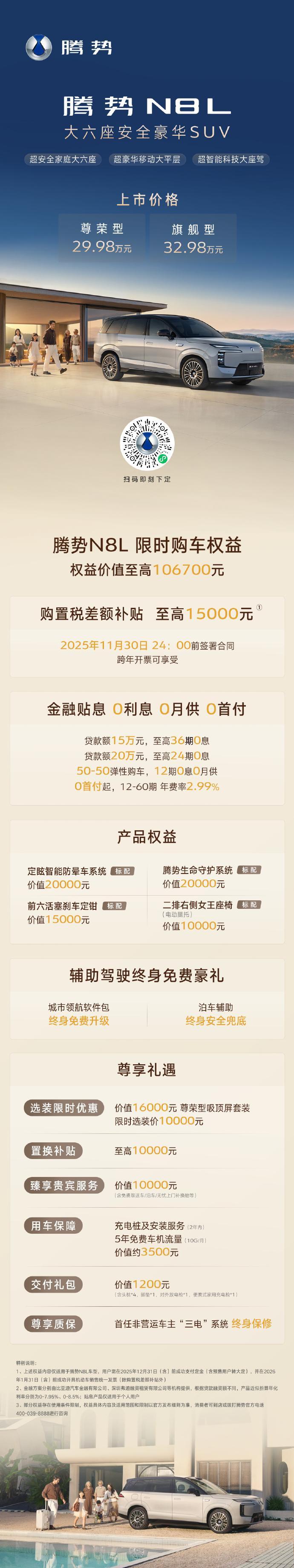 如果你: 是技术控,非常看重车辆的“三大件”基础素质,追求驾驶乐趣和乘坐高级感; 对第三排的舒适性和使用频率有硬性要求,希望每个家人都能被照顾周全; 将安全视为最高标准,又希望一次性获得空悬、后轮转向、激光雷达等高阶配置。 那么同级别中腾势n8l是你的首选。 全系标配“云辇-A智能空气悬架”和“后轮主动转向”; 零百加速3.9秒;后轮转向实现4.58米转弯半径; 第三排支持电动调节,6.11㎡ 套内面积,满载后备箱仍有407升; 车身采用2000MPa超高强度钢,具备180km/h高速爆胎稳定控制; 全系标配激光雷达和高阶智能驾驶系统。 腾势n8l是一辆“水桶级”家庭豪华SUV,在性能、操控、空间、安全、科技等方面都有突出长板,越级价值终极满足。31.98万到29.98万的正式定价,不仅极大地增强了其市场竞争力,也彰显了腾势品牌希望N8L成为“全家三代人的满意之选”并引爆市场的决心。