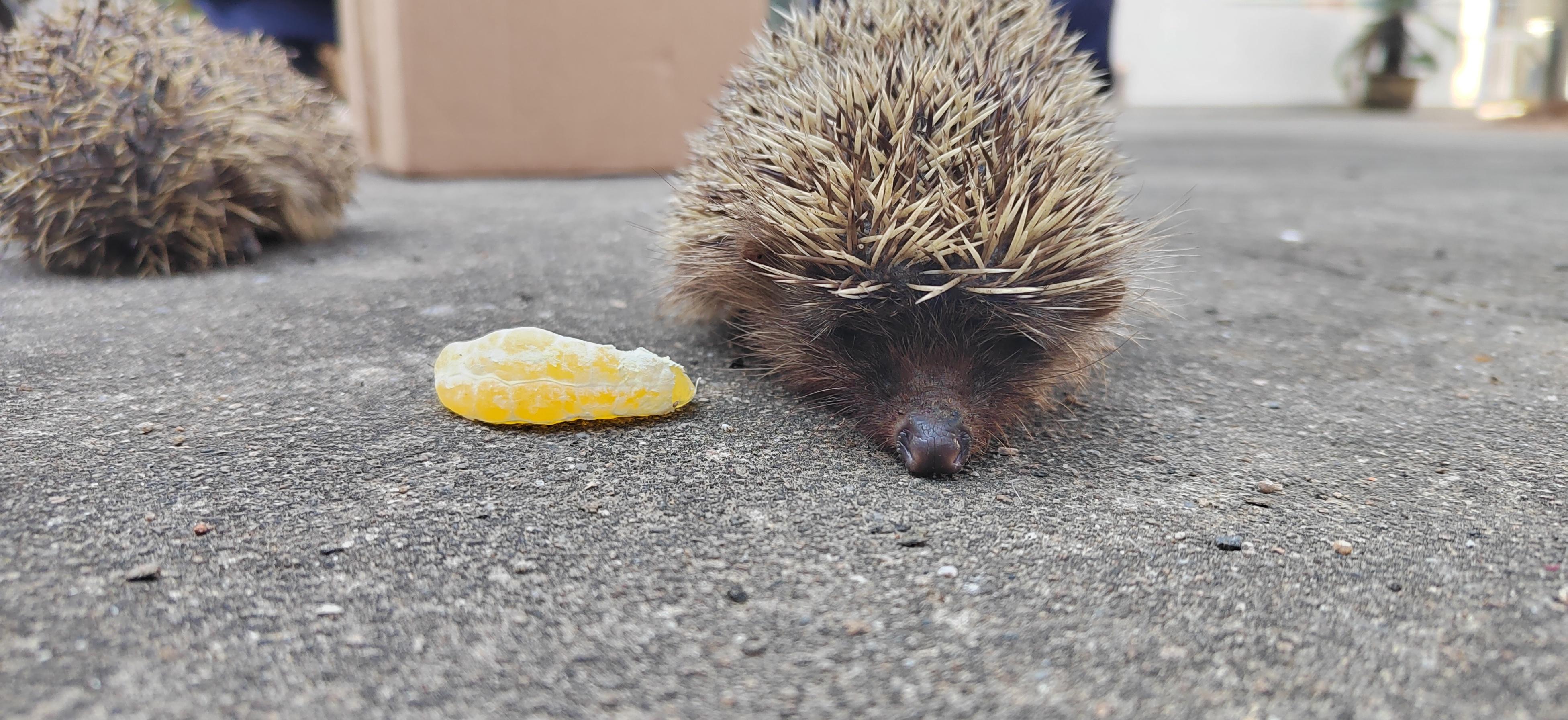 在对刺猬身体进行初步检查,确认其无明显外伤且活动正常后,民警找来了一些蔬菜水果,小心翼翼地放入纸箱内,给它们补给体力。在民警“VIP”待遇和悉心照料下,小刺猬渐渐恢复了活力。