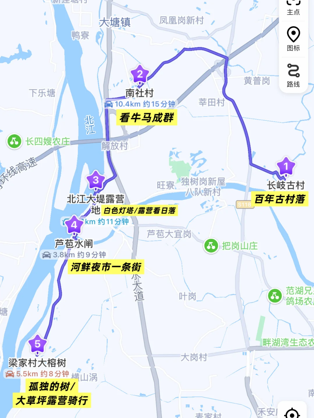 佛山三水长岐古村 (游玩约1~2h)→南社村(看牛马吃草)→北江大堤(游玩约 3小时)→芦苞水闸(江边吃河鲜)→梁家村大榕树(大草坪露营骑行看日落)