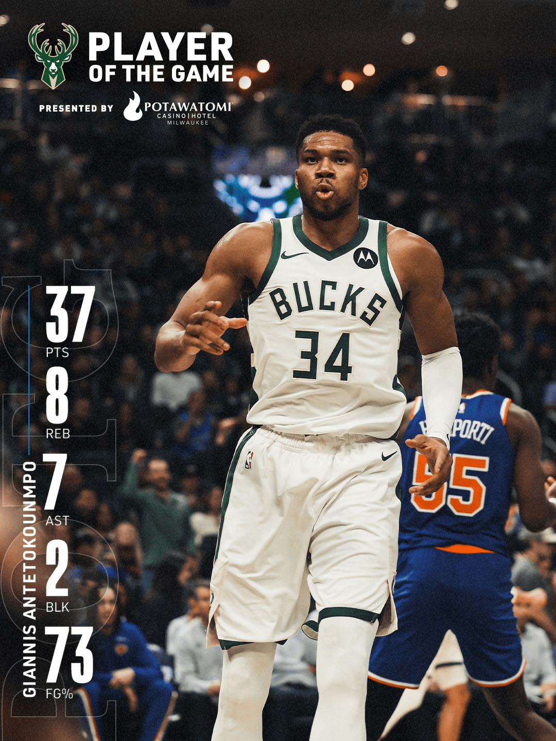 本场比赛,雄鹿球员扬尼斯-阿德托昆博出战33分钟,22投16中,其中三分球1投0中,罚球7投5中,得到37分8篮板7助攻1抢断2封盖。
