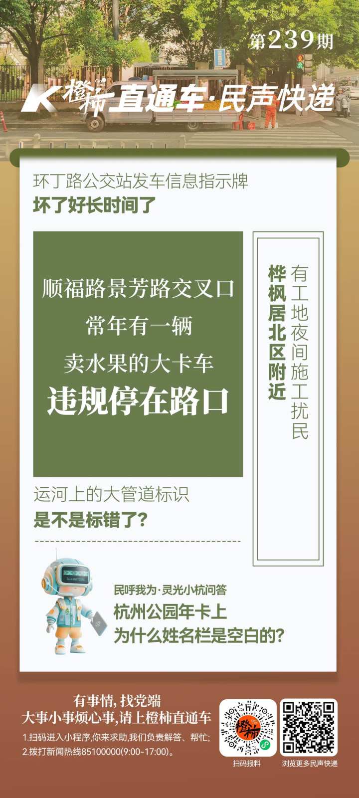 “12345”政务服务热线与“橙柿互动”联合打造的“民呼我为·灵光小杭”智能问政系统已正式上线。打开橙柿互动App,点击首页中的“灵光小杭”卡通小图(上图),即可进入“民呼我为·灵光小杭”问答页面,在对话框中输入问题,“灵光小杭”将第一时间给出权威答复。