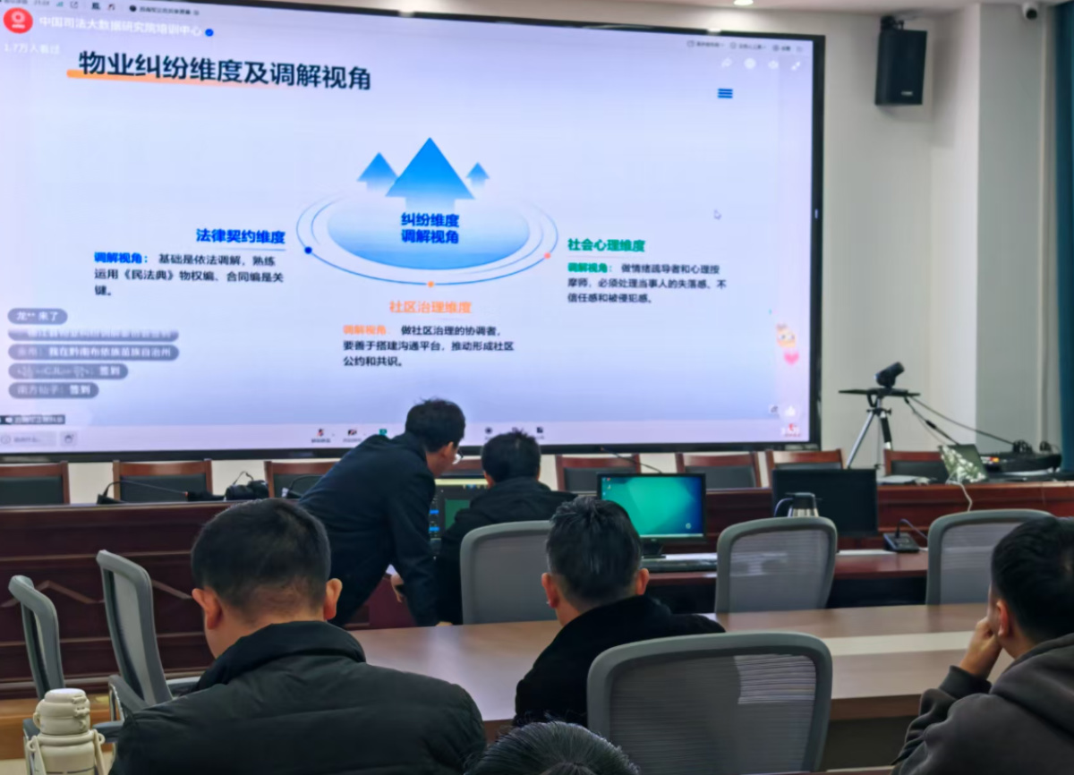 本次培训以“全国调解员在线直播培训”为契机,采用“线上直播授课+线下指导交流”模式组织学习。课程聚焦当前物业纠纷治理中的热点与难点,围绕纠纷特点、调解策略、法律适用及沟通技巧等进行了系统讲解。授课内容深入浅出,案例生动翔实,具有指导性与操作性,现场学习氛围浓厚,参训人员全程聚精会神,收获颇丰。