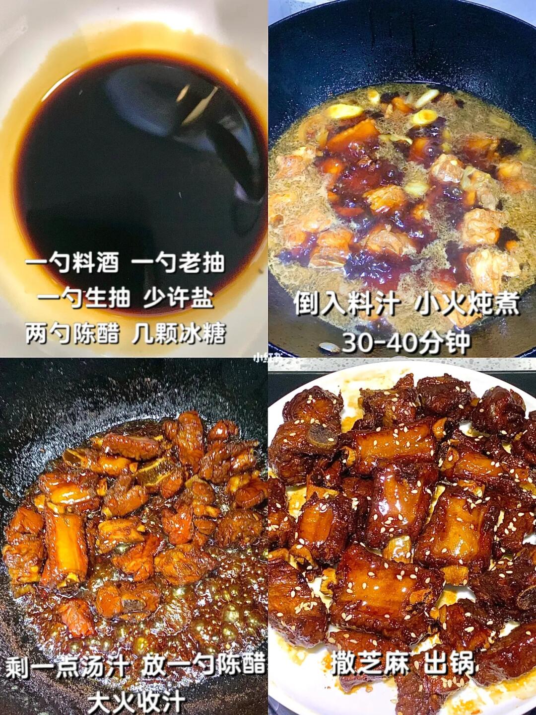 宇宙的尽头是糖醋排骨!! - 🌟🌟食材: 猪小排、八角一个、葱姜 🌟🌟步骤: 1⃣️锅中烧水,放葱姜料酒,将排骨焯水后捞出备用 2⃣️锅中烧油,放入一把冰糖,小火炒出枣红色糖色,放入排骨翻炒上色,放入少量葱姜、一个八角 3⃣️倒入开水,末过排骨,调料㊙️:一勺生抽、一勺老抽、一勺料酒、少许盐、几颗冰糖、两勺陈醋 4⃣️倒入料汁后小火炖煮,30-40分钟,剩一点汤汁的时候放一勺陈醋,大火收汁,撒芝麻✅ - 最爱的就是糖醋排骨了!!没人能拒绝😭超级开胃!