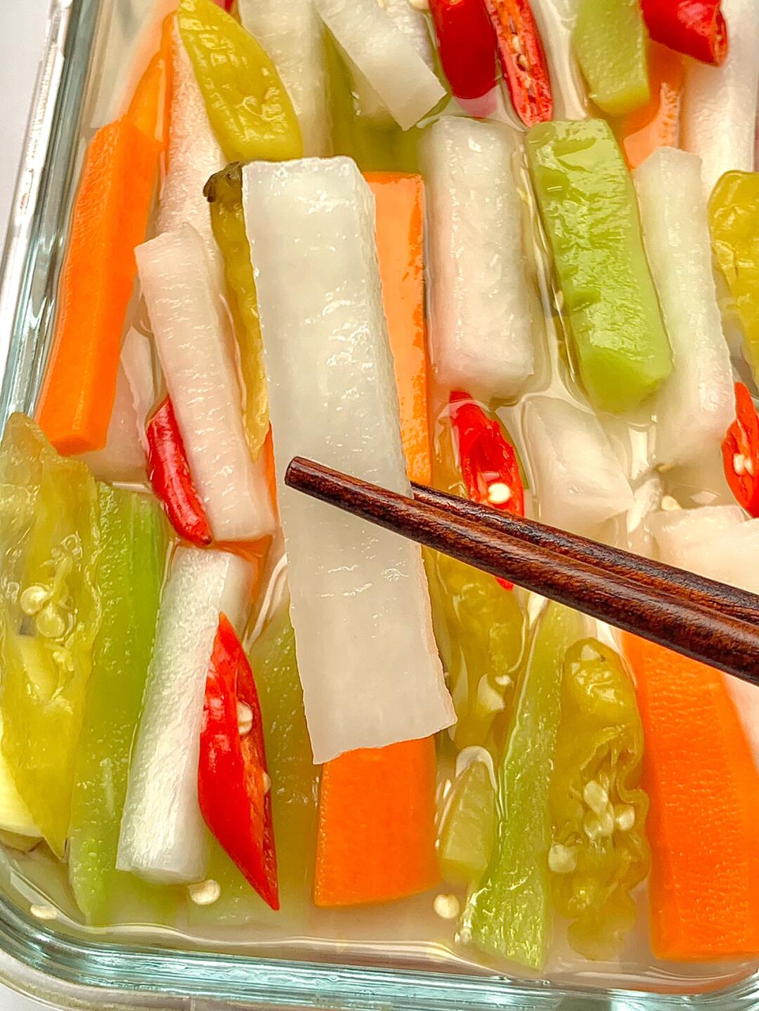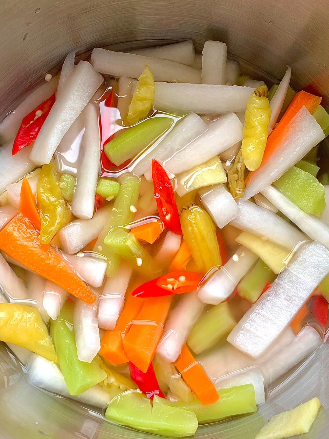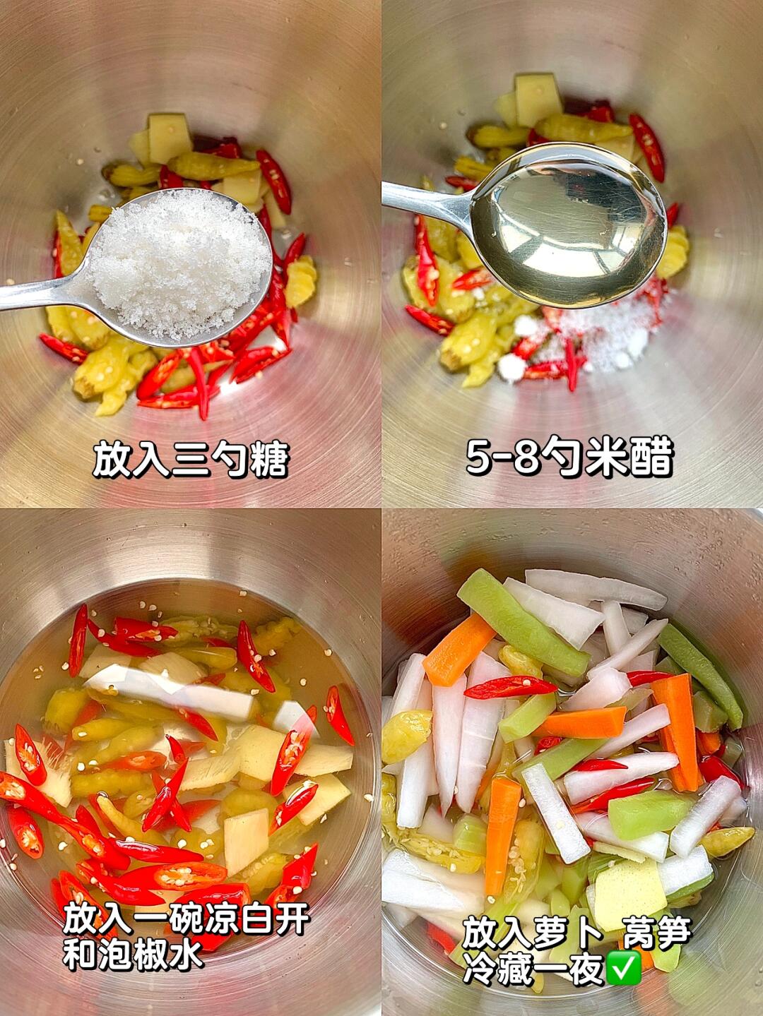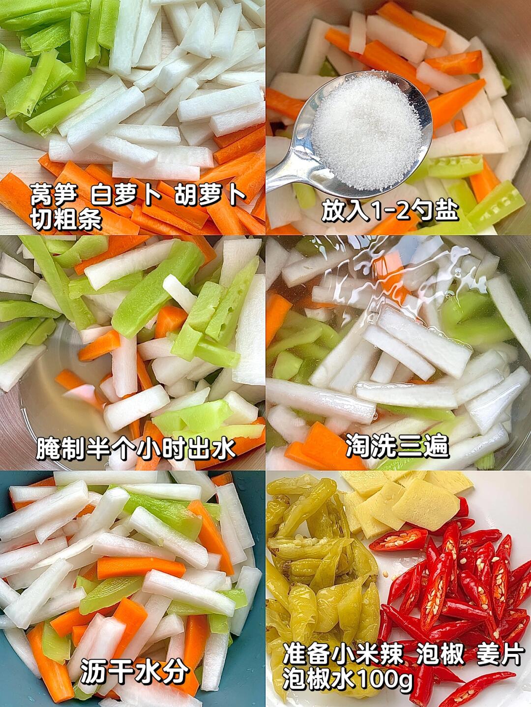 天天都在想这一碗萝卜泡菜!!夏天必吃啊!酸辣开胃! - 🌟🌟食材: 白萝卜、胡萝卜、莴笋、泡椒、小米辣、姜 🌟🌟步骤: 1⃣️萝卜、莴笋切粗条,放入1-2勺盐抓匀,腌制半个小时出水 2⃣️淘洗三遍,沥干水分,切好小米辣、姜片、泡椒 3⃣️放入三勺糖、5-8勺米醋(按照口味)、100g泡椒水、一碗凉白开 4⃣️放入萝卜和莴笋,盖保鲜膜,放入冰箱冷藏一夜✅ - 酸辣开胃!!夏天解腻必备!!专治没胃口!!