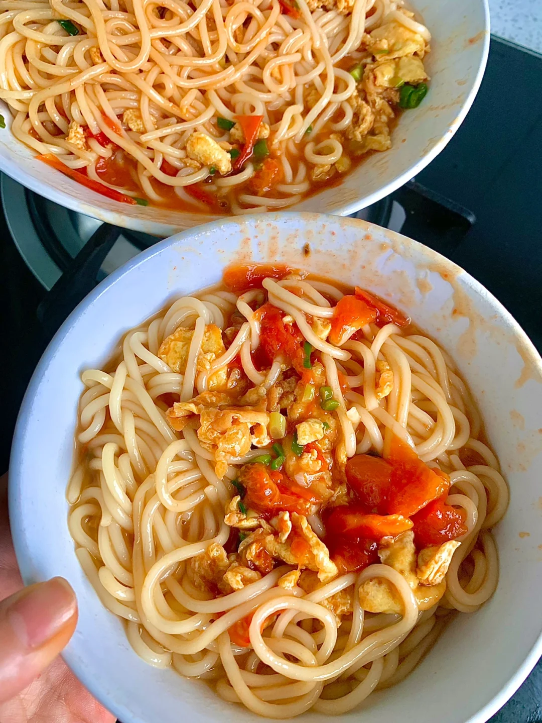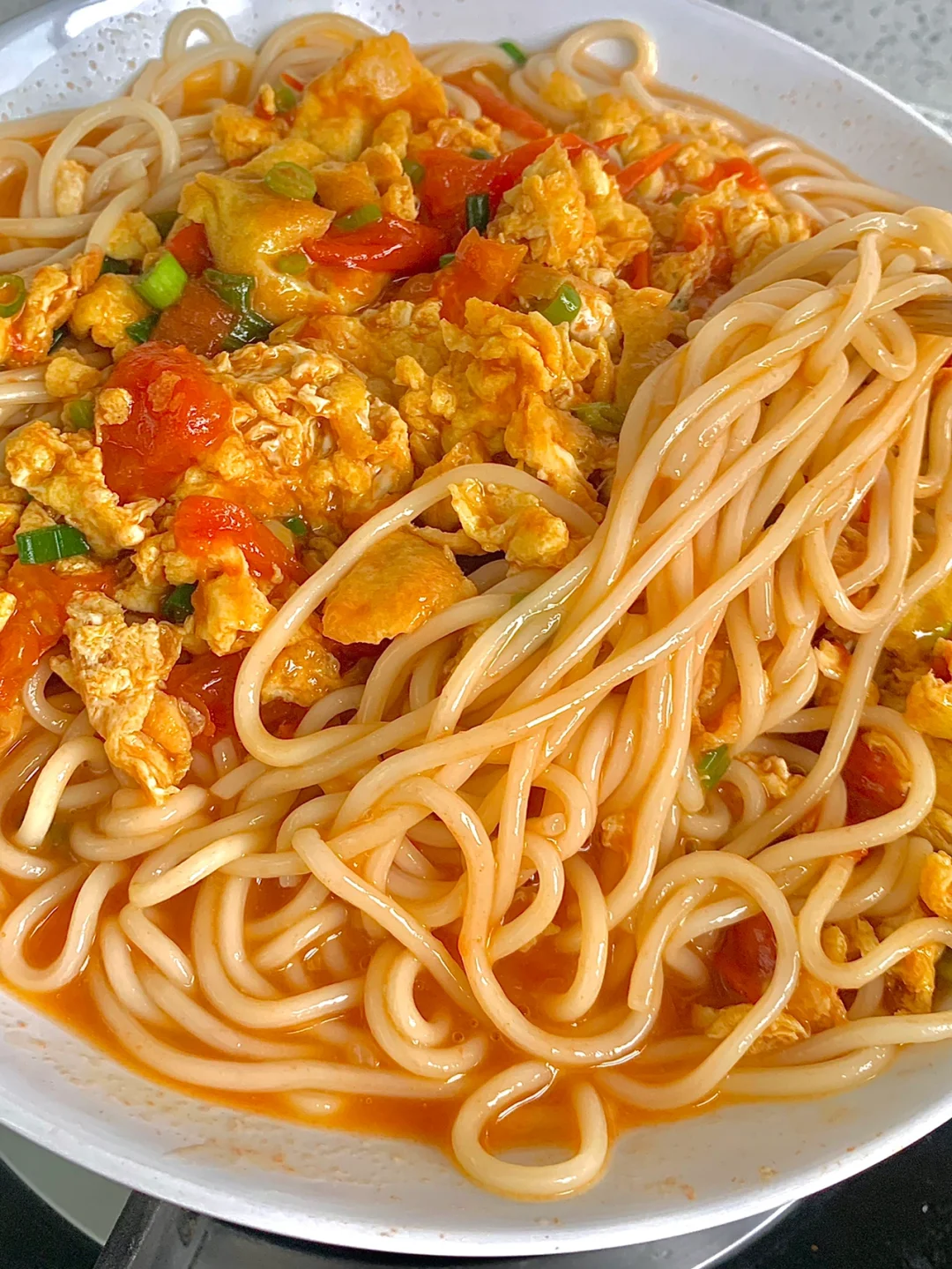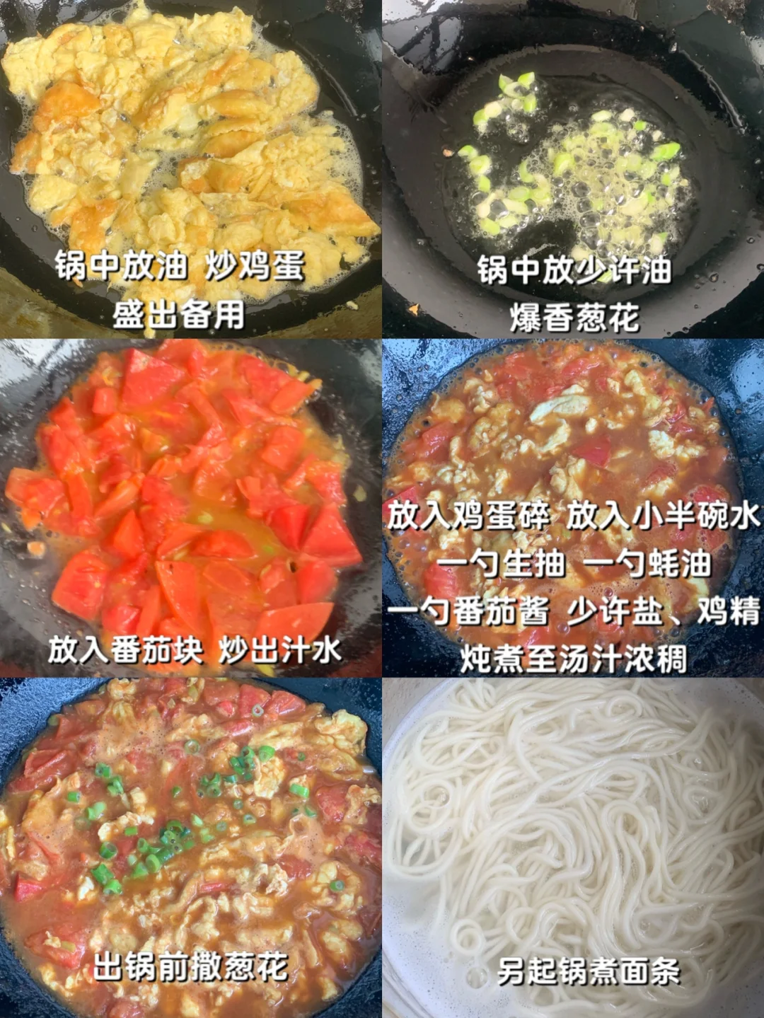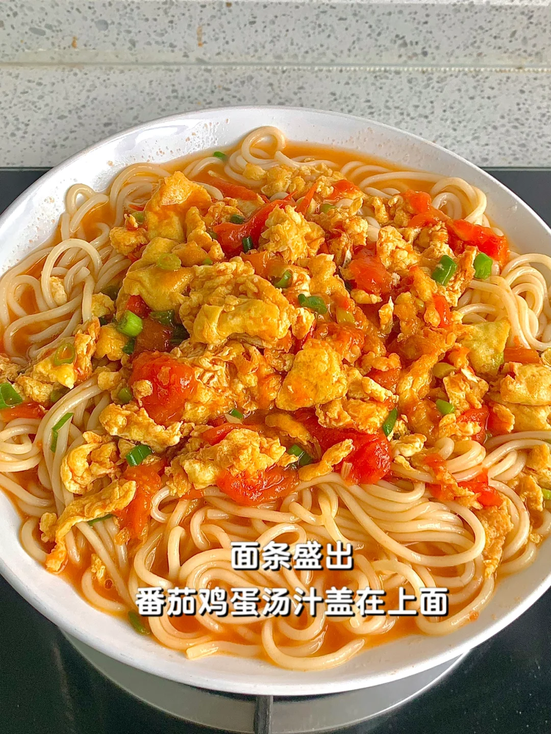 面条爱好者的天花板!! - 🌟🌟食材: 番茄、鸡蛋、葱花、面条 🌟🌟步骤: 1⃣️锅中放油,炒鸡蛋,盛出备用 2⃣️锅中放少许油,爆香葱花,放入番茄块翻炒出汁 3⃣️放入鸡蛋、小半碗水,㊙️一勺生抽、一勺蚝油、一勺番茄酱、少许盐、鸡精,炖煮至汤汁浓稠 4⃣️出锅前撒葱花,面煮好盛出,浇上番茄鸡蛋汤汁✅