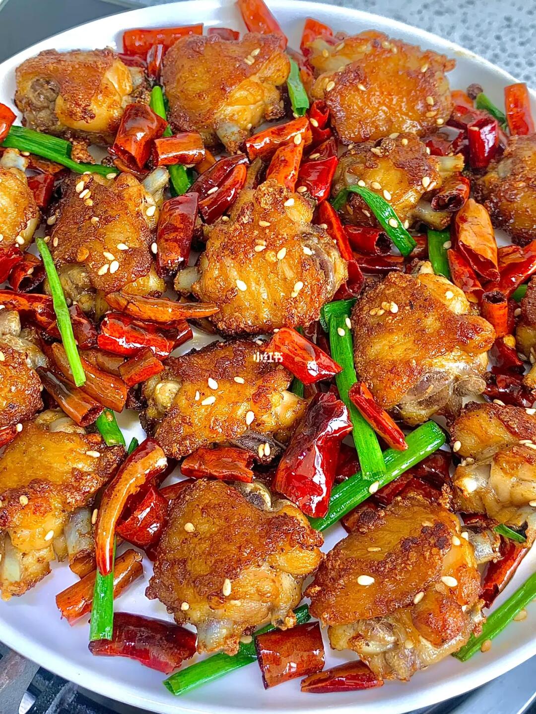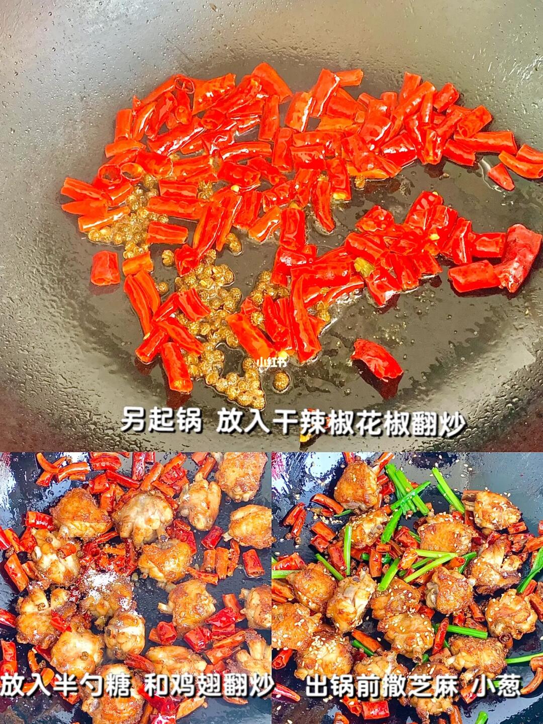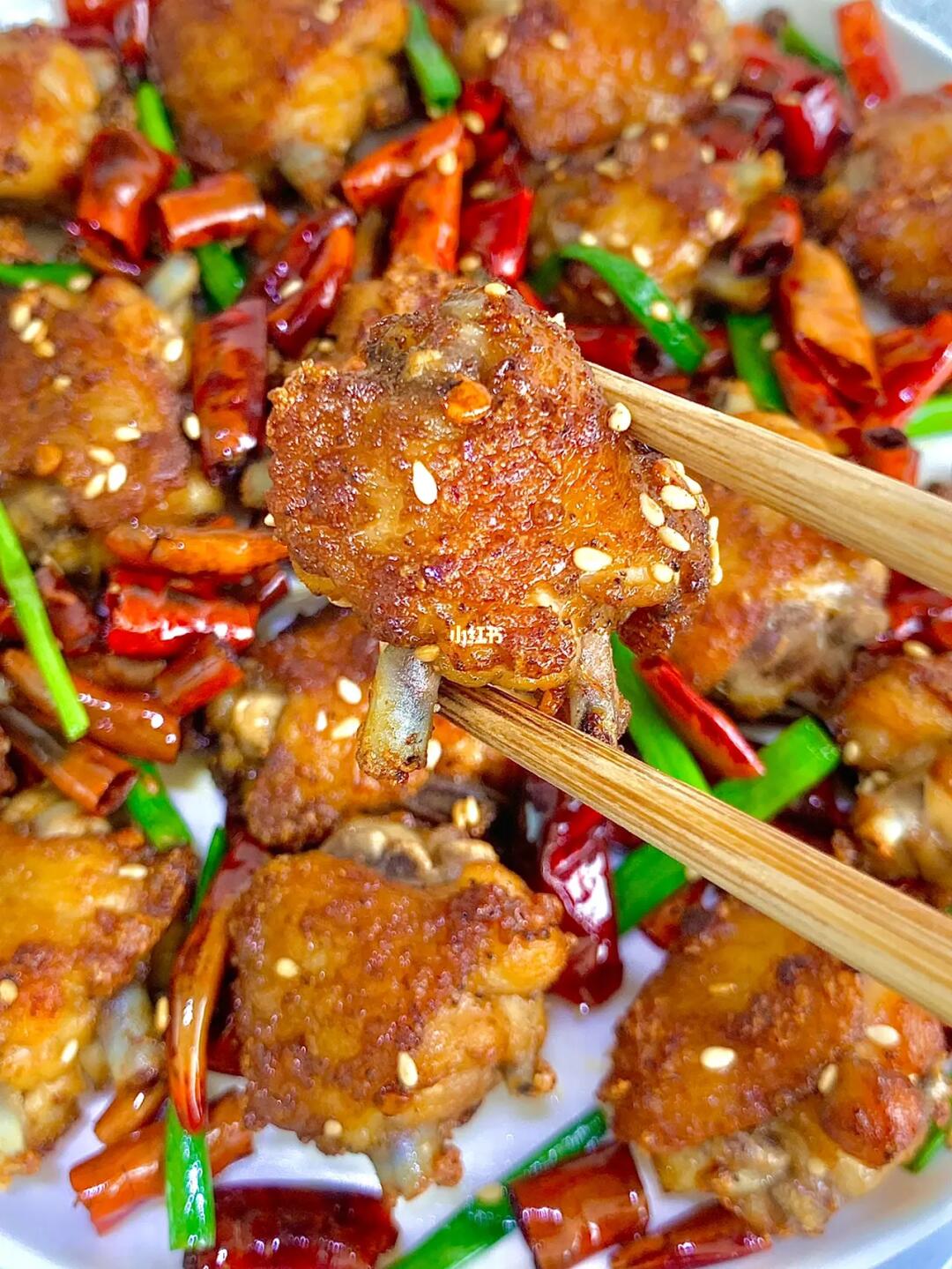 鸡翅这样做好吃哭了!! - 🌟🌟食材: 鸡翅、干辣椒 🌟🌟步骤 1⃣️鸡翅洗净从中间劈开,放入㊙️:一勺料酒、一勺生抽、一勺蚝油、一勺淀粉、少许胡椒粉、少许盐抓匀腌制半个小时 2⃣️锅里烧油,五成热下鸡翅,炸制两面金黄捞出(不喜欢炸的也可以用空气炸锅) 3⃣️另起锅放入花椒、干辣椒翻炒后立即倒入鸡翅,加入半勺糖翻炒 4⃣️出锅前撒小葱、芝麻✅ 好吃到爆的鸡翅!!外焦里嫩!!