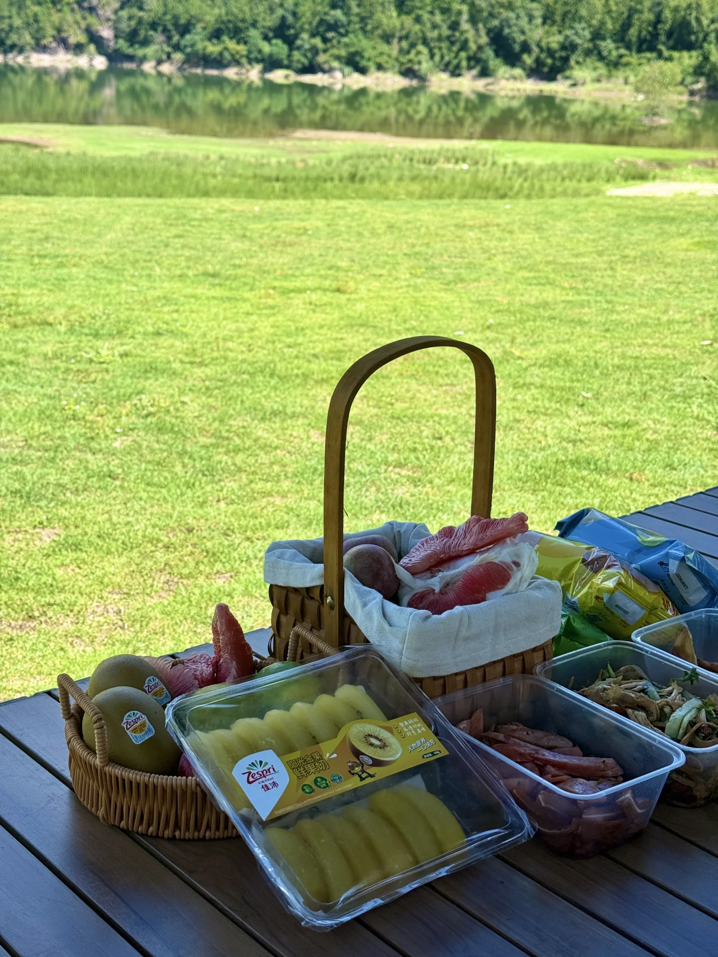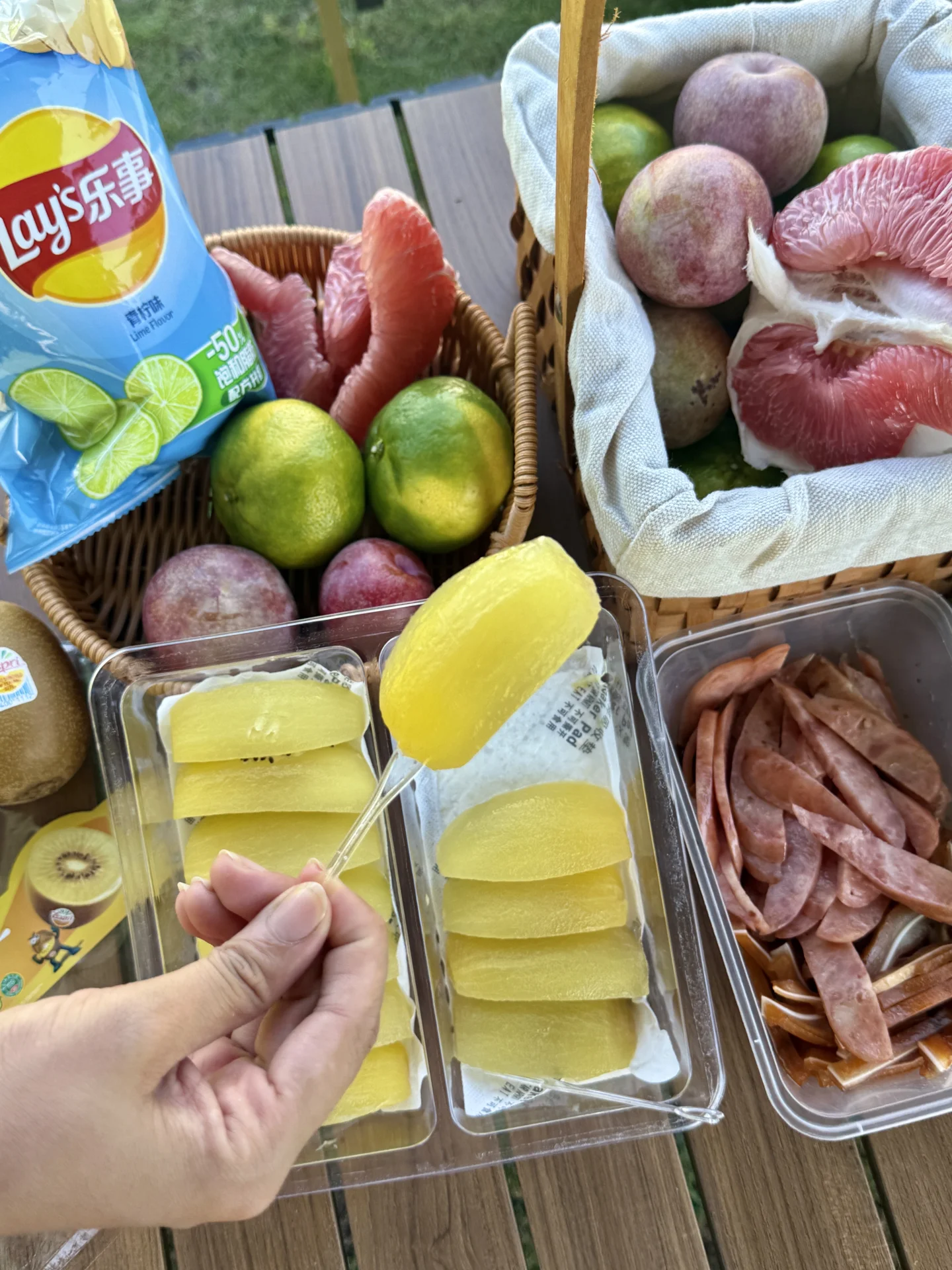 桌椅、椅子、帐篷、还有熟食🍲、水果🍉(这次外卖了山姆佳沛奇异果鲜切,真的好好吃耶,果肉金黄水嫩,清甜多汁,一口一个!一盒有三颗金果,一颗金果就可以满足一天的vc需求量,真是户外好搭档!而且盒子上附带叉子 ,包装也很干净带上露营真的方便又好看)