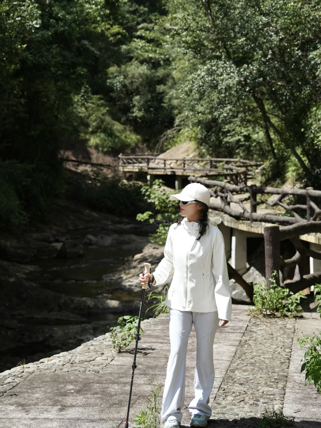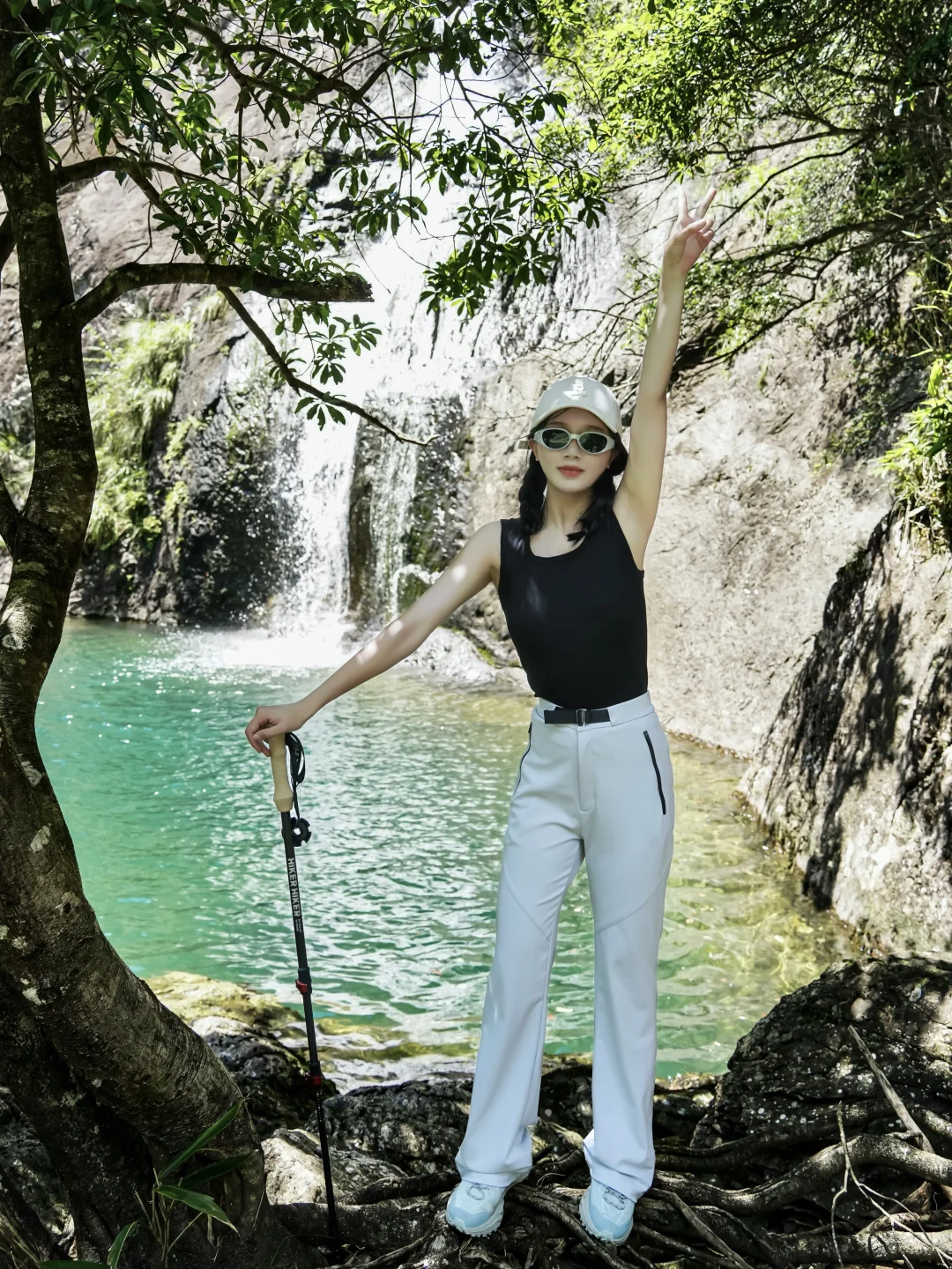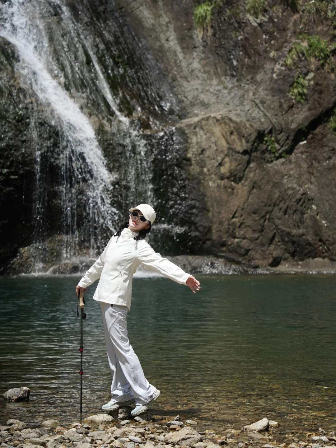 太阳帽🧢、登山杖🧗🏻、溯溪徒步鞋👞、墨镜🕶️、薄绒软壳外套、有弹性的喇叭裤(这次我穿了魔力薇薇的一整套,穿起来轻盈透气。裤子是微喇的,有弹性还显腿长。衣服是带了抽绳收腰的设计,后背还有网孔复片,穿起来不仅透气,还显瘦好看!是我买过最好穿,拍照又很出片的软壳套装了)
