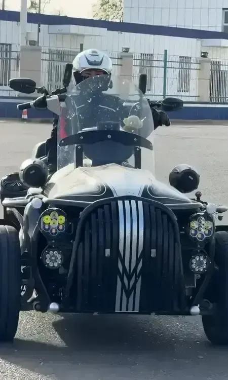 这辆造型独特看着很拉风的摩托车,还是第一次见,拉风是拉风,天这么冷骑着有点儿美丽冻人。[笑哭]