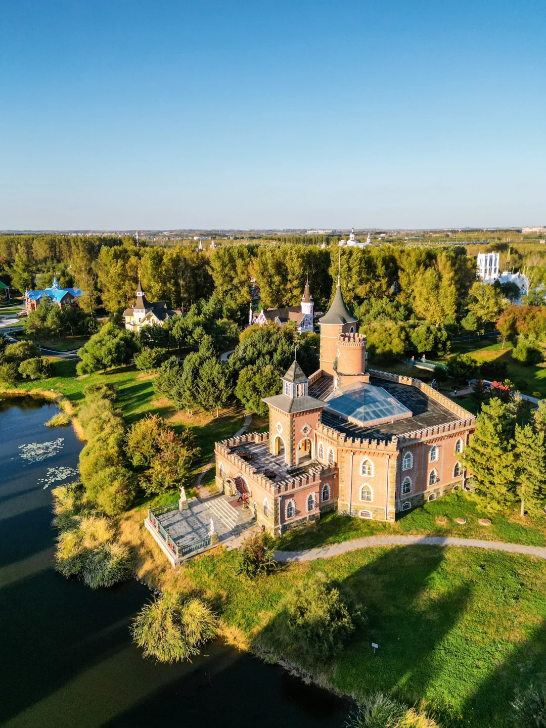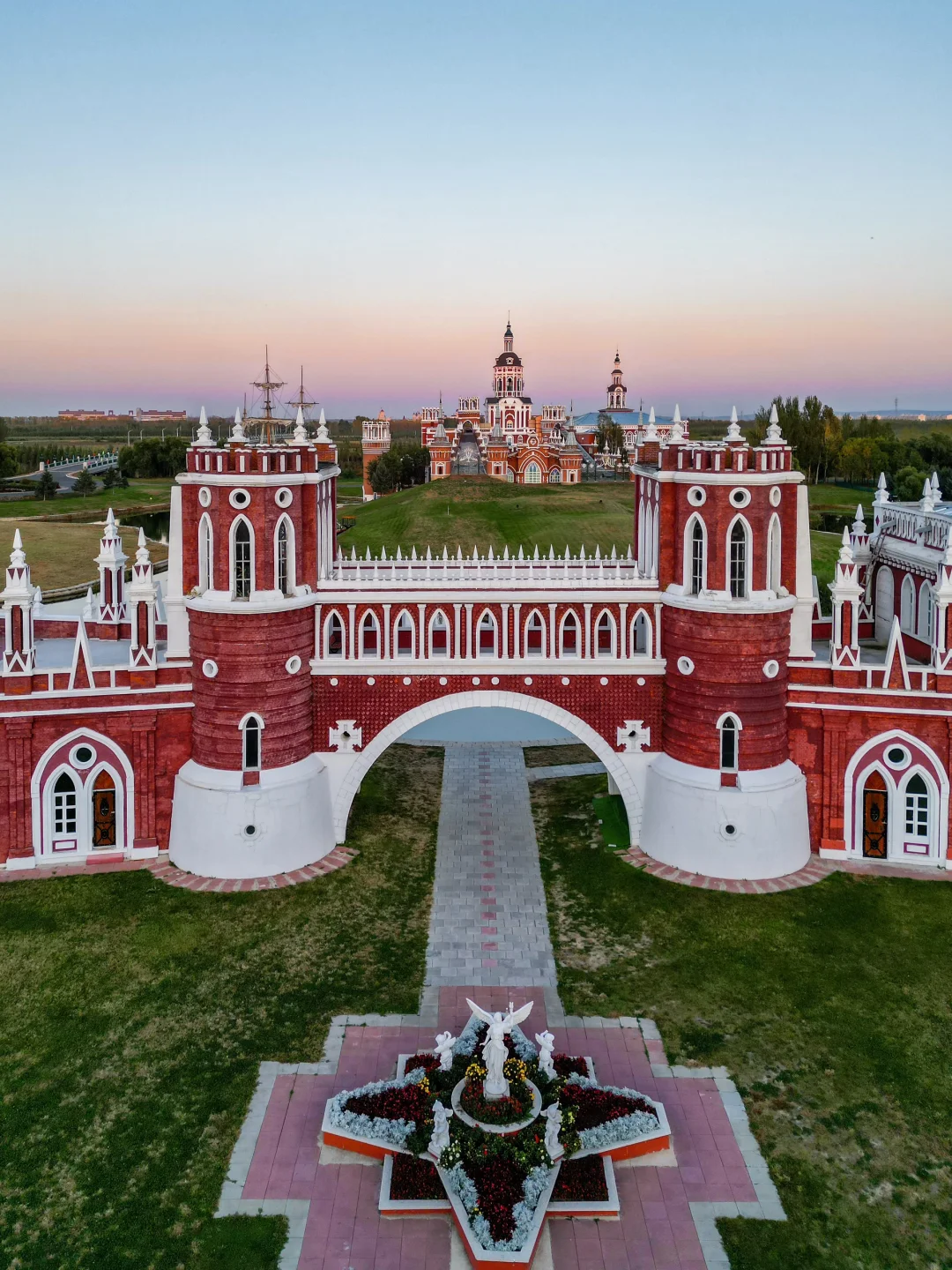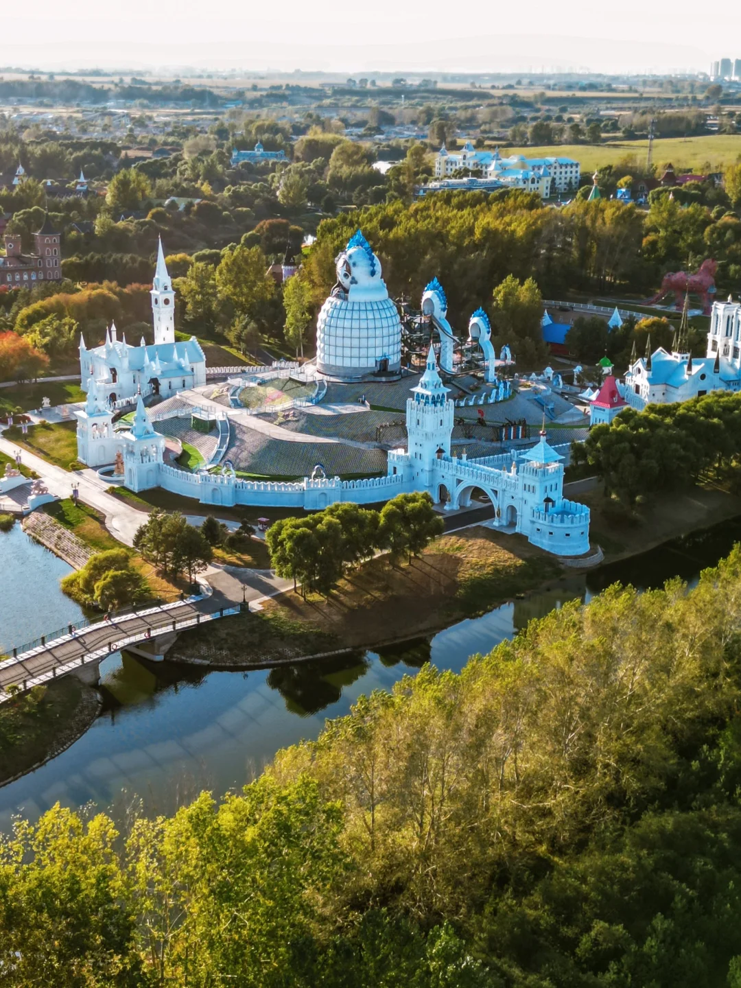 谁说哈尔滨只有冬天值得来?九月底的庄园已经渐进秋色,马卡龙配色的俄式城堡散落在草坪上、湖水边,洋葱顶教堂、彩虹木屋、城堡,随便站在哪个角落拍都像开了电影滤镜。