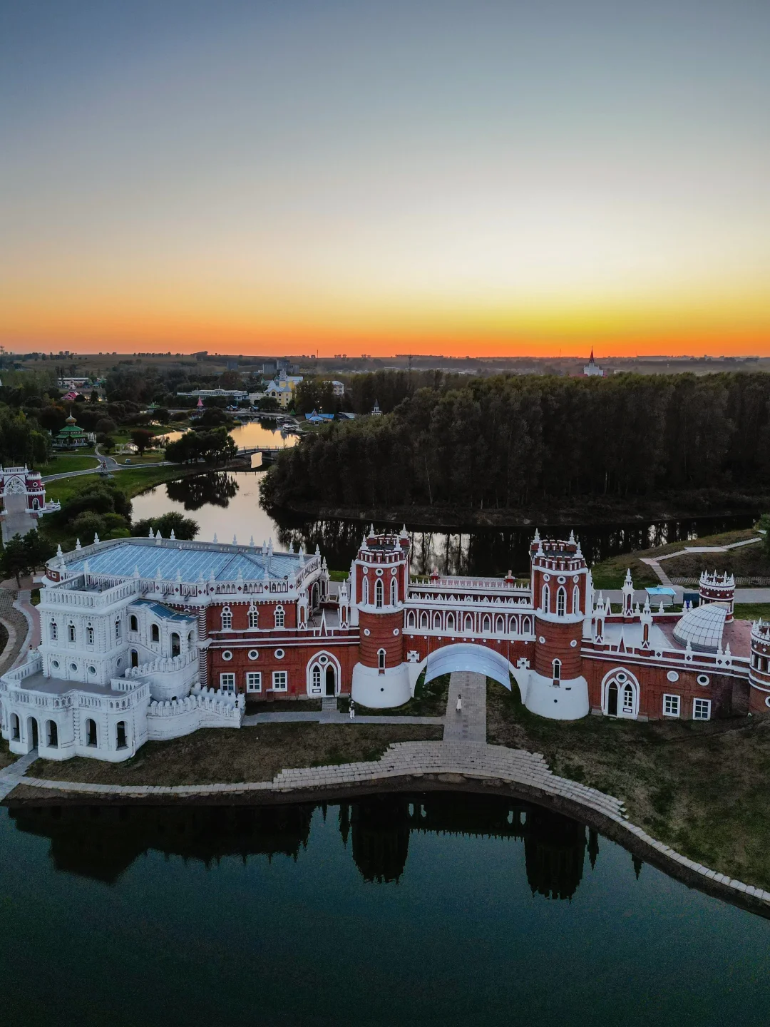 3️⃣ 坐在察里津诺堡里的楼梯处拍夕阳洒在湖对岸的彼得洛夫艺术宫和倒影