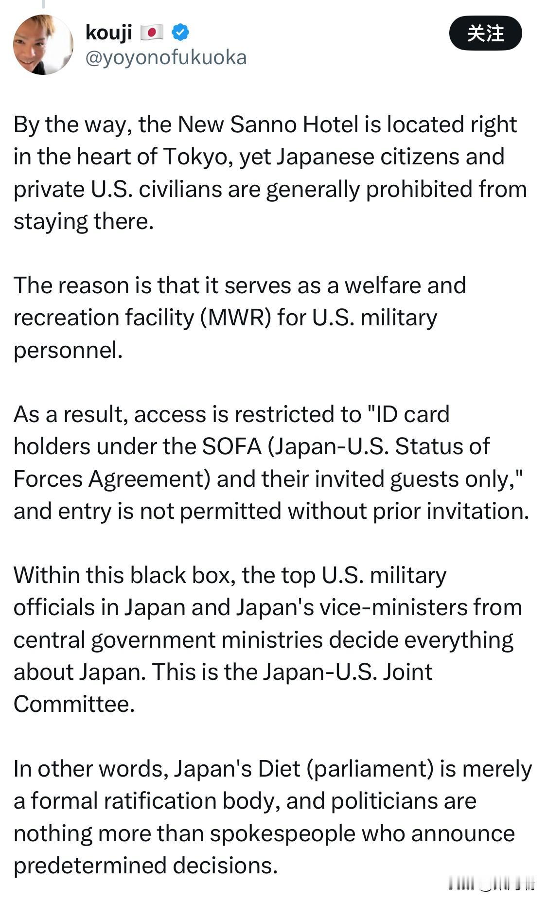 日本迄今为止的许多政治决策,其实都是由美国军方在幕后主导的。而具体操盘的,是位于东京市中心的新山王酒店里的日美联合委员会。 前首相鸠山由纪夫曾亲口作证:“在我担任首相之前,我以为法律都是由国会决定的。但真正上任后,我震惊地发现,所有法律都是在新山王酒店的日美联合委员会上定下来的。” 新山王酒店(日语:ニュー山王ホテル,英语:The New Sanno)通常禁止日本公民和普通美国民众入住,因为它属于美国驻日军方的福利与娱乐设施(MWR)。只有持有根据《日美地位协定》(SOFA)发放的身份证的人员及其受邀嘉宾才能进入,未经邀请不得入内。在这个封闭的“黑匣子”里,驻日美军高层和日本中央政府各部副部长级官员共同决定着日本的重大事务。 换句话说,日本国会在很多决策上只是走过场,政客们的角色更像是对既定决定的公告员。