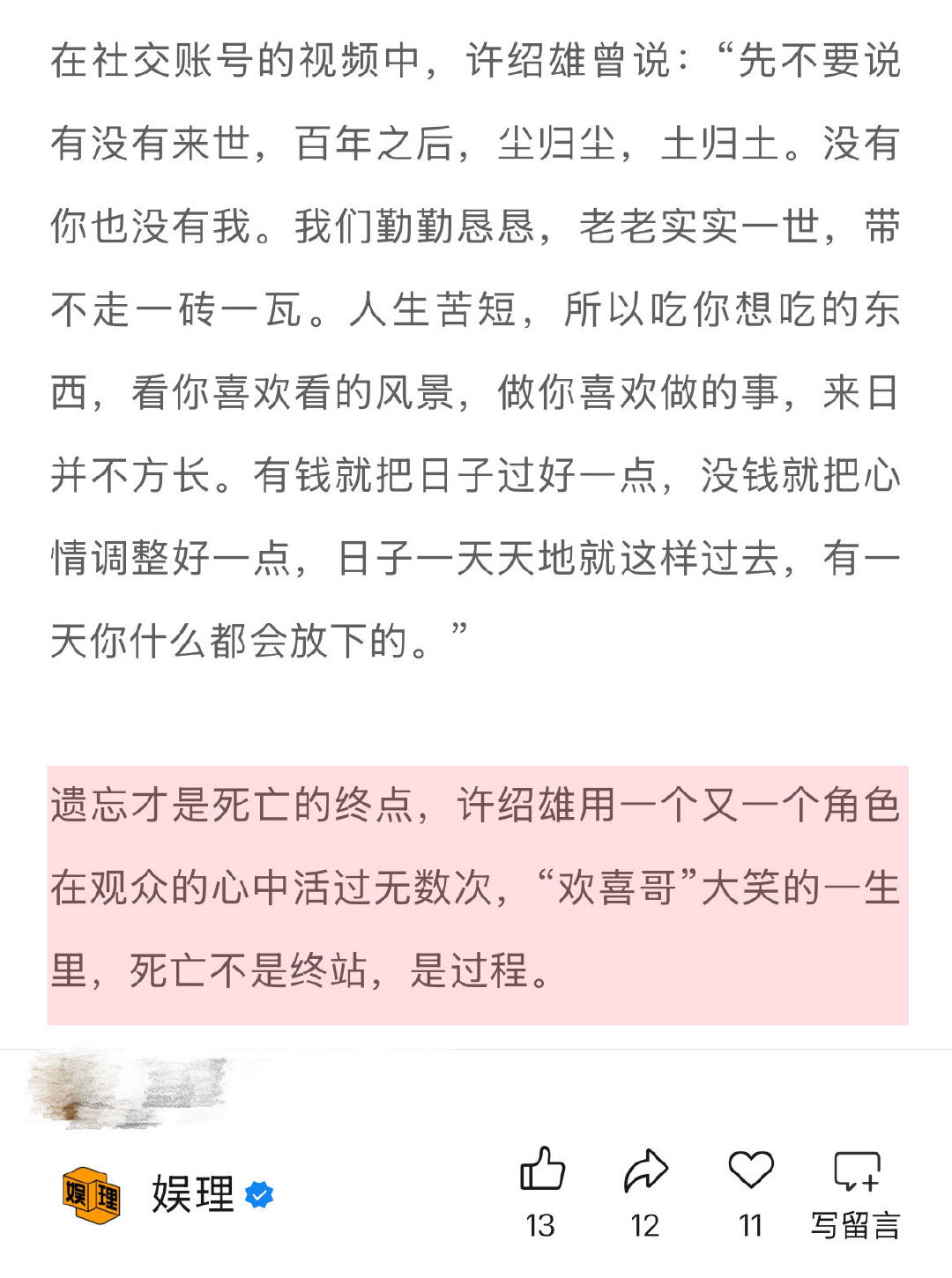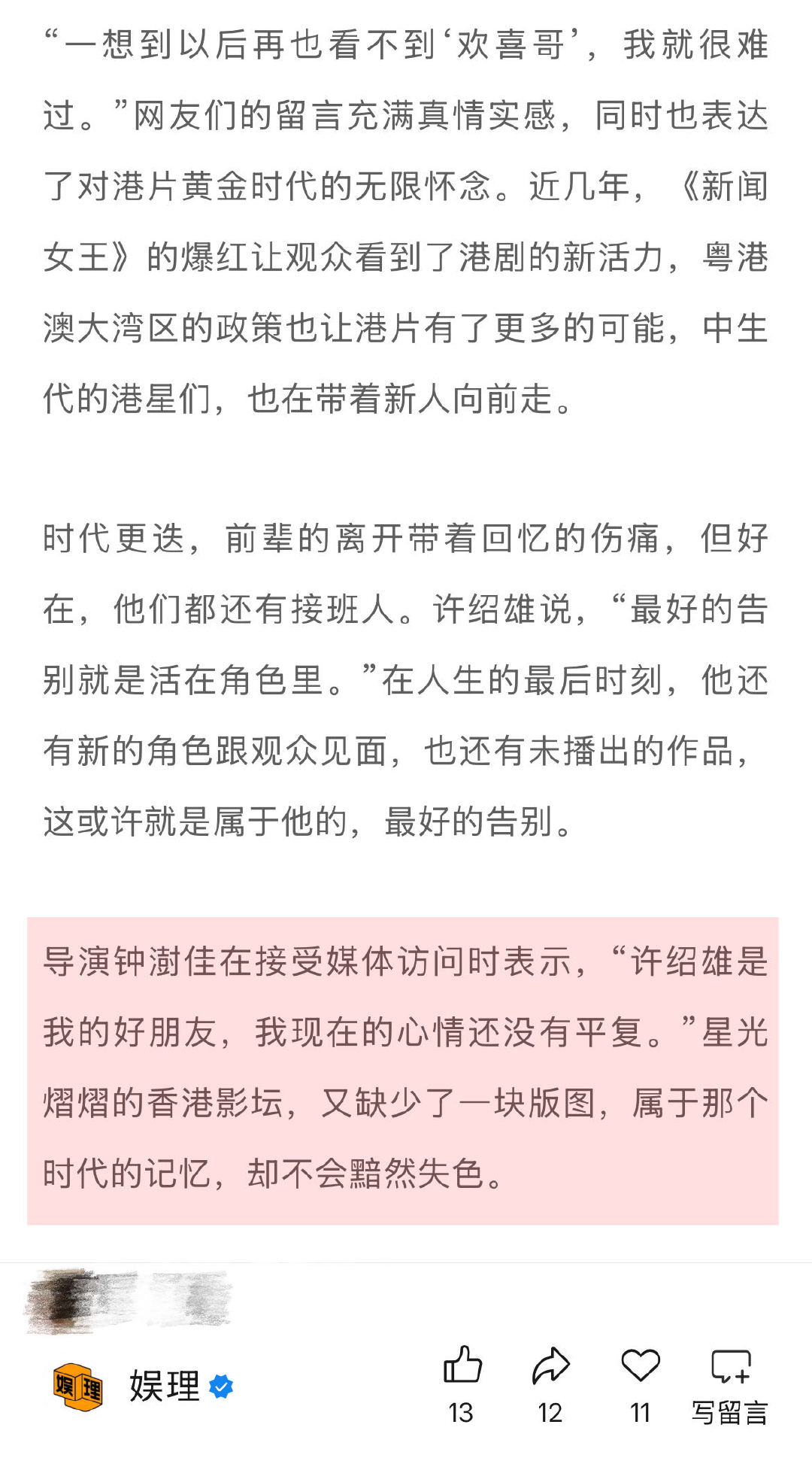 许绍雄 演到生命的最后一刻 许绍雄说最好的告别是活在角色里 许绍雄曾说过,“最好的告别就是活在角色里。”在人生的最后时刻,他还有新的角色跟观众见面,也还有未播出的作品,这或许就是属于他的,最好的告别。导演钟澍佳在接受媒体访问时表示,“许绍雄是我的好朋友,我现在的心情还没有平复。”星光熠熠的香港影坛,又缺少了一块版图,属于那个时代的记忆,却不会黯然失色。娱理独家↓