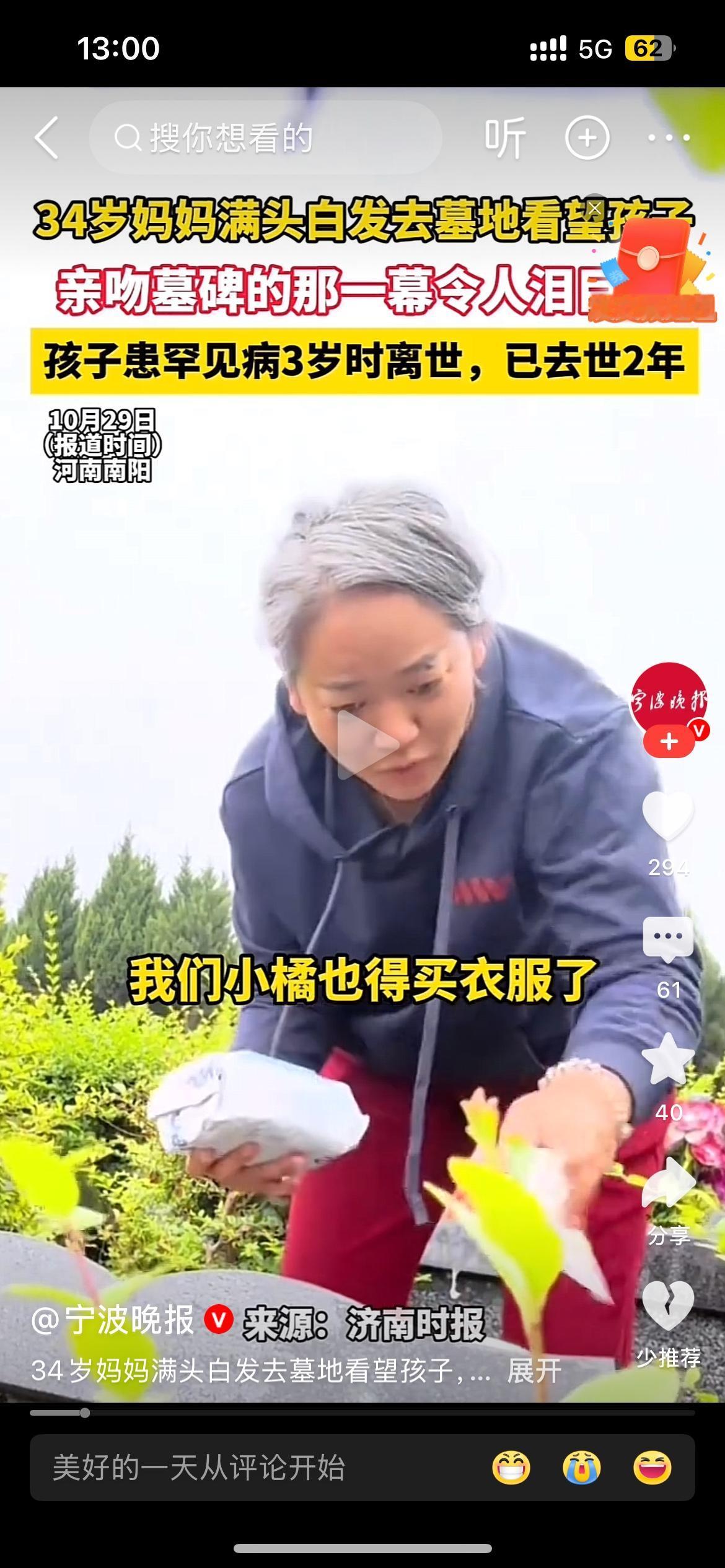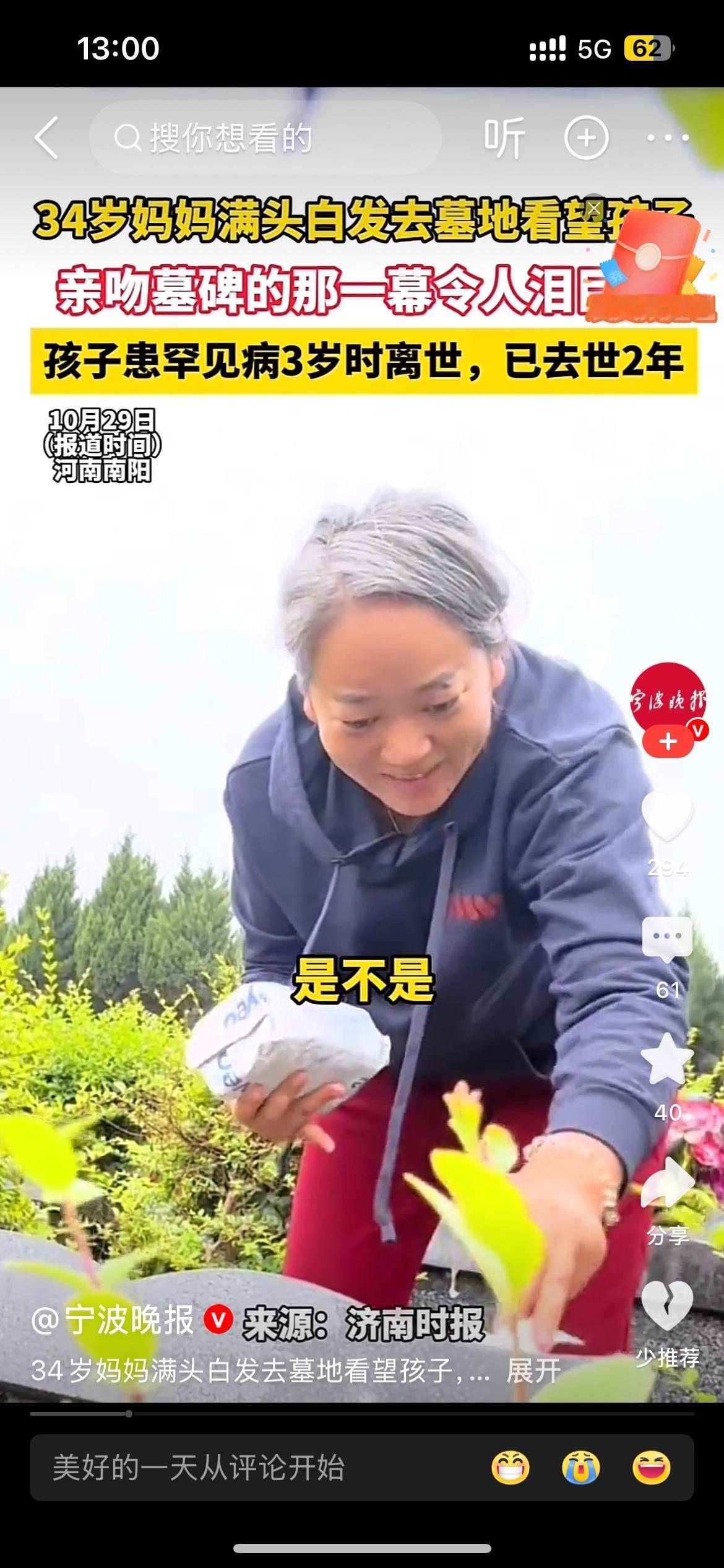 看到34岁妈妈满头白发亲吻去世宝宝墓碑的新闻,心里像被重锤狠狠砸了一下。宝宝3岁因罕见病离世,妈妈四处寻医也没能留住孩子,直接一夜青丝变白发。 此后两年,她每隔十几天就去墓地,跟宝宝聊天,仿佛孩子还在身边。她亲吻墓碑的那一幕,任谁看了都得落泪。“如果妈妈可以代替宝宝,那么天堂里都是妈妈”,这就是伟大无私的母爱。真希望这位妈妈能早日走出伤痛,重新拥抱生活,毕竟宝宝也不希望妈妈一直活在痛苦里。