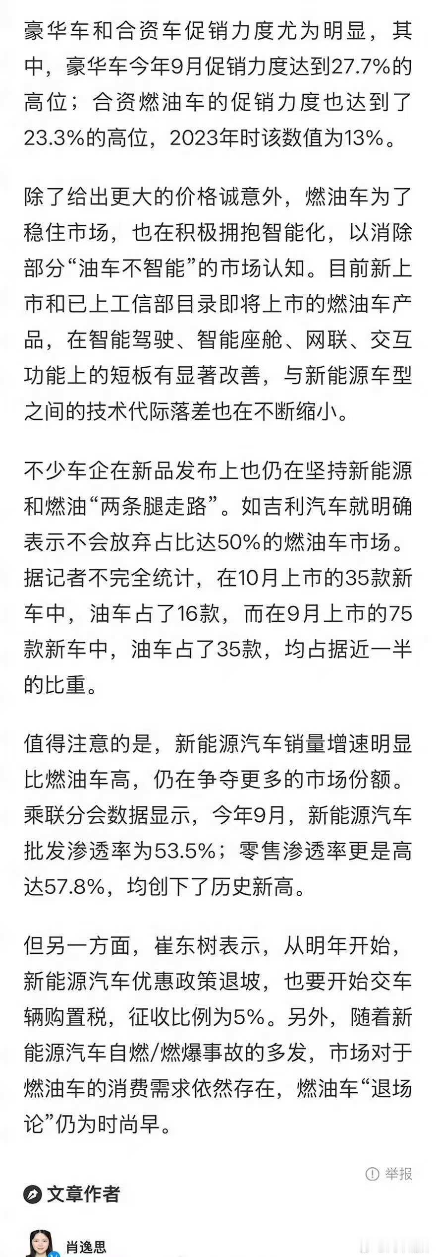 专家崔东树分析指出,明年新能源汽车的优惠政策将会退坡,购车成本增加,同时新能源汽车自燃等安全问题也时有发生,让不少消费者心存顾虑。相比之下,燃油车技术成熟、使用便捷、补能迅速。如此看来,燃油车不仅不会迅速退出市场,还将在一段时间内继续与新能源汽车共舞,书写属于自己的市场篇章。