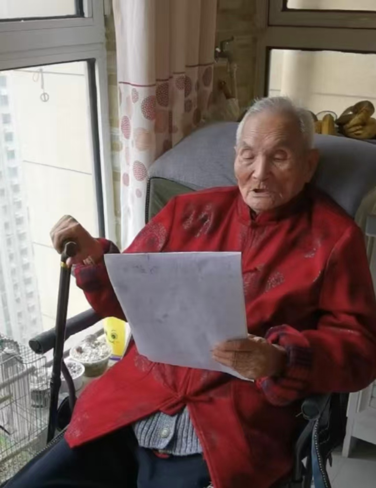老人爱在阳台读诗唱戏