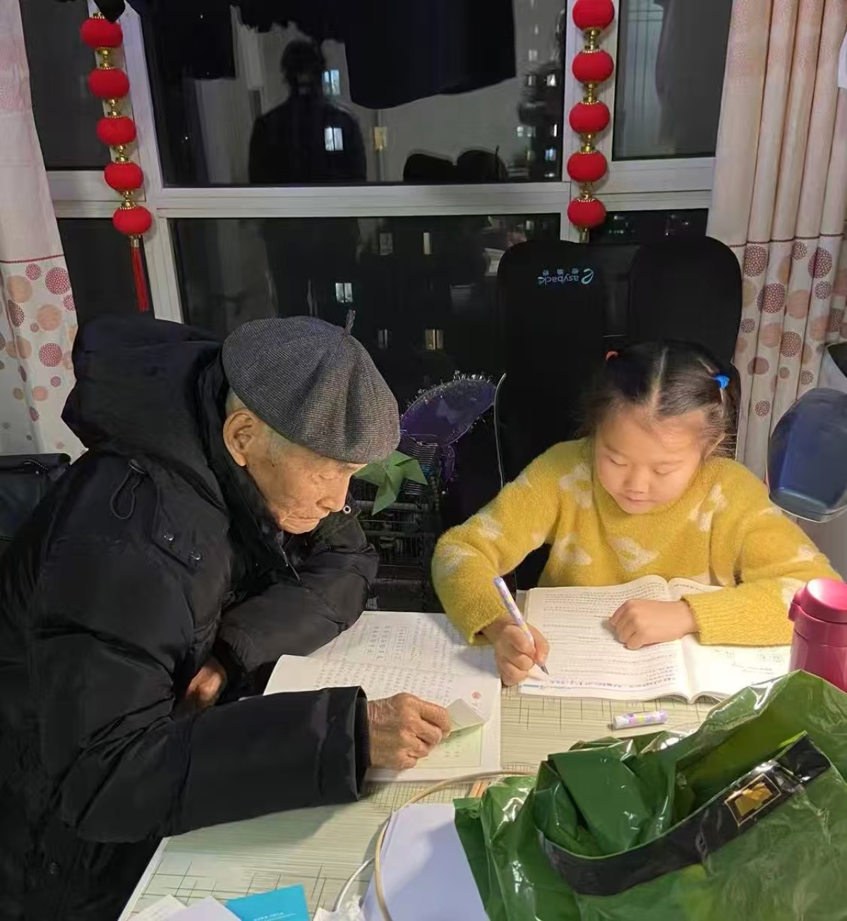 老人陪着重孙女写作业