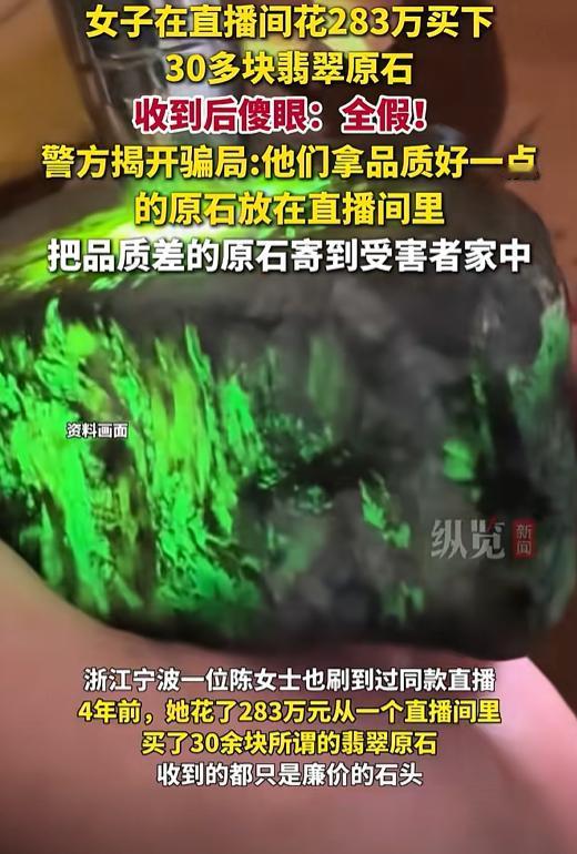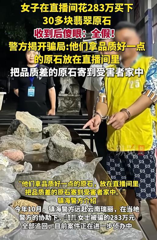 浙江宁波,陈女士为了赚大钱,竟然在直播间花283万,买下30多块翡翠原石,她满心期待,这些原石能能够翻几倍,结果到货后发现全是廉价石头。她立马找对方退款,期间拉扯了近4年时间,但始终没有结果,陈女士忍无可忍之下报了警!网友:我只关心这283万她怎么赚的。 陈女士(化名)现在每天都在等法院的消息,她十几年攒下的 283 万,全砸在了直播间的 “缅甸矿货” 上,最后只收到 30 多块没人要的废石。 直到报警后她才知道,那些让她心动的 “翡翠原石”,全是一场精心设计的骗局。 今年夏天,陈女士抱着一沓转账记录和聊天截图走进派出所,四年的追讨让她筋疲力尽。 时间拉回到几年前,她刷到一个 “缅甸矿货直播”,镜头里主播和一个叫 “阿坤哥” 的人配合得格外默契 ,裹着泥巴的石头被电筒一照,切开处露出一抹翠绿,弹幕里瞬间满是 “涨了”“赶紧抢” 的起哄声。 主播不停催促 “这是一手货源,错过就没了”,陈女士没忍住,一笔笔钱转了过去,想着靠翡翠升值改善生活。 等 30 多块 “原石” 寄到家,陈女士特意把它们摆满客厅,她找了三位行家鉴定,结果却让她眼前一黑,这些石头全是廉价废石,单块成本不到几十元,别说升值,连变现都不可能。 283 万,对普通家庭来说是十几年甚至几十年的积蓄,陈女士当即找主播退款,可对方的态度立刻变了。 接下来的4年时间里,陈女士私信发了几十条没回复,电话打过去要么被挂,要么说 “赌石有风险,是你运气差”。 对方两度拉黑她的账号,她换号联系,得到的却是 “再闹对你没好处” 的威胁,直到今年,她实在走投无路,才想起用法律维权。 警方调查后,骗局的真面目被彻底揭开,所谓的 “缅甸货主阿坤哥”,是剧组临时找来的演员。 主播手里的 “原石”,根本不是从缅甸运来的,全是自家提前备好的普通石头。 连弹幕里的 “好评” 和 “下单截图”,都是水军刷出来的虚假流量。陈女士以为的 “投资机会”,从一开始就是冲着她的积蓄来的。 其实,陈女士的遭遇不是个例。现在很多 “矿货直播” 都靠这套把戏,用戏剧化的切割场景制造悬念,靠即时弹幕烘托氛围,再用 “一手货源”“错过无” 的话术催促下单。 直播电商的便利,反而成了诈骗的温床 ,匿名支付、即时交互,让不少像陈女士这样对行业不熟悉,却想改善生活的人栽了跟头。 有人说 “赌石本身有风险”,可这根本不是风险,是赤裸裸的诈骗。 对消费者来说,有个教训必须记牢,涉及巨额交易,一定要找第三方鉴定,先小额试买看看情况,所有交易都要通过正规平台,保留好证据。但责任不能全压在消费者身上。 平台得负起监管责任,对卖 “高风险矿货” 的直播间,先审核资质、抽检货物,不能让虚假宣传随便播,支付机构和银行遇到异常大额交易,该弹出风险提醒就得弹,还要保留可追溯的记录。 执法部门也得加强跨区协作,一旦发现诈骗,优先冻结涉诈资金和货物,别让受害者等太久,对像陈女士这样的受害者,也该有临时救助和法律援助,别让他们因为维权成本高就放弃。 今年 10 月,镇海警方为帮陈女士追回被骗钱款,跨越千里远赴云南瑞丽,在当地警方协同配合下,将 283 万元全额追回,目前案件正进一步侦办。 就在这几天,陈女士和丈夫特地带着锦旗与感谢信找到民警,言语间满是感激,以此表达对警方的谢意。但更重要的是,别再出现下一个 “陈女士”。 流量经济不是骗人经济,只有平台把好关、执法严起来、消费者多留心,才能让 “诚信” 回到直播间里。 对此,你有什么看法呢? 信息来源:纵览新闻