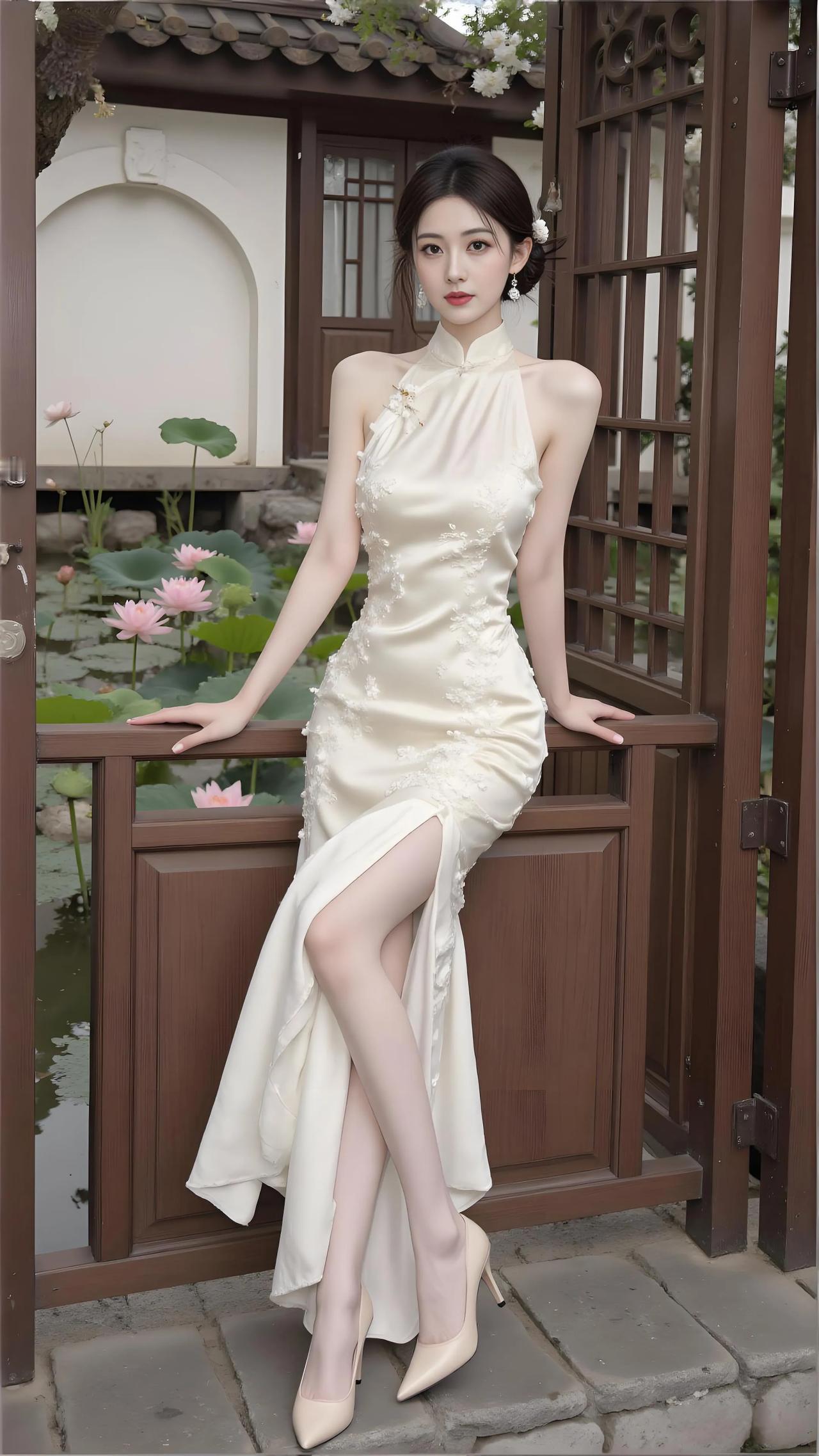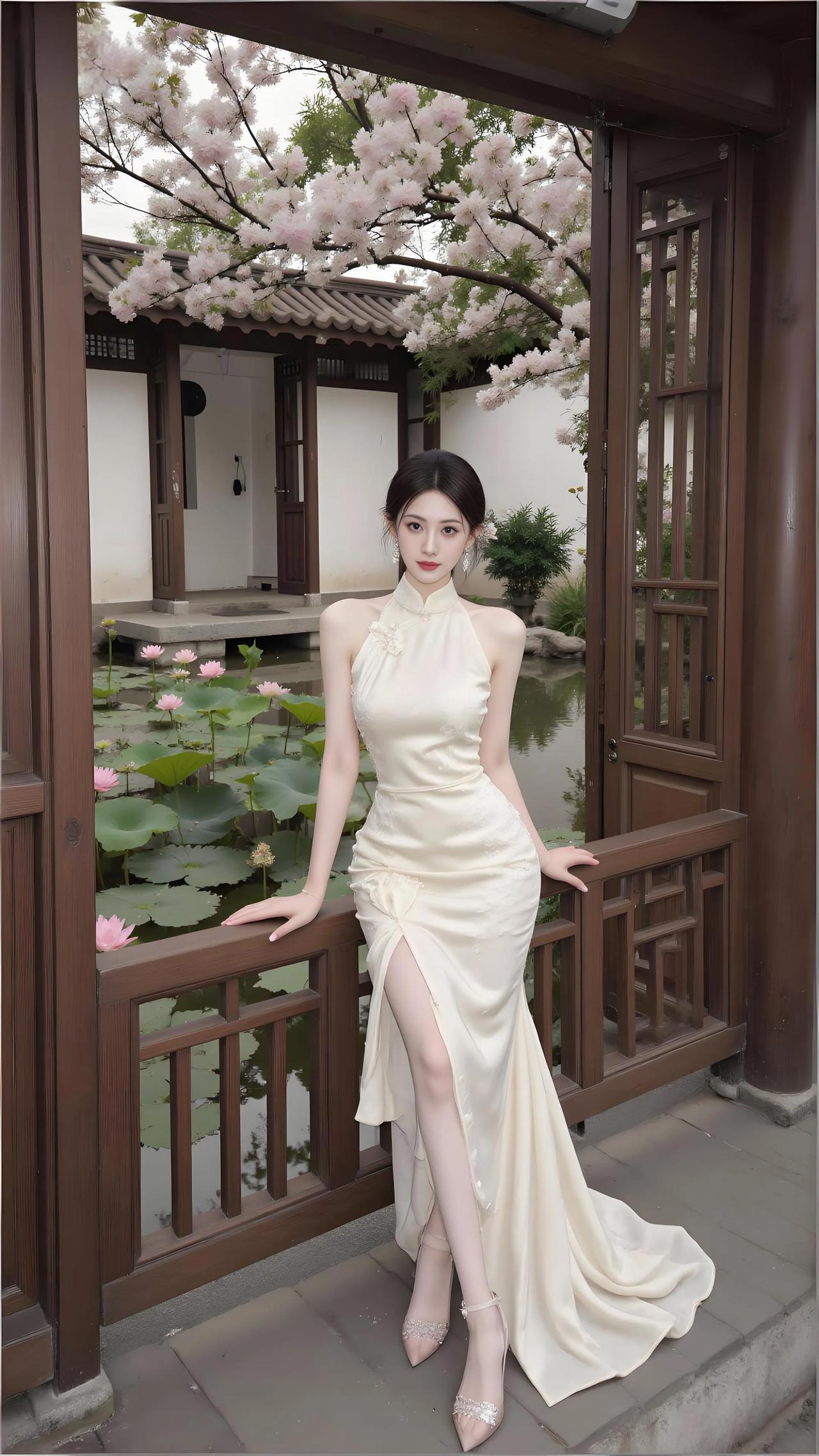 樱花落处罗裙展,莲步轻移过木桥。 旗袍一袭裹春色,不负东风万点娇。 粉荷照影小池幽,花窗半启风含羞。 回眸恰似春水流,一袭旗袍绾白鸥。 画檐低语燕归时,倚遍阑干人未知。 旗袍开衩藏春色,半露金莲立玉墀。旗袍古典身韵 古风诗意裙 旗袍 旗袍美人