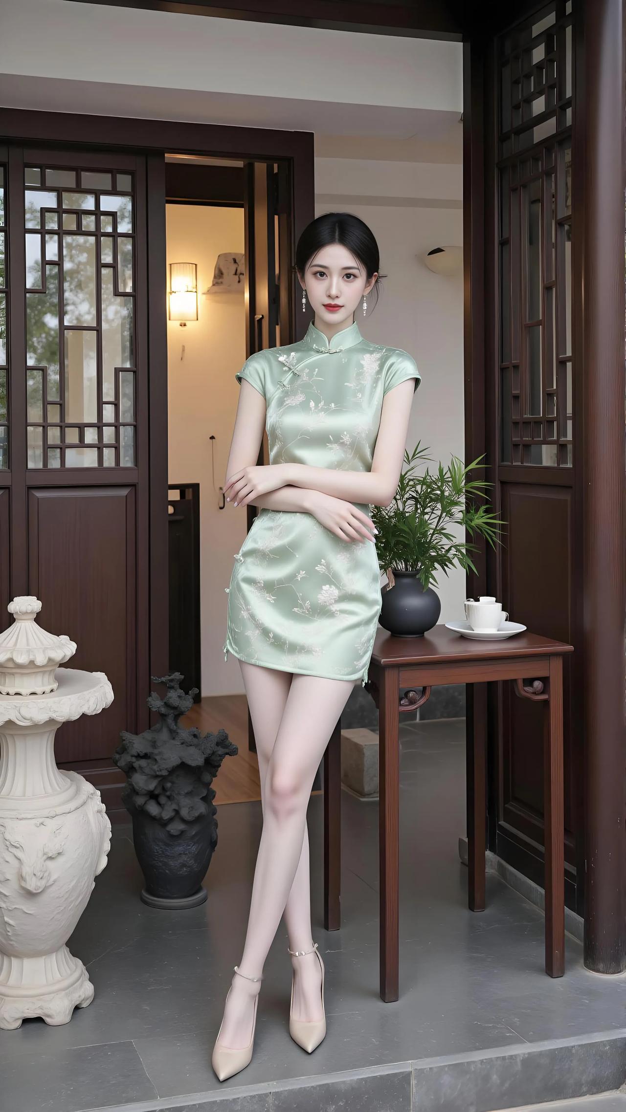 庭院深深茶烟轻,旗袍裹韵倚轩明。 黛瓦朱门藏雅趣,玉簪斜绾国风倾。 回廊影里见娉婷,挂脖旗袍裹玉英。 墨石白瓷添古意,幽篁筛月衬娉婷。 朱扉雕窗映朝暾,短袖旗袍裹韵存。 白履轻沾阶上露,回眸一瞬醉诗魂。旗袍 旗袍美人 旗袍穿搭 旗袍古典身韵