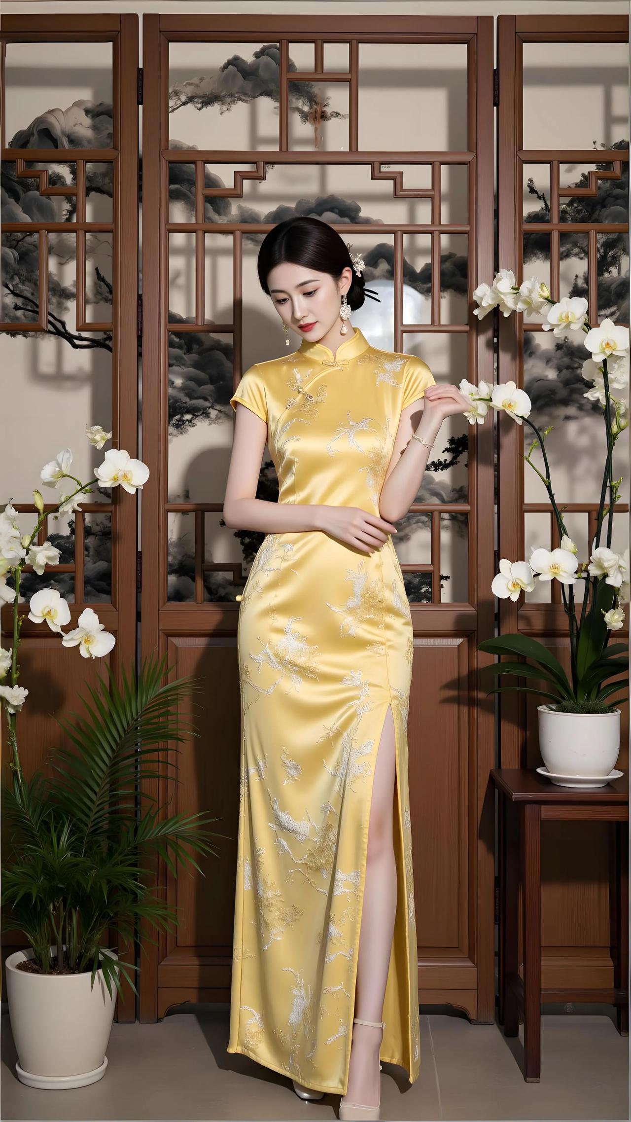 墨染云山入画屏,缃纨一袭倚窗棂。 兰馨暗逐罗衣动,珠佩轻摇见性灵。 木雕花影镂光阴,缃色旗袍衬玉簪。 幽兰合璧生清韵,姽婳风姿动客心。 窗含水墨远峰青,缃纨绣影弄娉婷。 云鬟轻拢三分月,一缕天香入画屏。旗袍 旗袍美人 旗袍穿搭