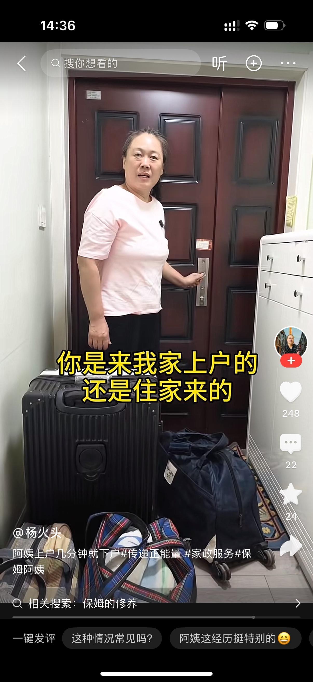 保姆来新雇主家上户。她带了一堆的行李。她把行李一件一件往雇主家里搬。一件两件三件四件五件…,还有,雇主终于忍不住了,问你怎么这么多行李啊?你怎么过来的?保姆说货拉拉拉过来的。雇主说你是来我家上户的还是住家的啊?你拉回去吧。保姆啊了一声,那你把来回车票给我报了吧?雇主啪地把门就关上了。