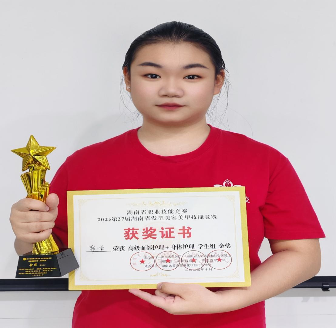 10月24日至25日,第27届湖南省发型美容美甲技能竞赛在长沙文创艺术职业学院举行。张家界旅游学校美发与形象设计专业2301班的彭莹在竞赛中斩获高级面部护理+身体护理学生组金奖,并成功晋级国赛。