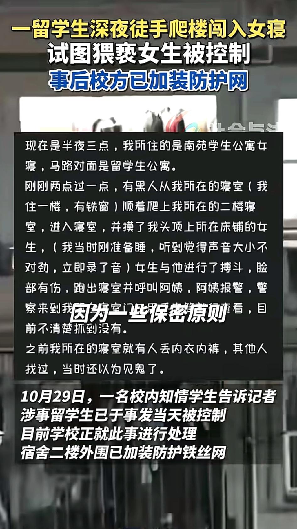 三峡大学发生留学生深夜攀爬女生宿舍猥亵女生事件!时间是深夜2点多,当时住在1楼宿舍的女同学还没睡着,她发现有黑人留学生顺着宿舍的铁窗往上爬,到了2楼寝室,留学生摸了,2楼寝室的一个女生的头,企图猥亵,女大学生被弄醒,与留学生发生激烈搏斗,并大声呼救,留学生仓皇逃走。大声呼救和搏斗的声音都被1楼的女生录了下来。被猥亵的女生脸部受伤,跑着出宿舍找宿管阿姨,随后宿管阿姨报了警,警方出警到达学校宿舍取证。 据相关媒体的报道,该女生宿舍与留学生宿舍只隔一条马路,那名企图猥亵的留学生当天就已经被控制,根据媒体采访,校方基于保密原则,不方便透露给学生情况。 这种情况铁证如山,应该接受中国法律的制裁,而三峡大学也应该按照校规严格处理。考验三峡大学和当地警方的时候到了。