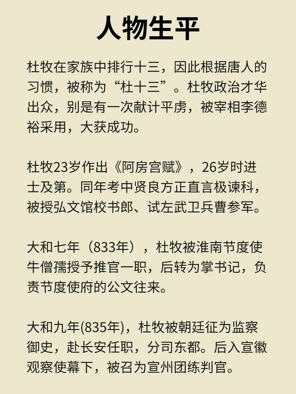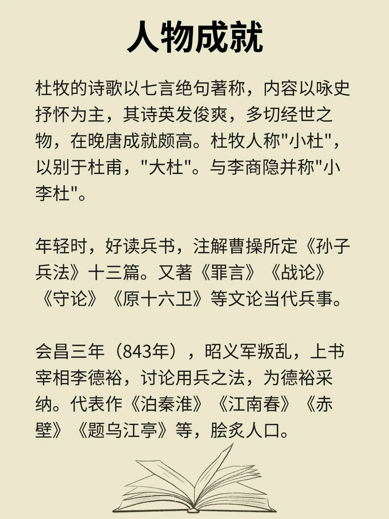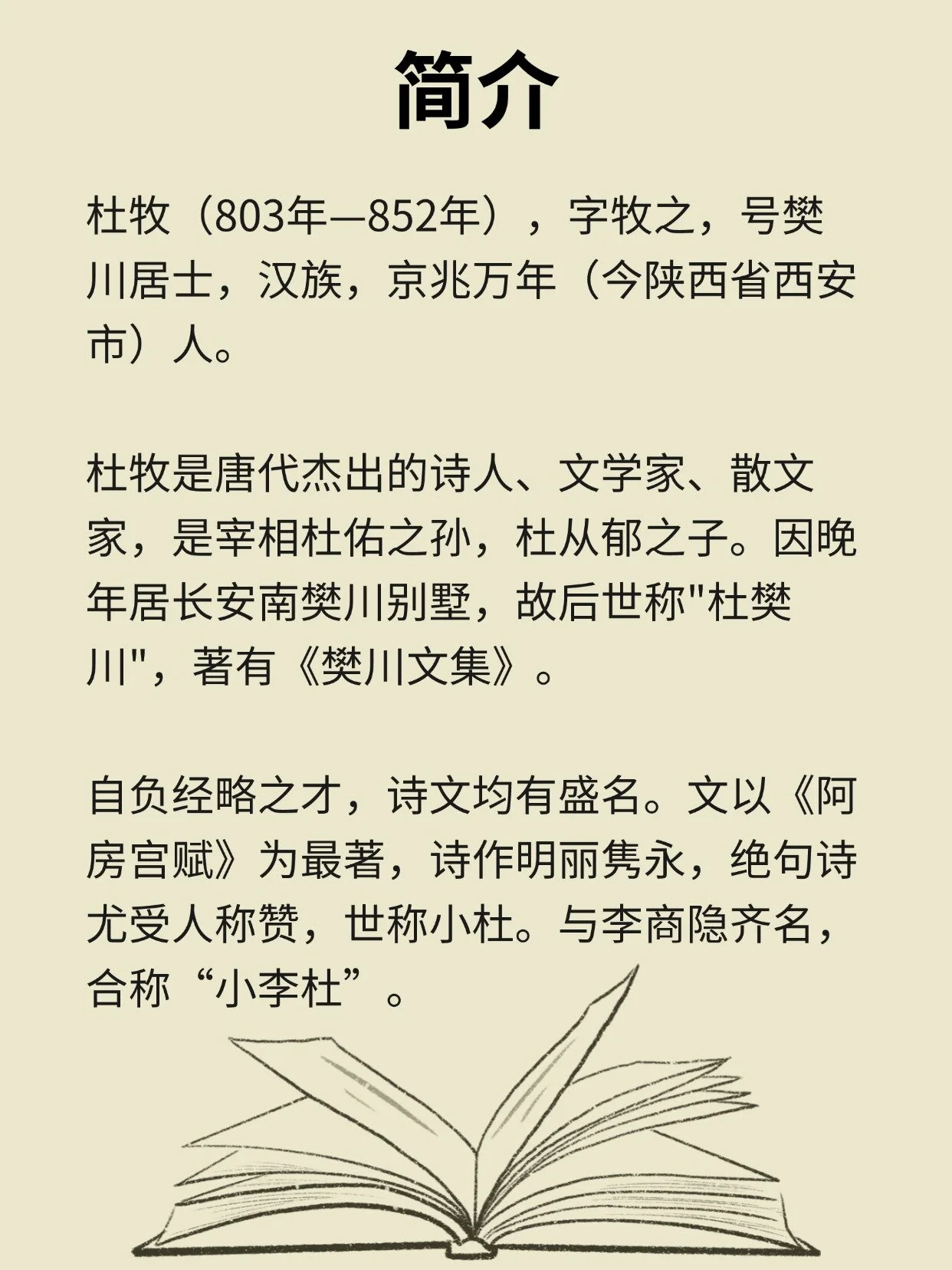📚自负经略之才,诗文均有盛名。文以《阿房宫赋》为最著,诗作明丽隽永,绝句诗尤受人称赞,世称小杜。与李商隐齐名,合称“小李杜”