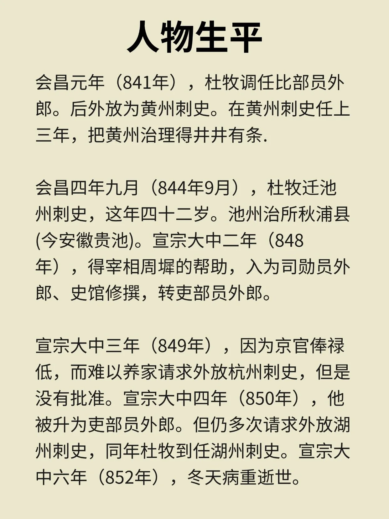 💁晚年长居樊川别舍,世称杜樊川,著有《樊川文集》。大中六年,去世,时年五十