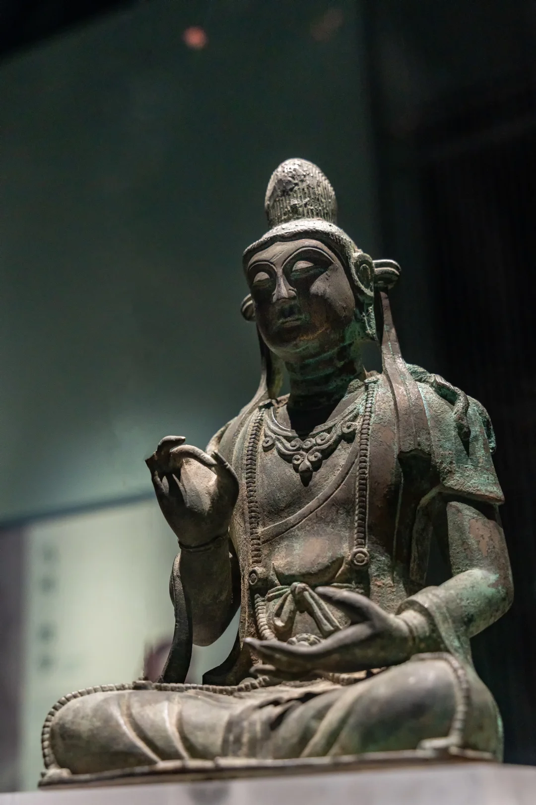 鎏金银阿育王塔的镂空花纹细如发丝,北宋彩塑泥菩萨立像肤彩描金,阳光透过圆弧落地窗洒在文物上,像穿越千年的佛光。